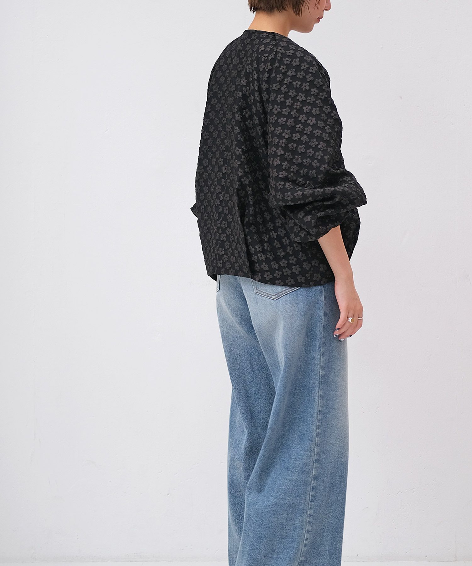 立体的な表情と適度なボリュームスリーブが華やかな印象に。