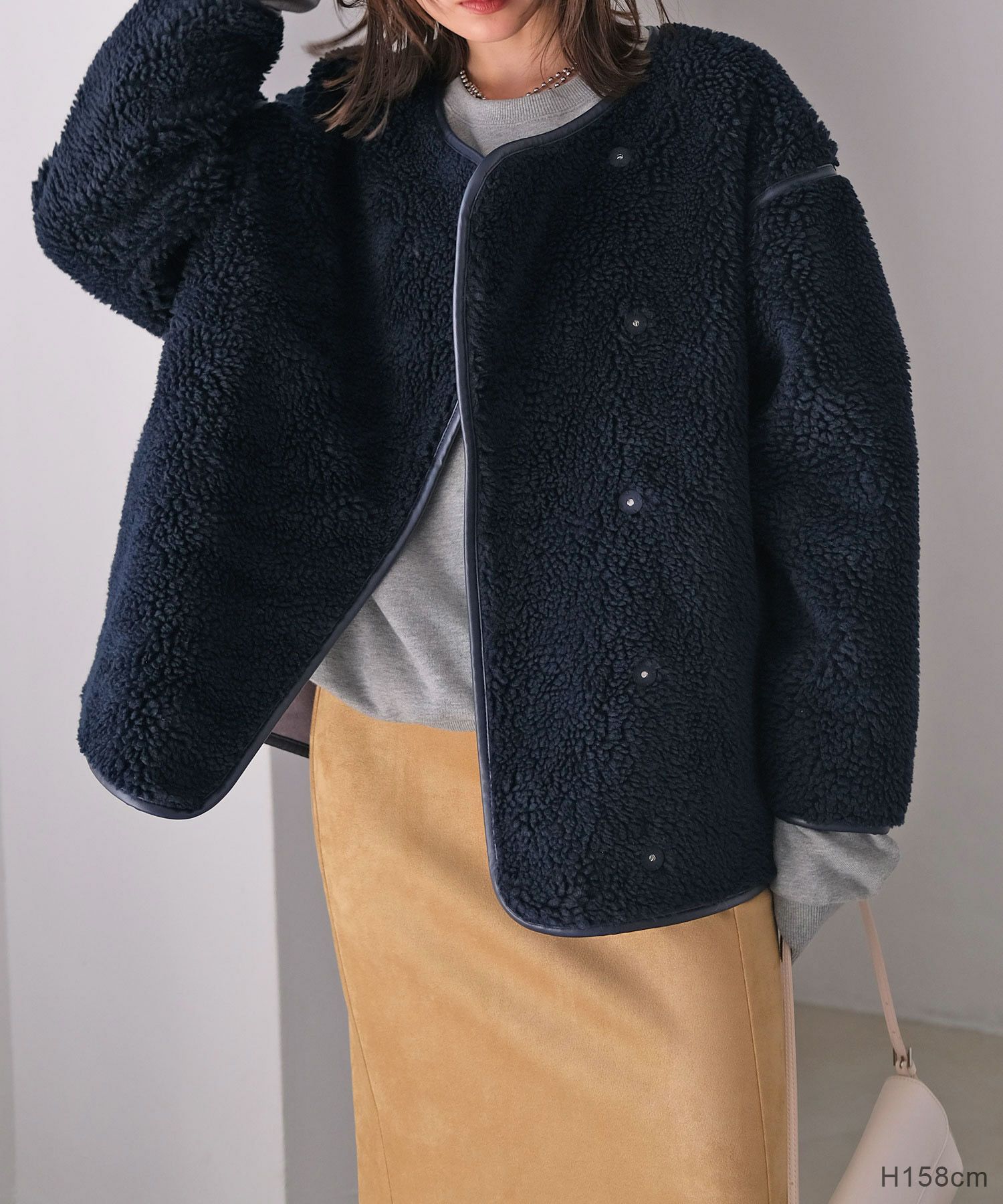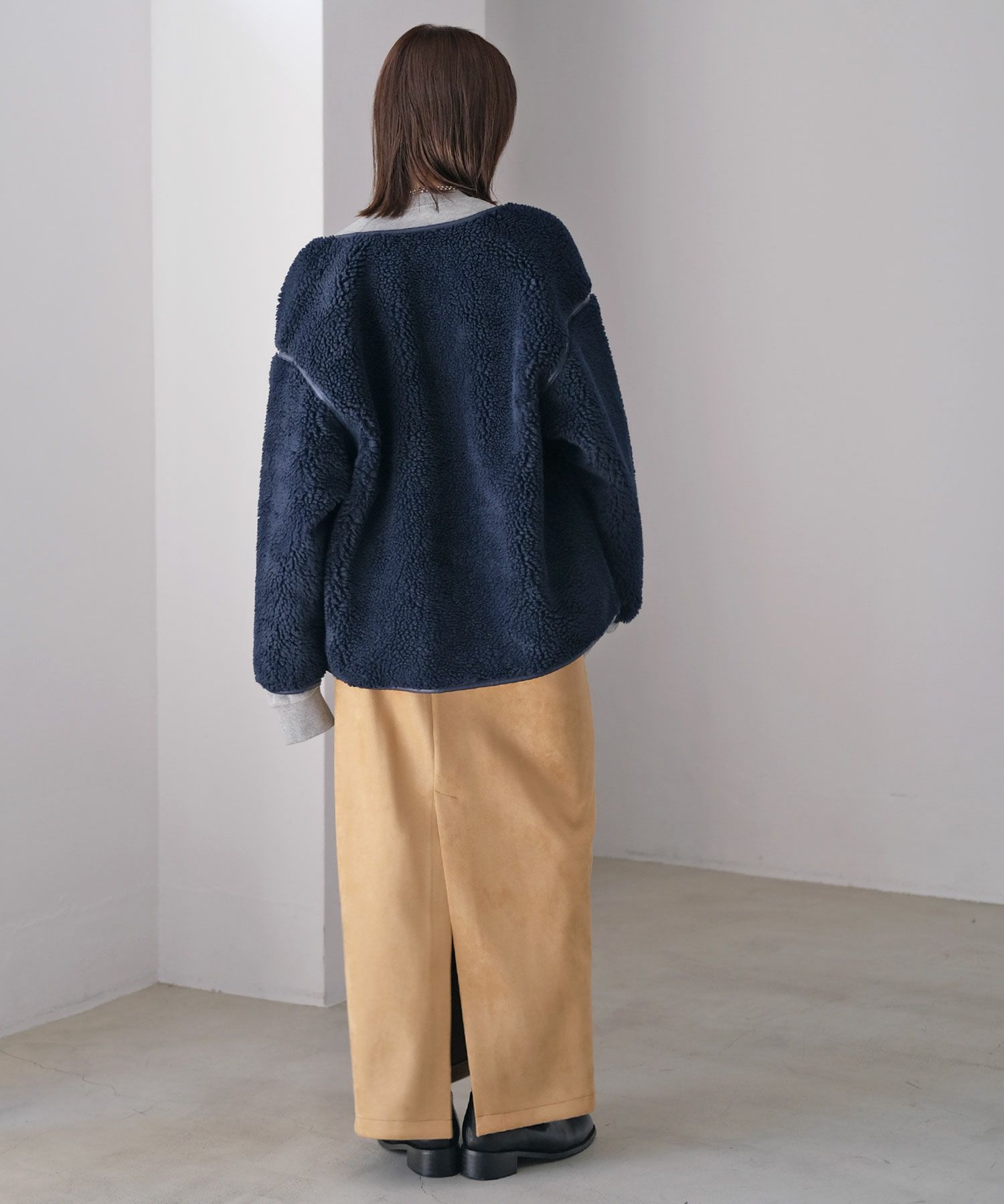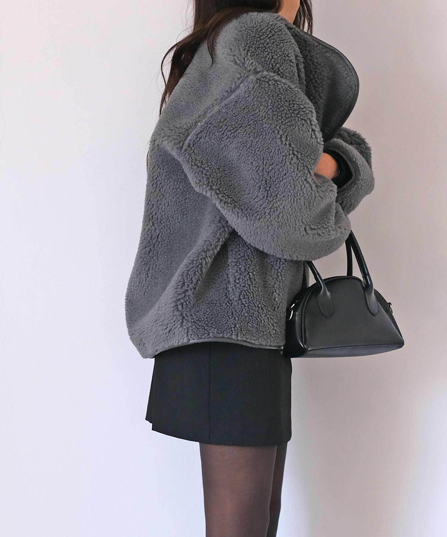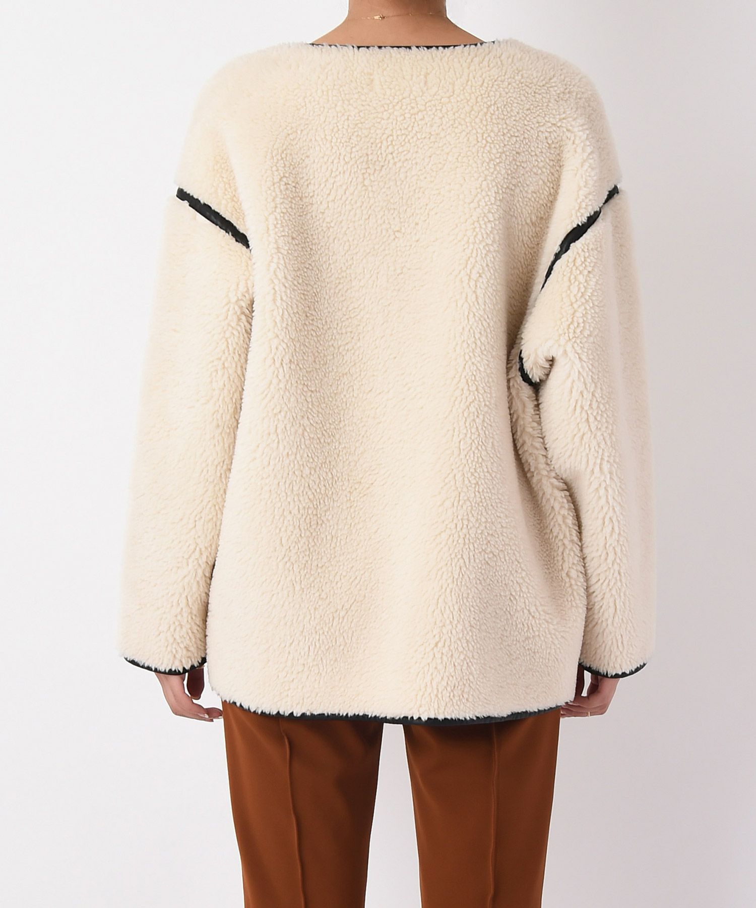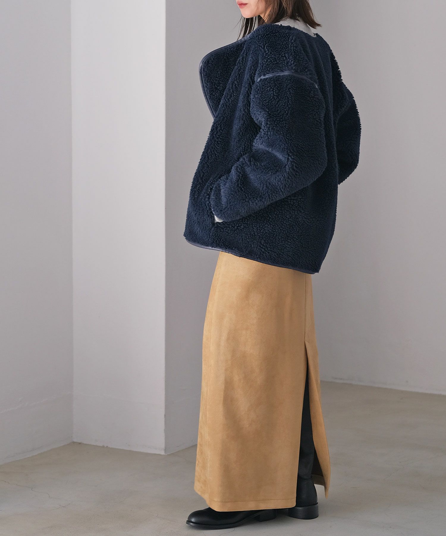 表側のボアと裏側のフェイクスウェードを貼り合わせた生地により、程よいハリ感が丸みのあるフォルムを生み出し、ボリューミーなシルエットにも女性らしさを加えてくれます。