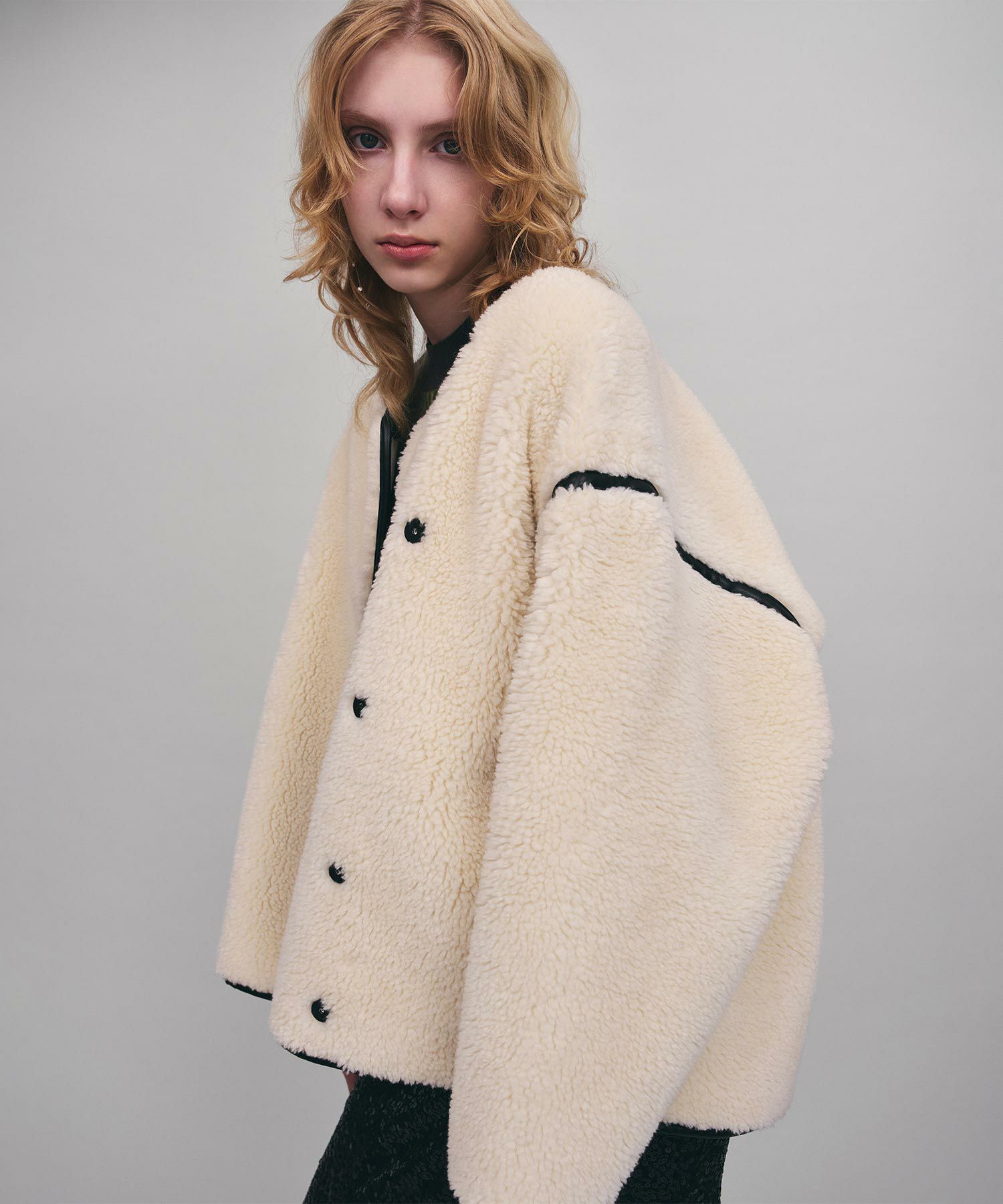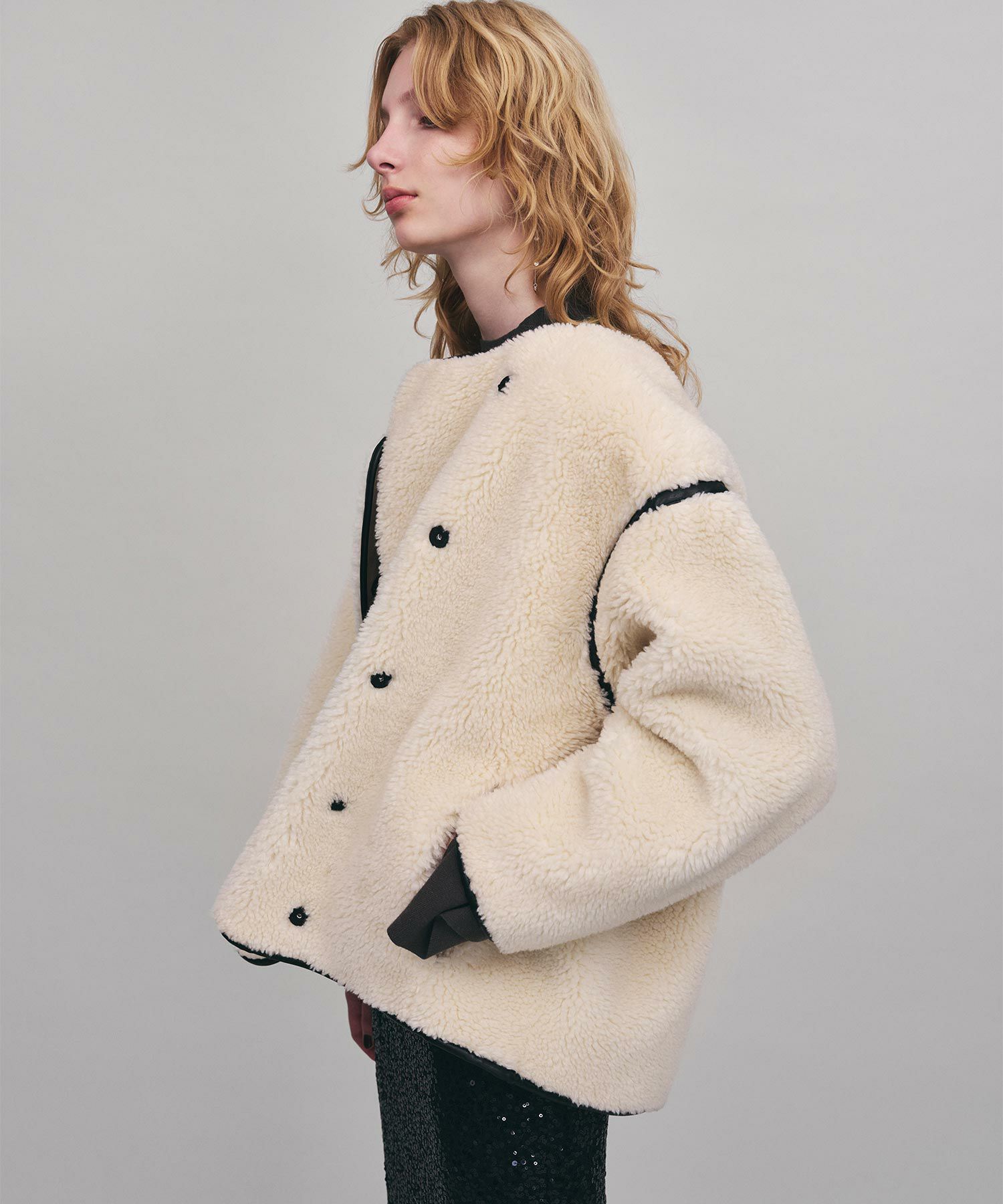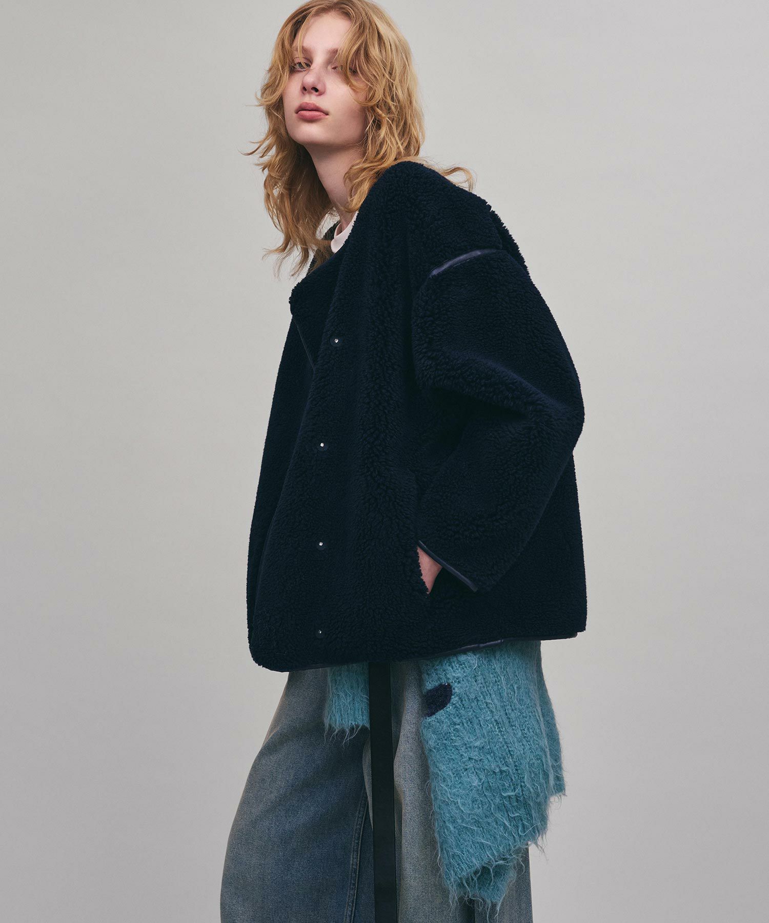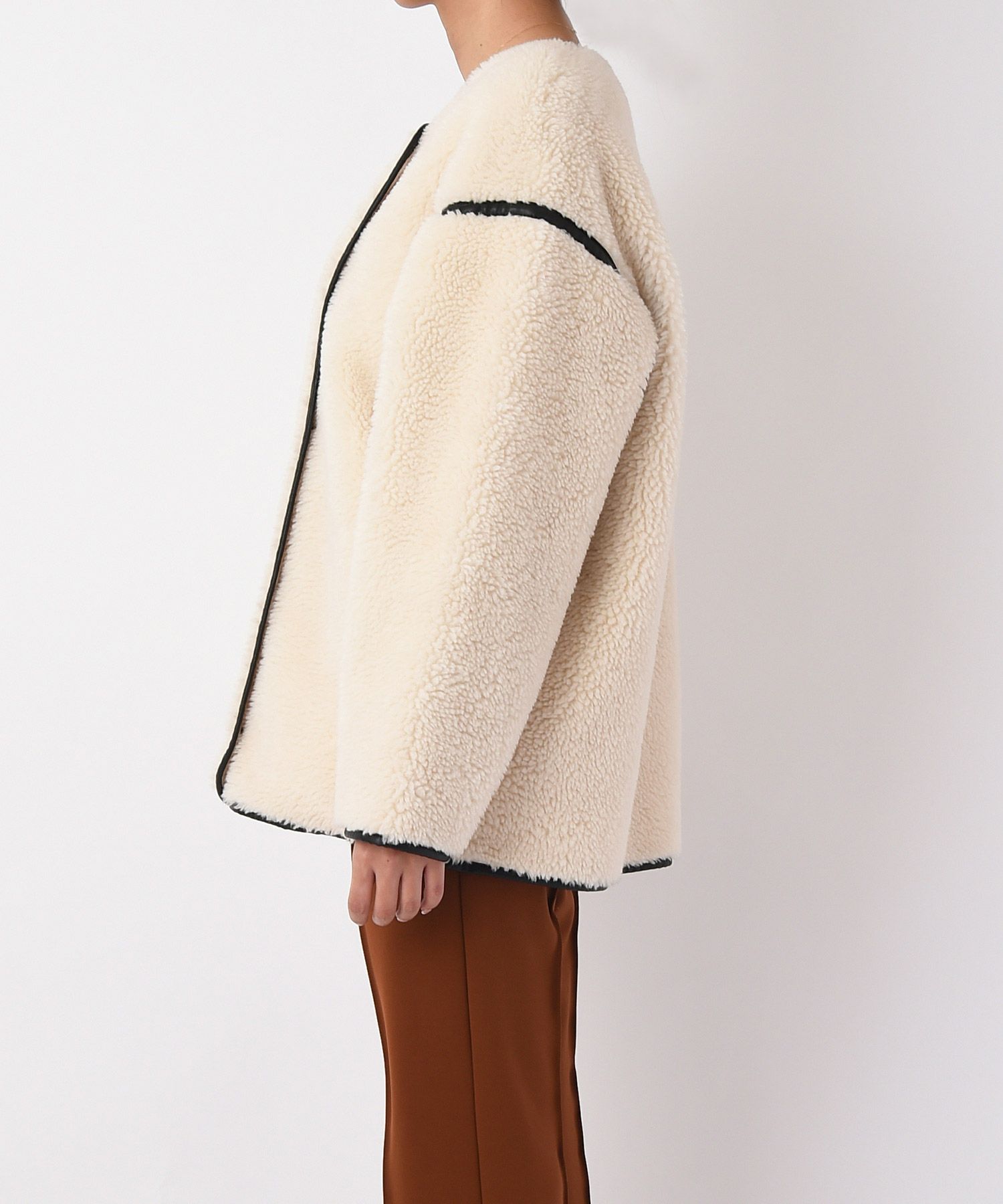 表側のボアと裏側のフェイクスウェードを貼り合わせた生地により、程よいハリ感が丸みのあるフォルムを生み出し、ボリューミーなシルエットにも女性らしさを加えてくれます。