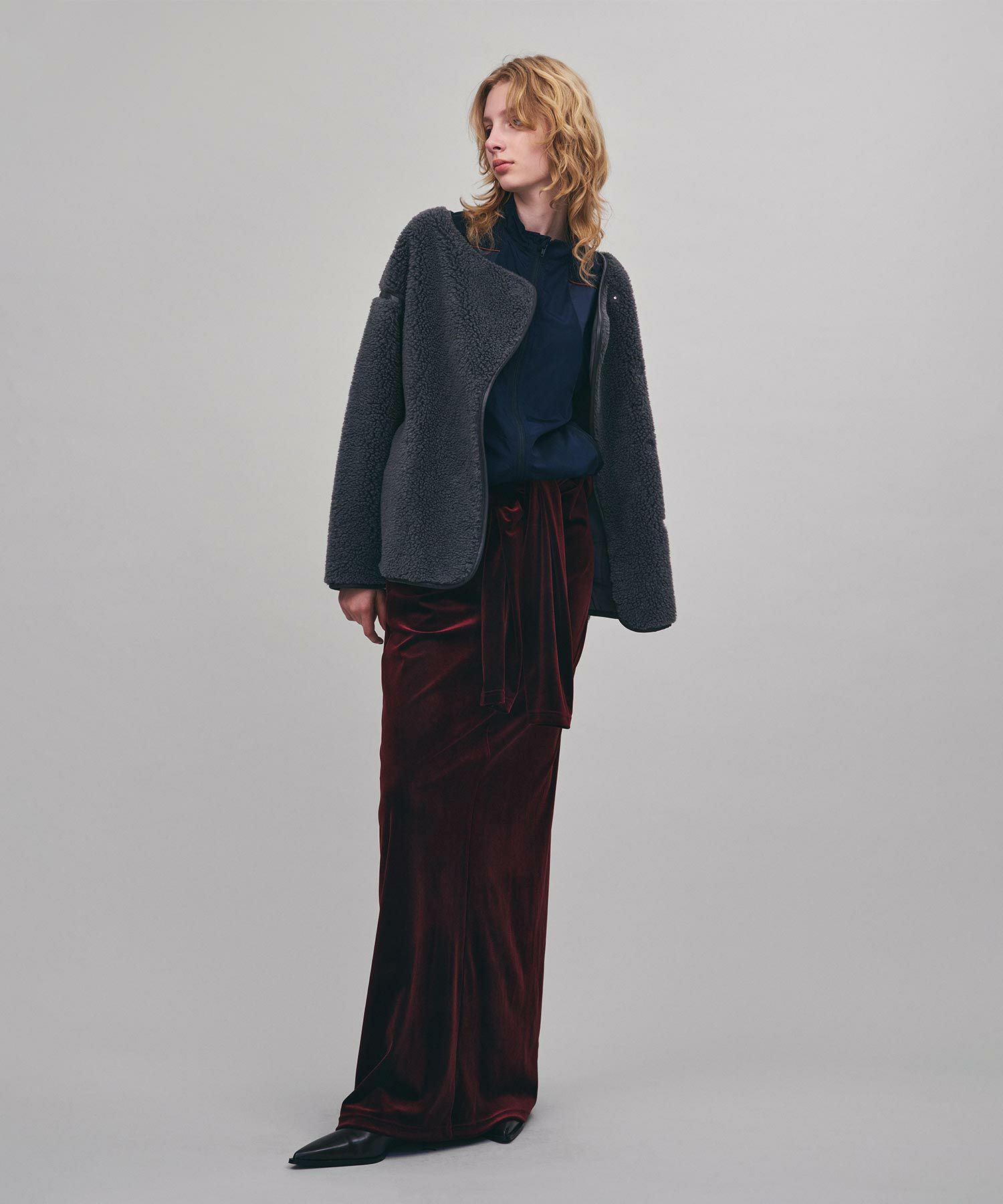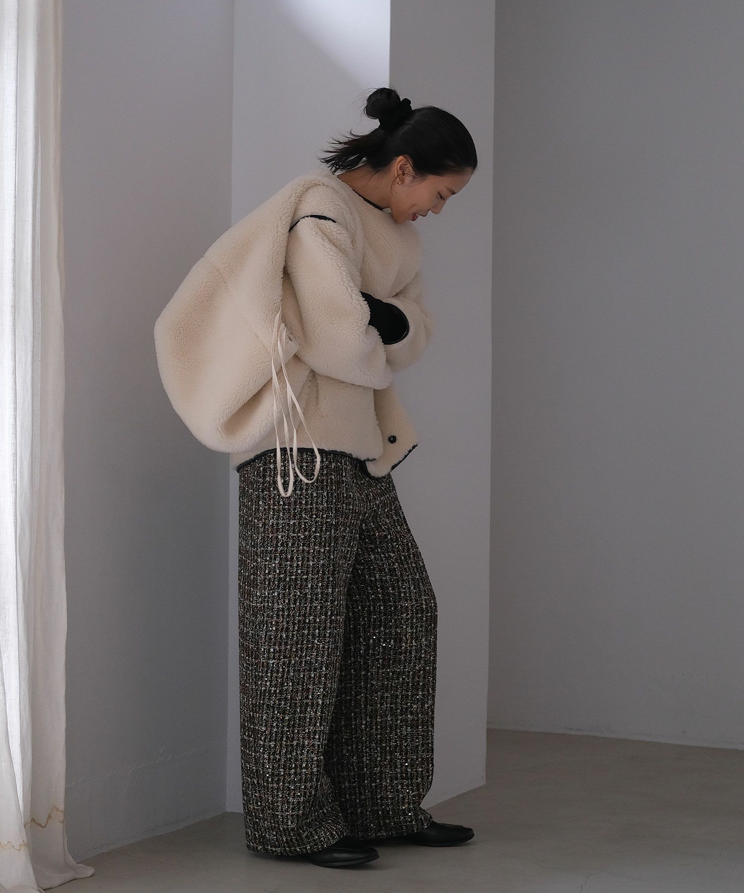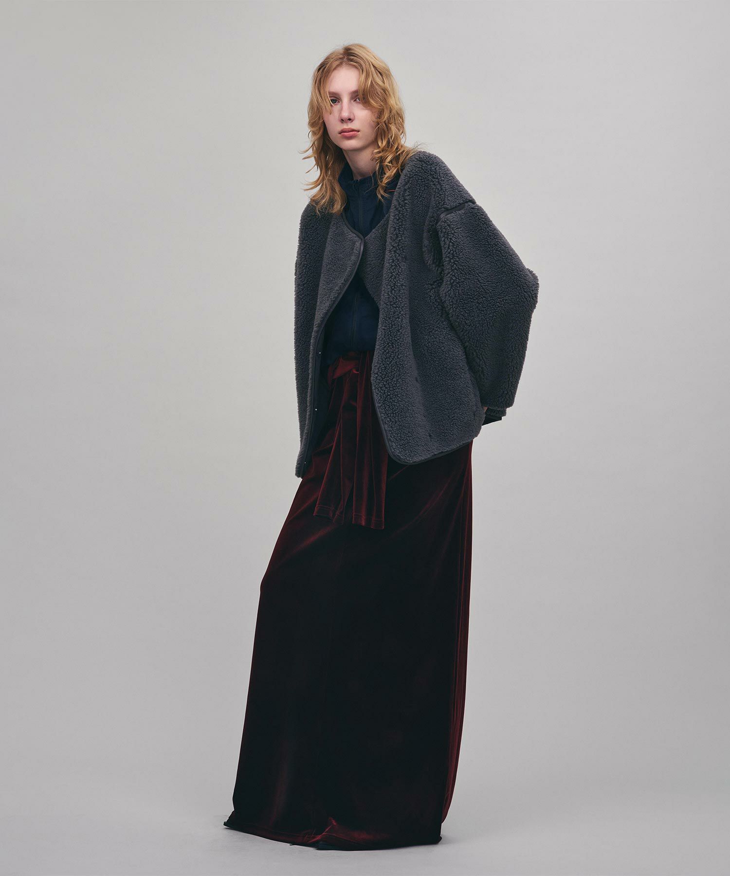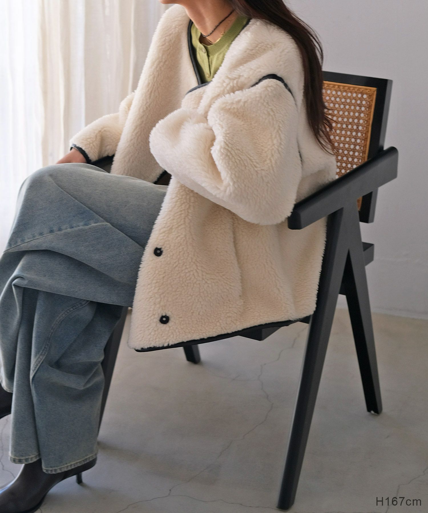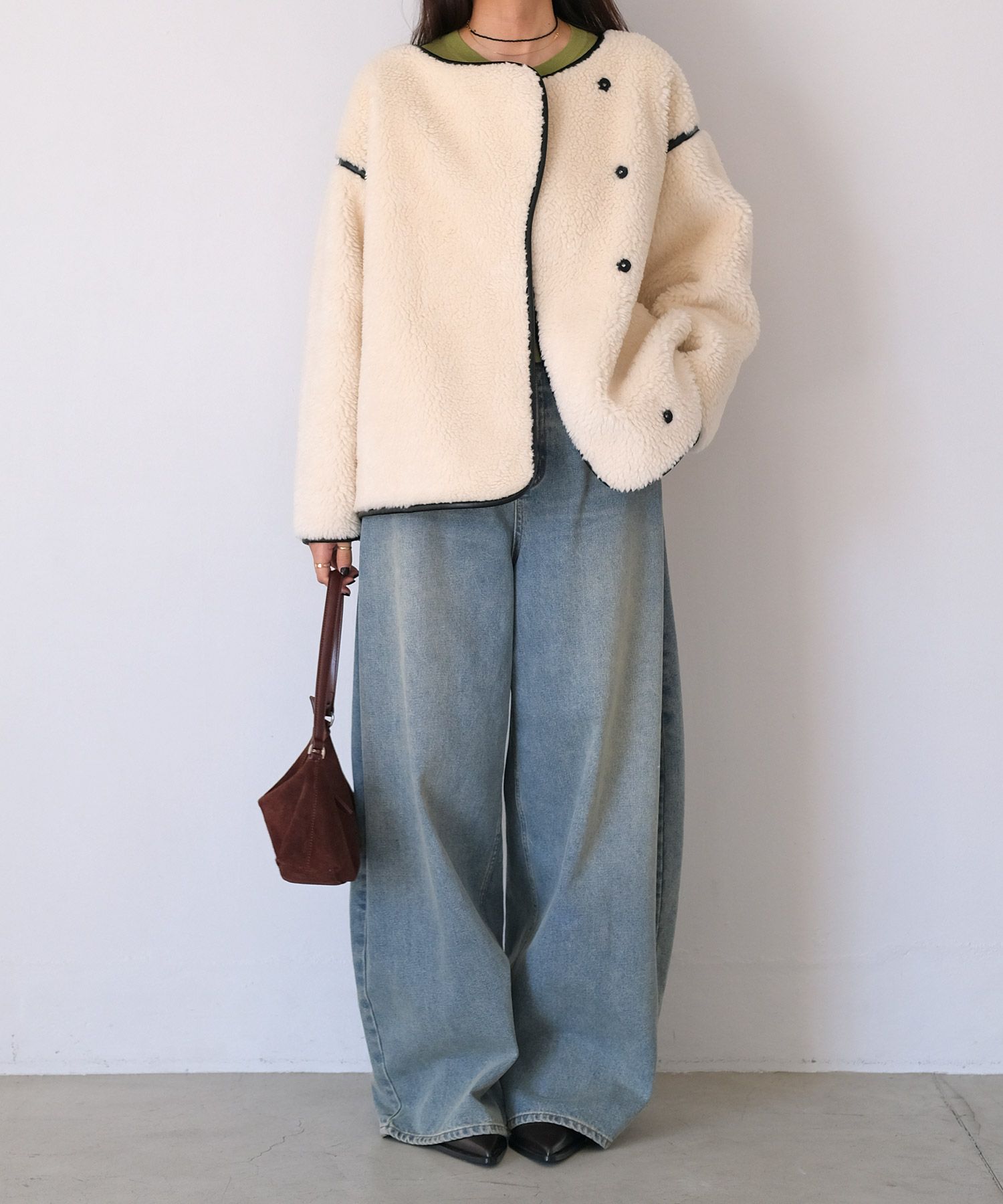 表側のボアと裏側のフェイクスウェードを貼り合わせた生地により、程よいハリ感が丸みのあるフォルムを生み出し、ボリューミーなシルエットにも女性らしさを加えてくれます。