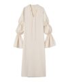 抜け感のある襟元とふんわりと膨らむボリューミーな袖がポイントのロングドレス。