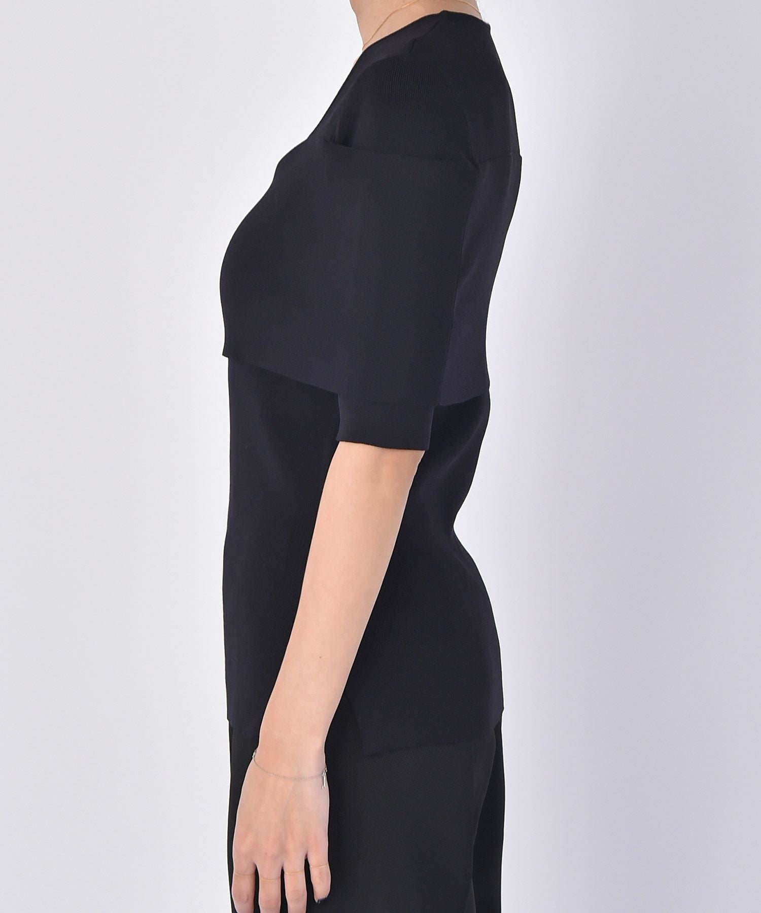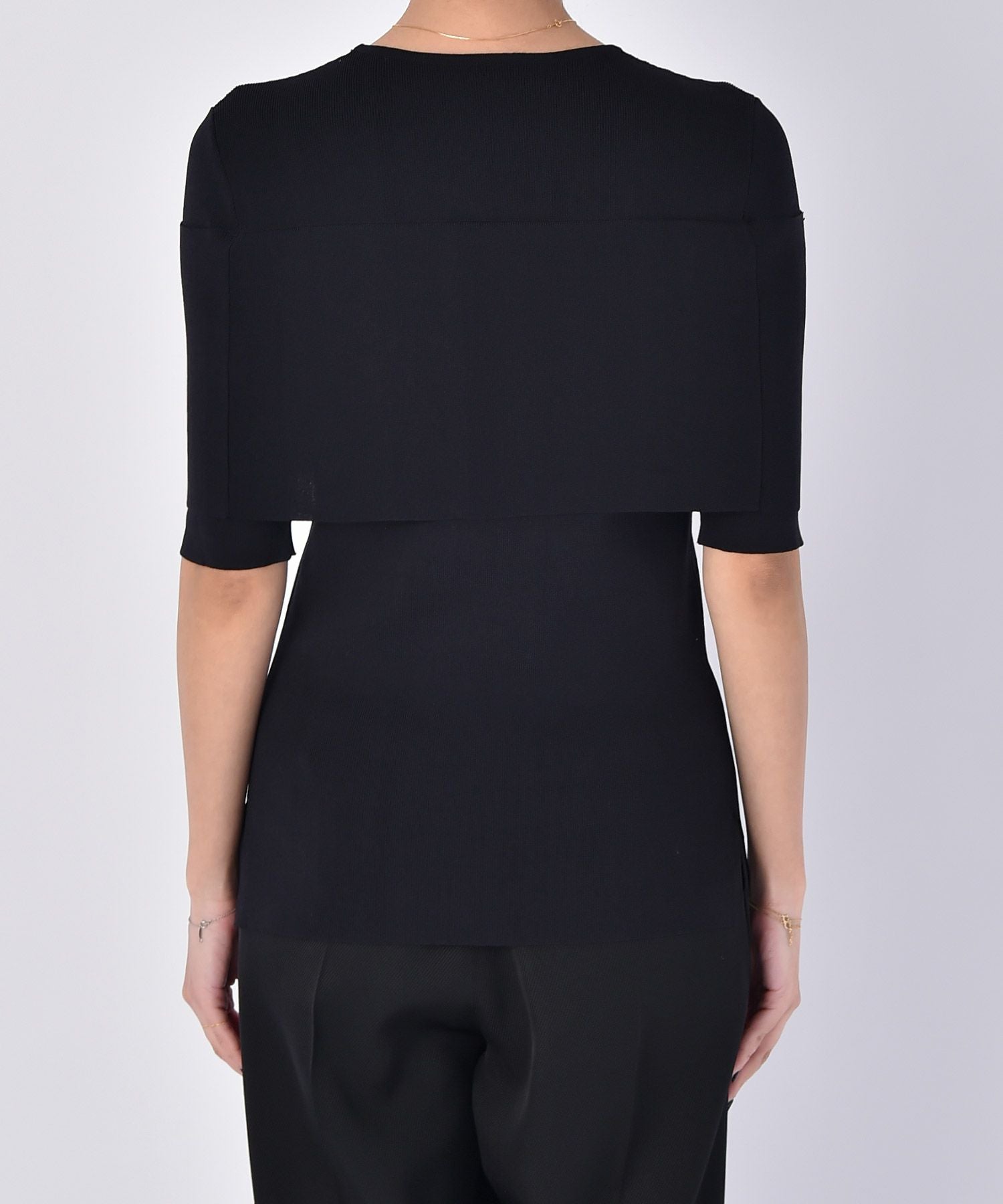 肩から胸元を覆う帯状のデザインが気になる二の腕を隠しつつ、どこかオフショルダーを着ているような女性らしい雰囲気に。