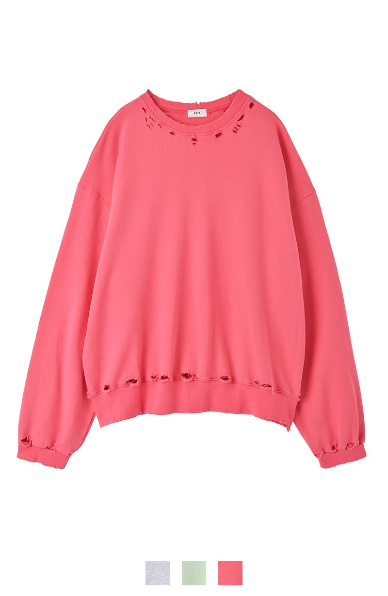 首元など各所に施されたダメージ加工が、ヴィンテージライクな雰囲気を演出するスウェットプルオーバー。