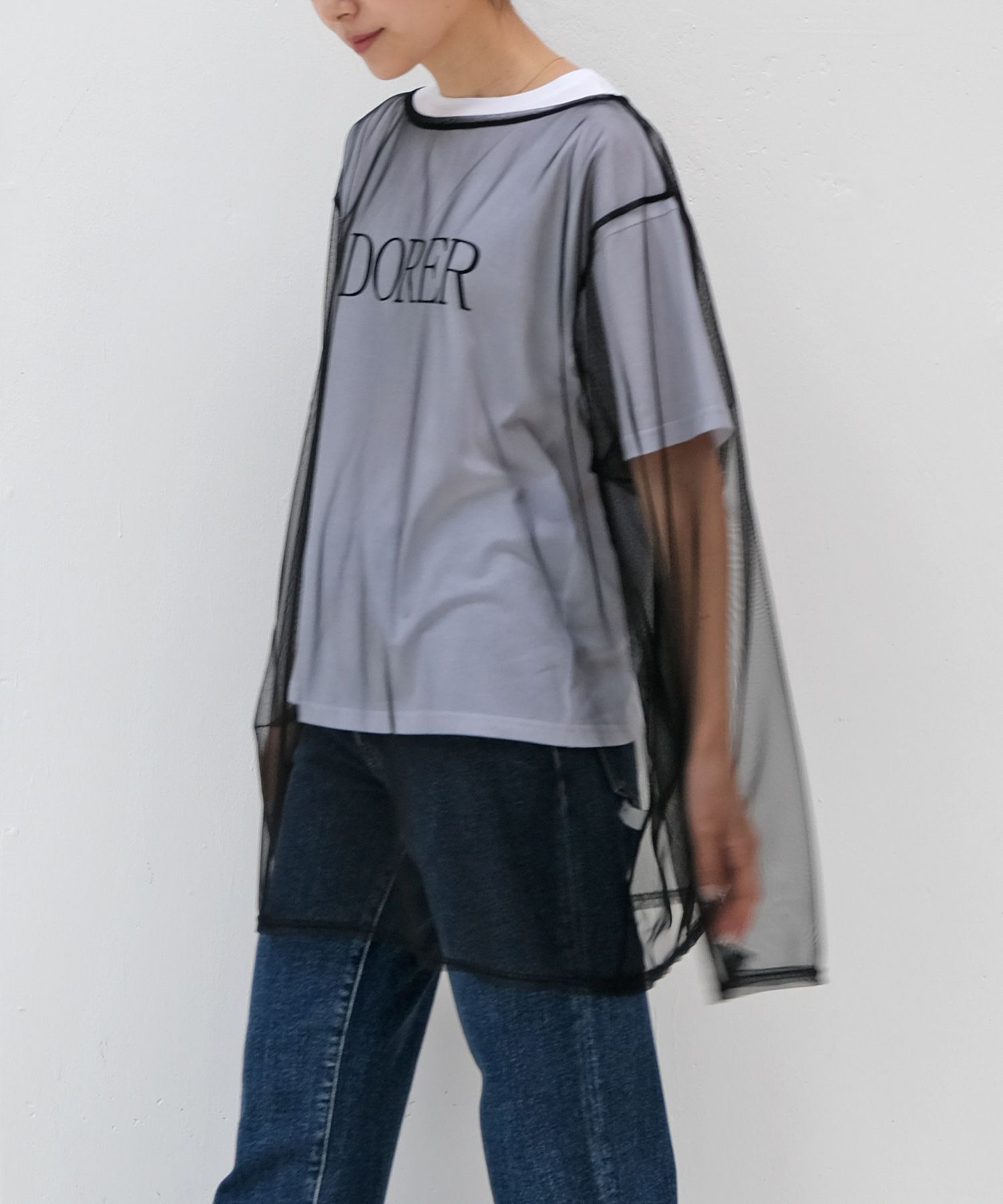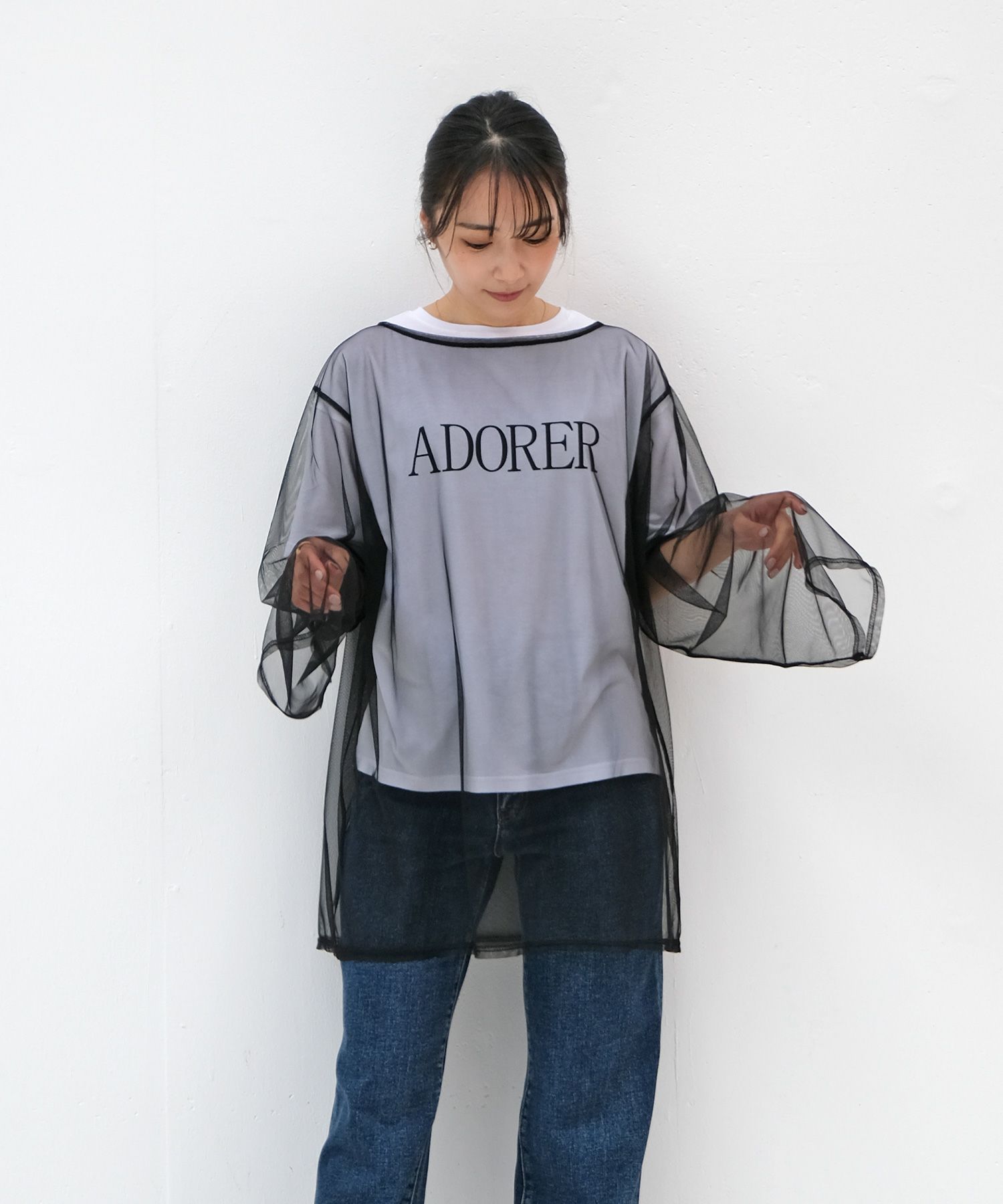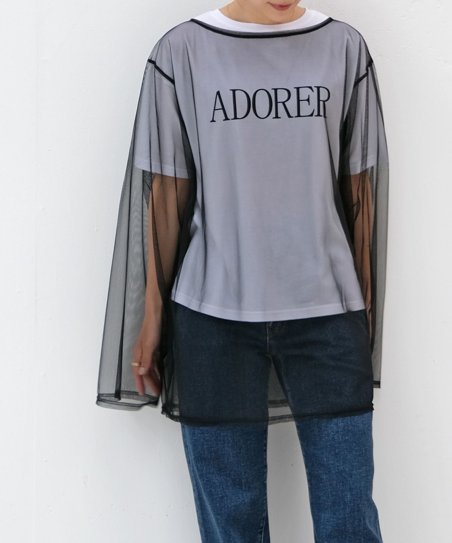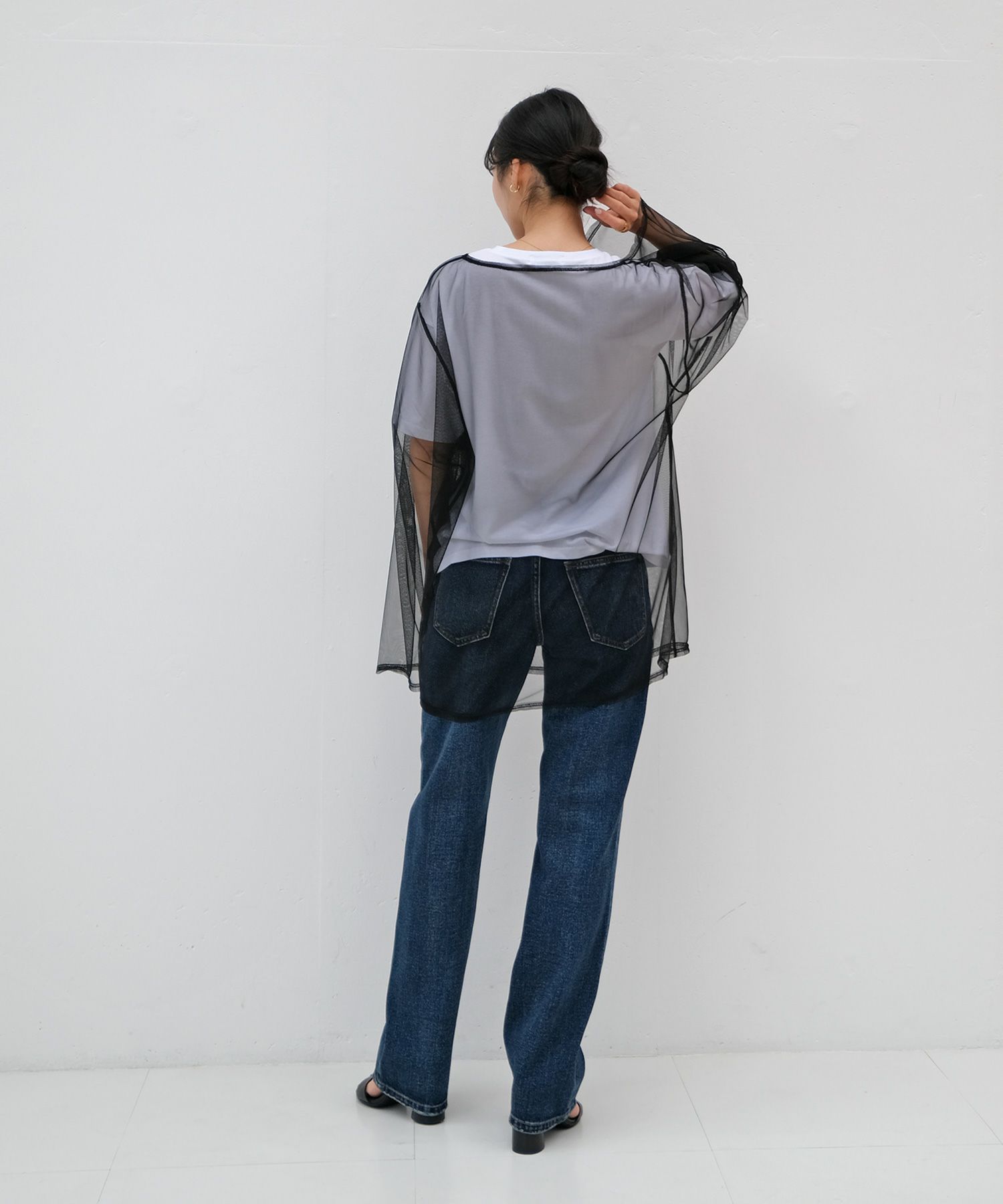 チュール素材でトレンド感たっぷりに仕上げたトップス。