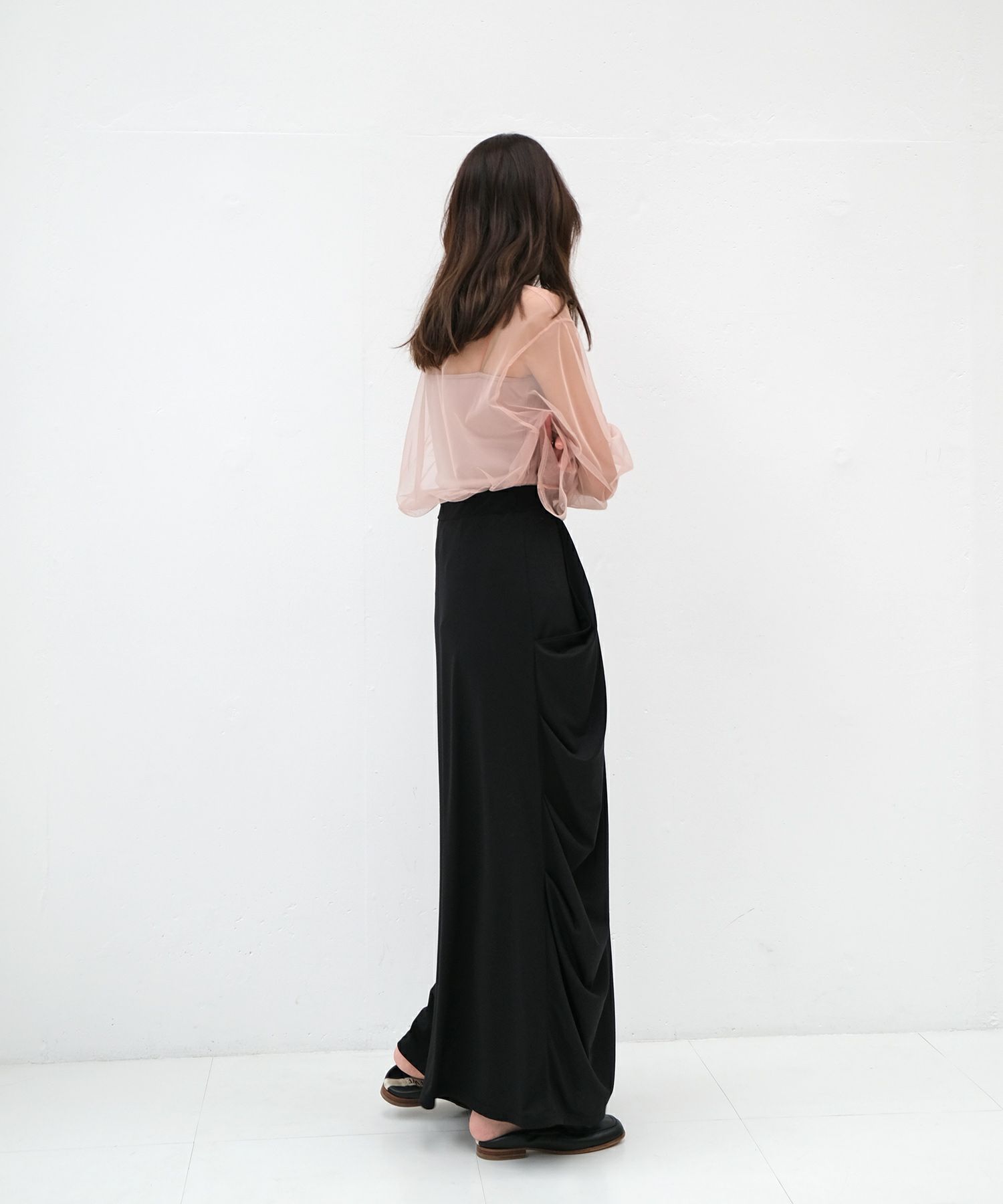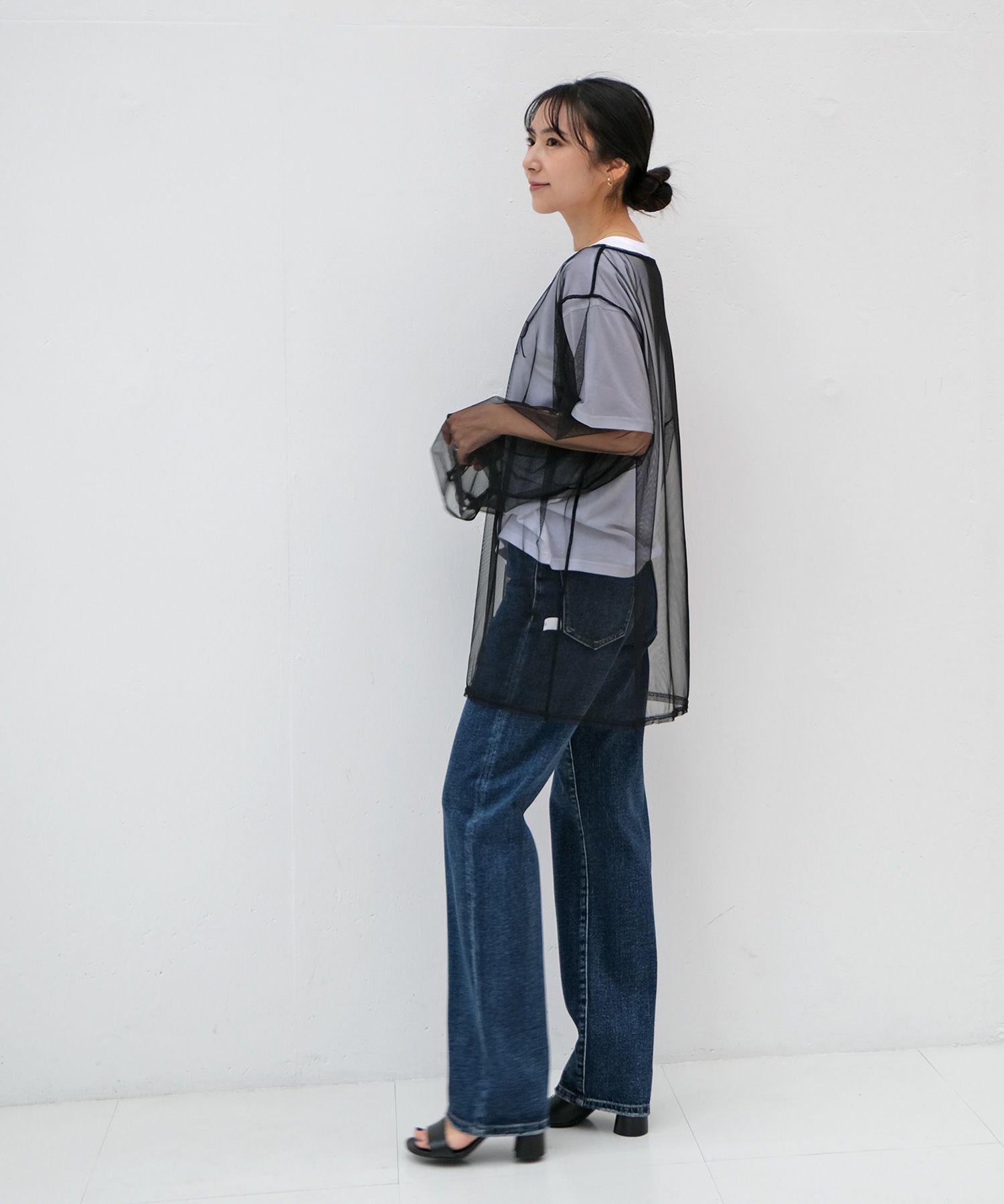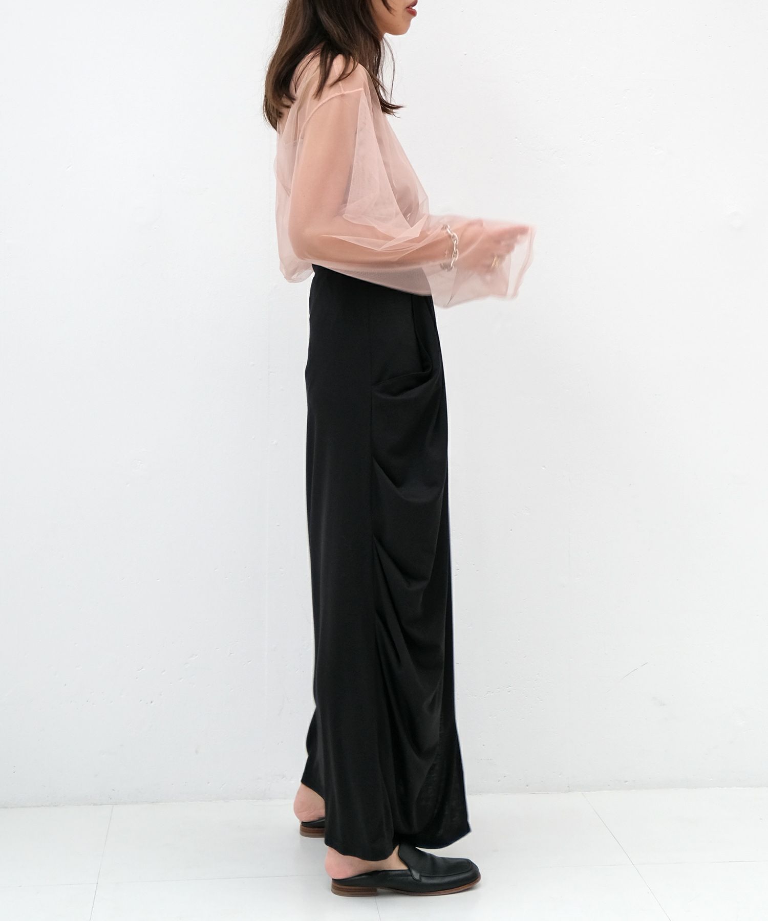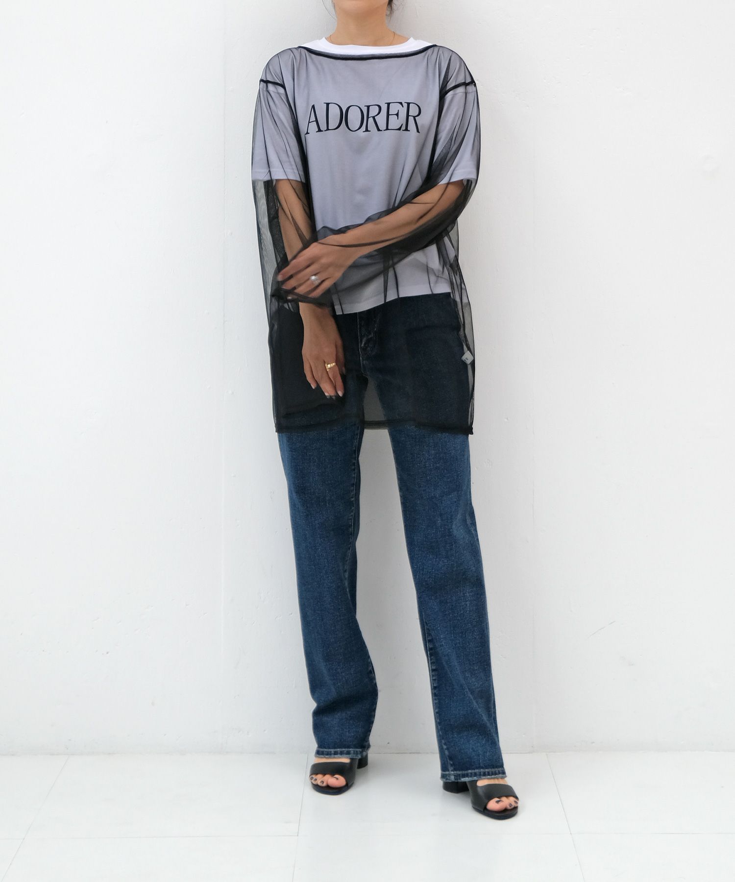 チュール素材でトレンド感たっぷりに仕上げたトップス。