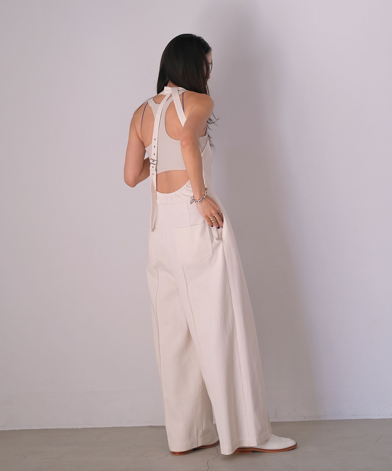 バックスタイルもこなれて見せるデザインベルトがポイントのジャンプスーツ。