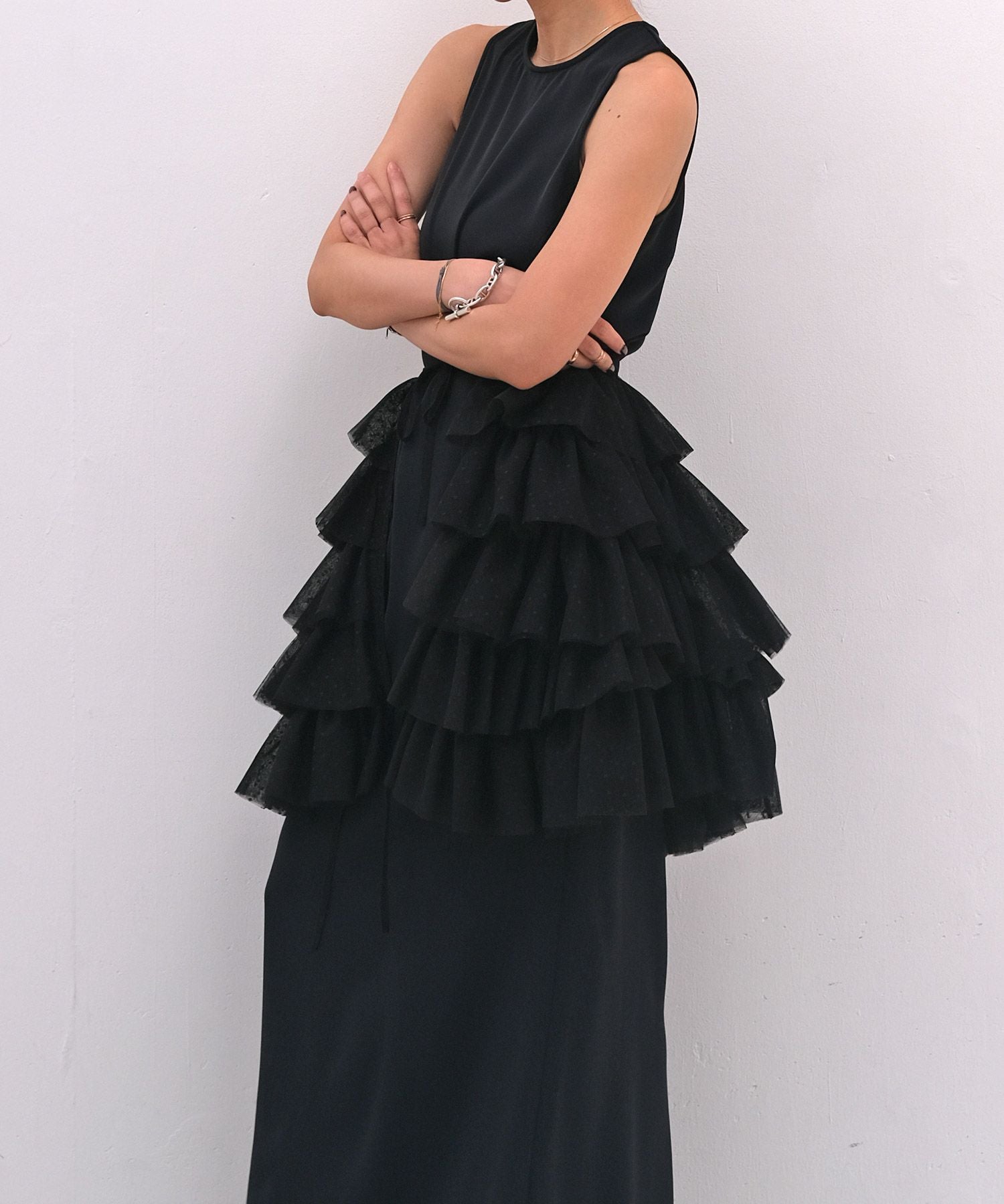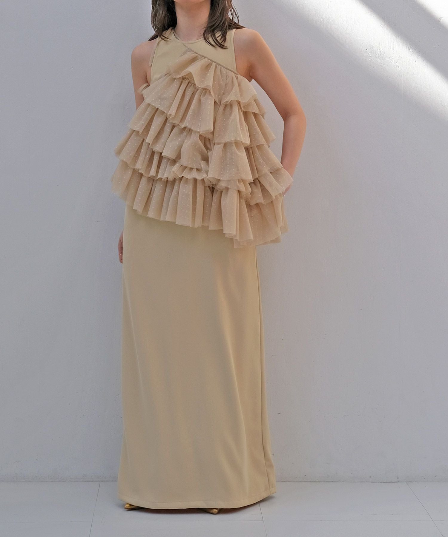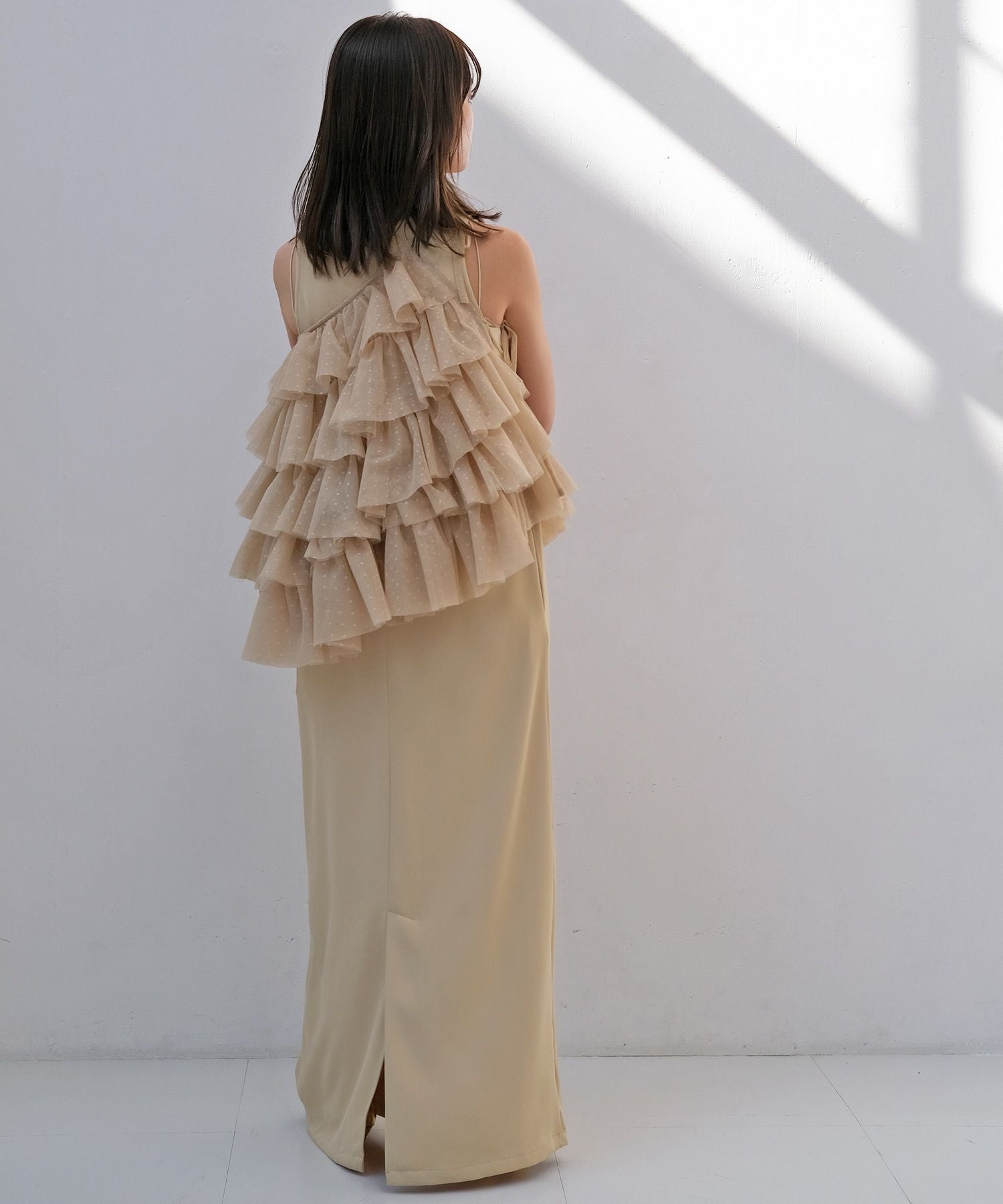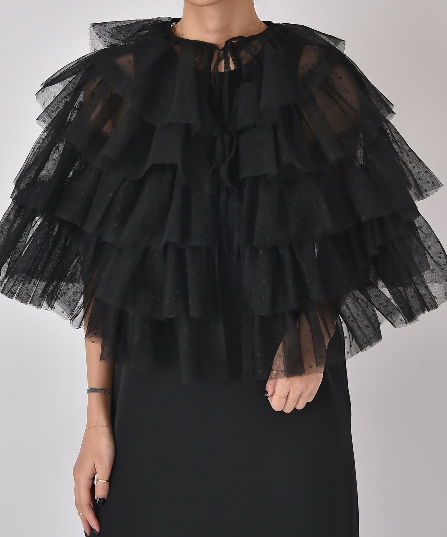 ドットチュールを贅沢に重ねたケープがアクセントのマキシドレス。
