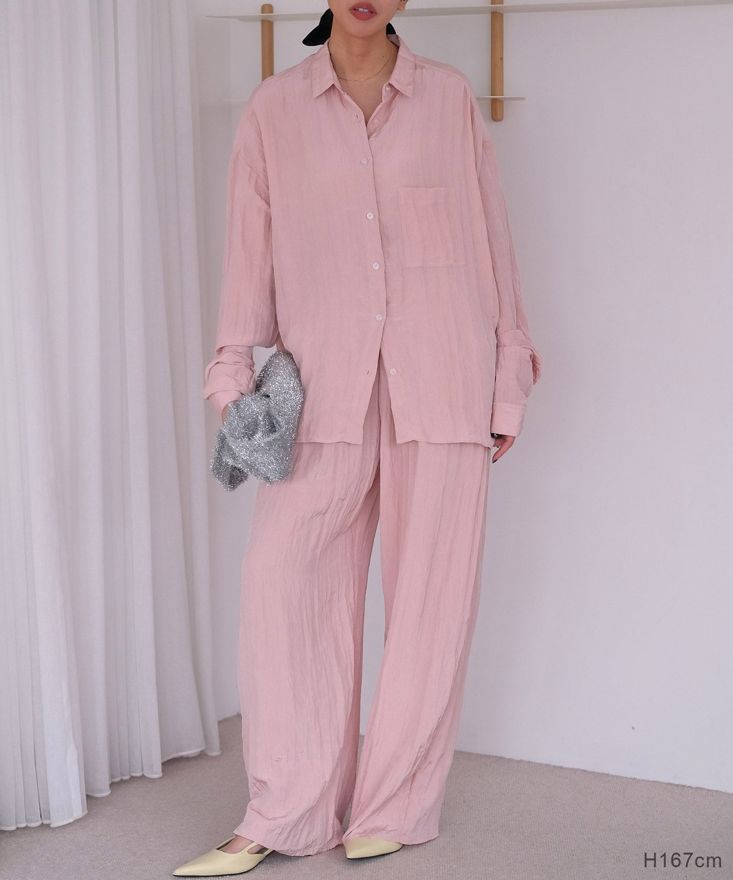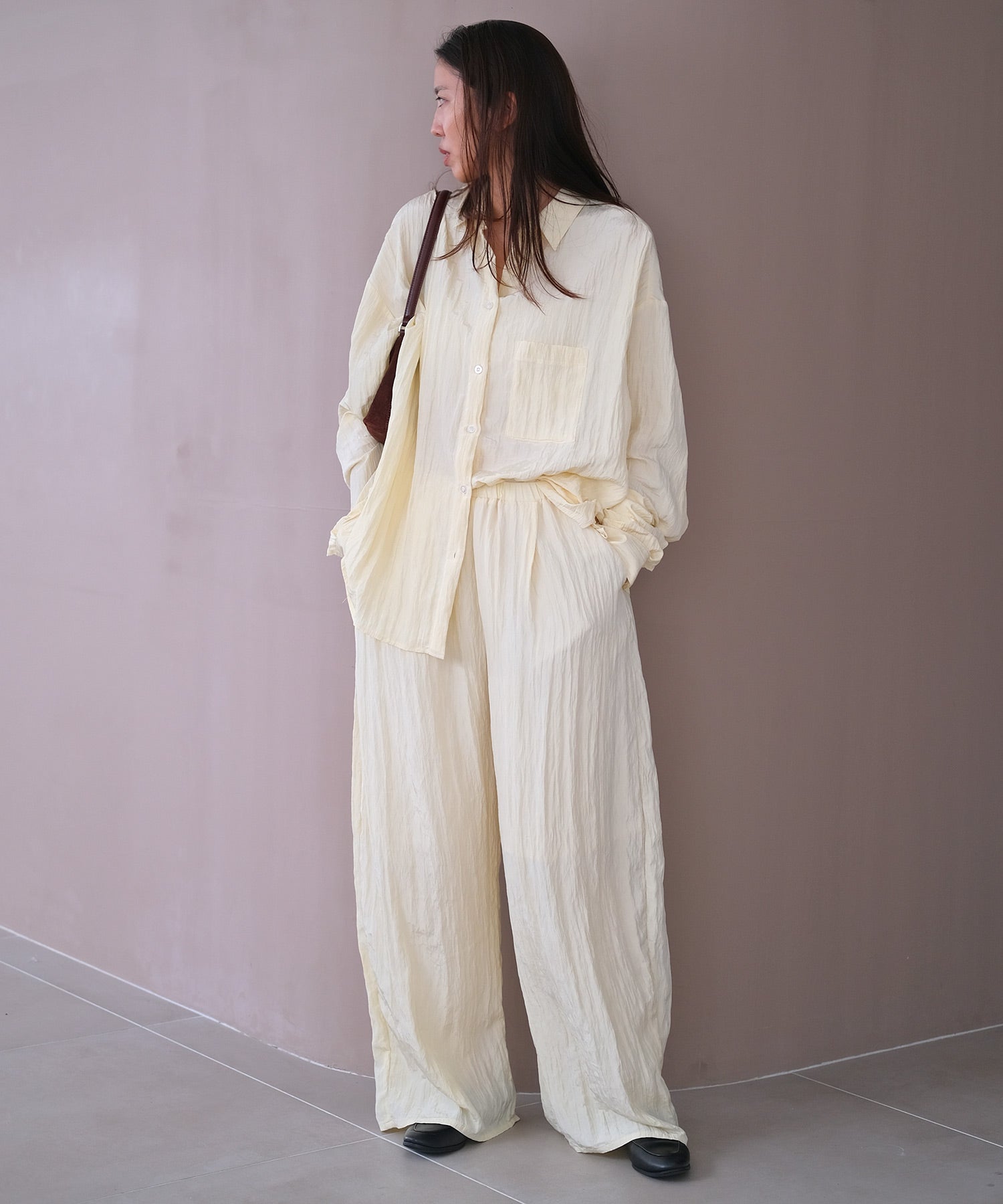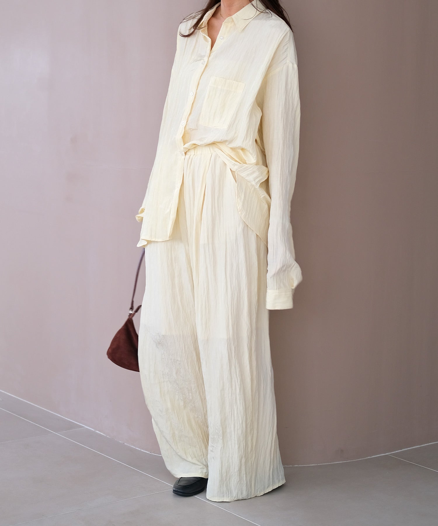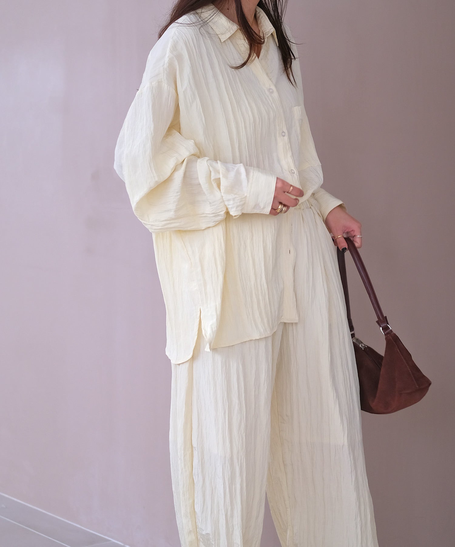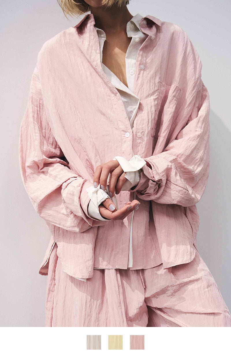 幅広いボトムスと合わせやすいシンプルなデザインで、バターイエローとベビーピンクは同素材のボリュームクリンクルワイドパンツとセットアップでの着用もおすすめです。