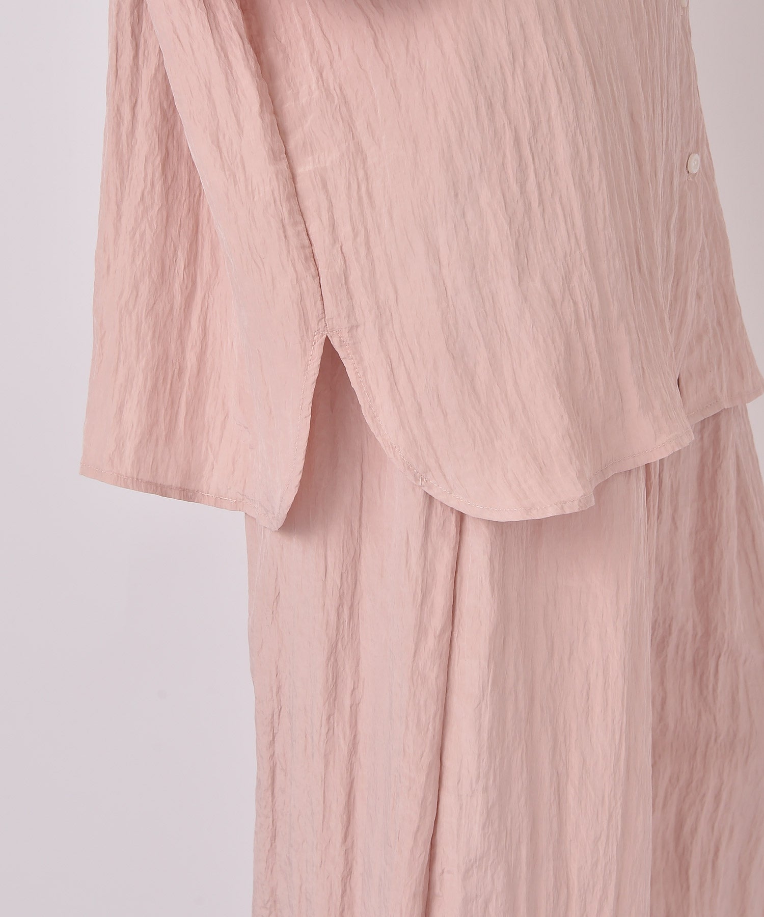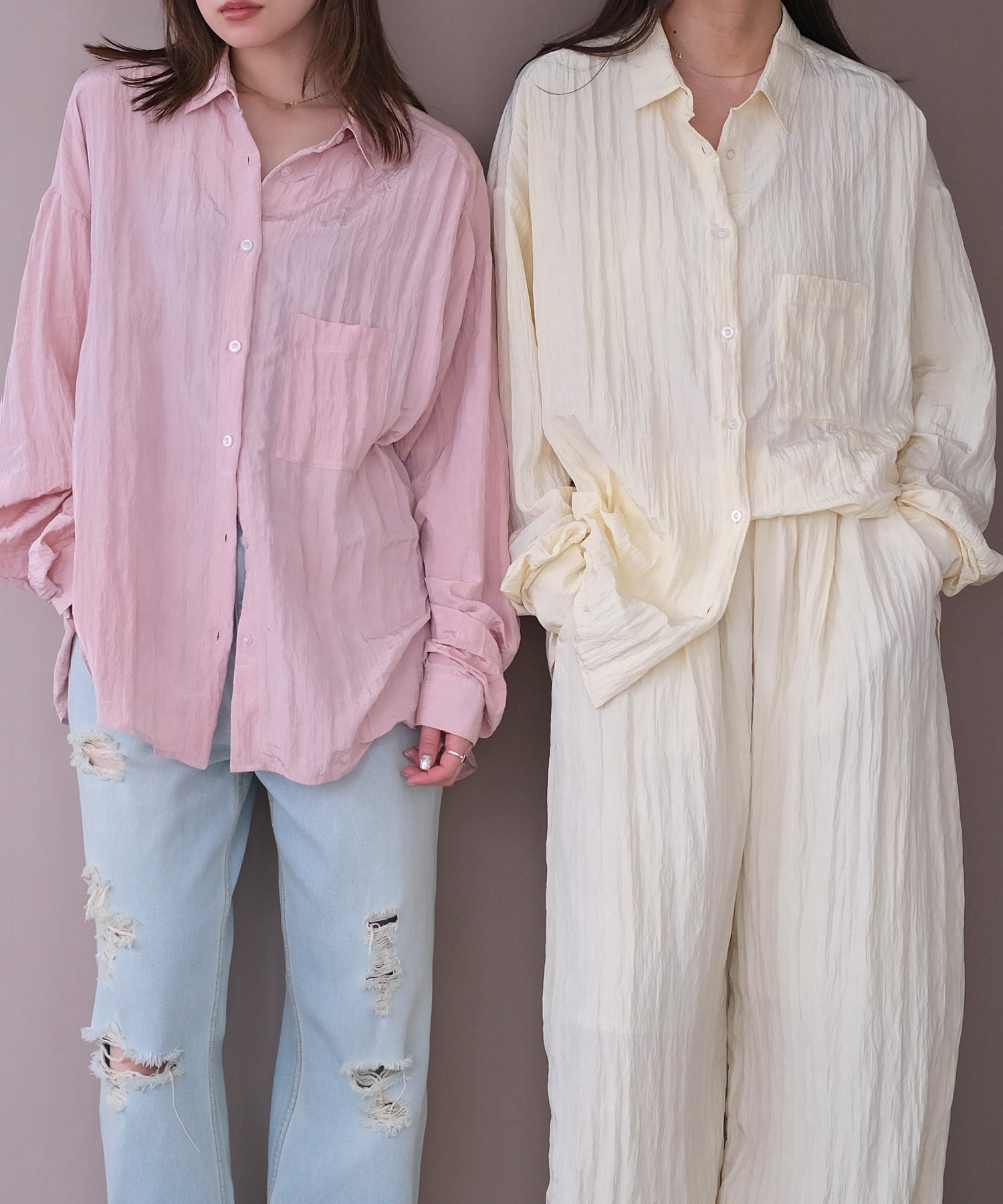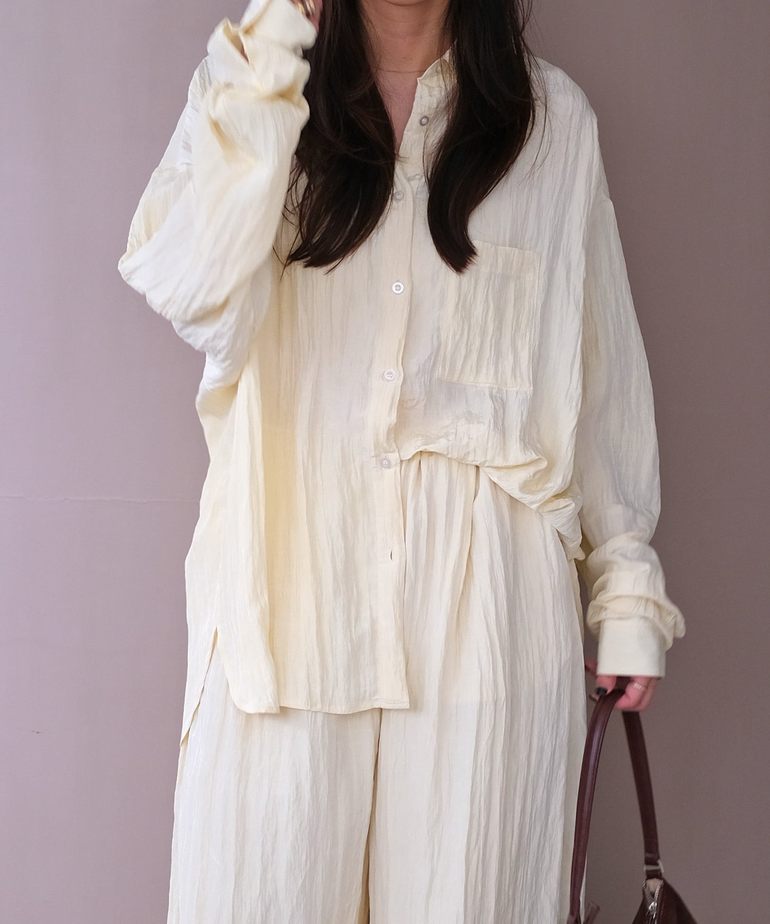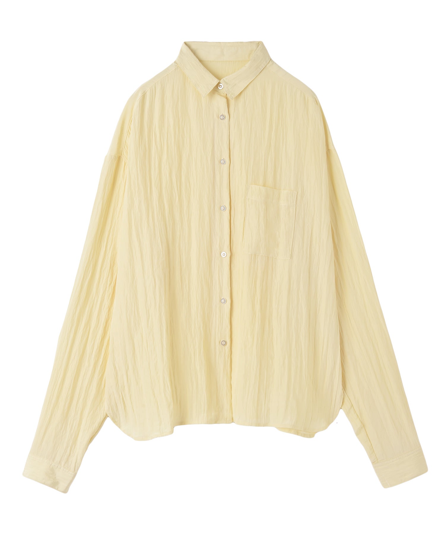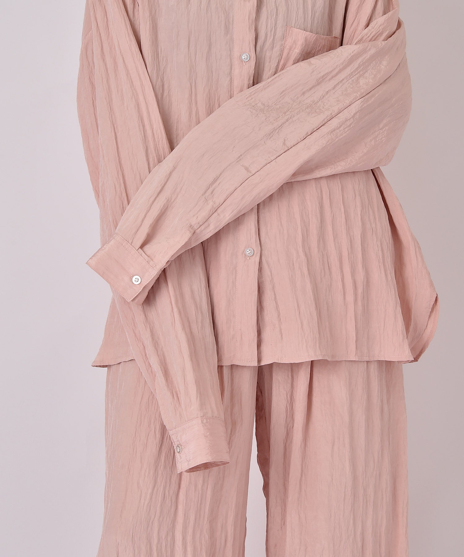 幅広いボトムスと合わせやすいシンプルなデザインで、バターイエローとベビーピンクは同素材のボリュームクリンクルワイドパンツとセットアップでの着用もおすすめです。