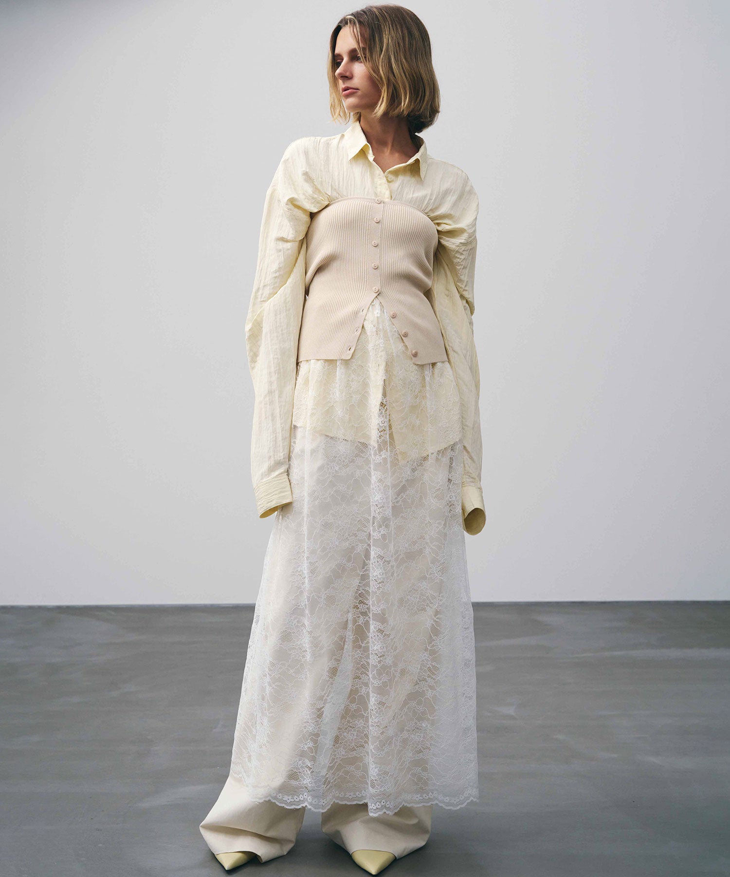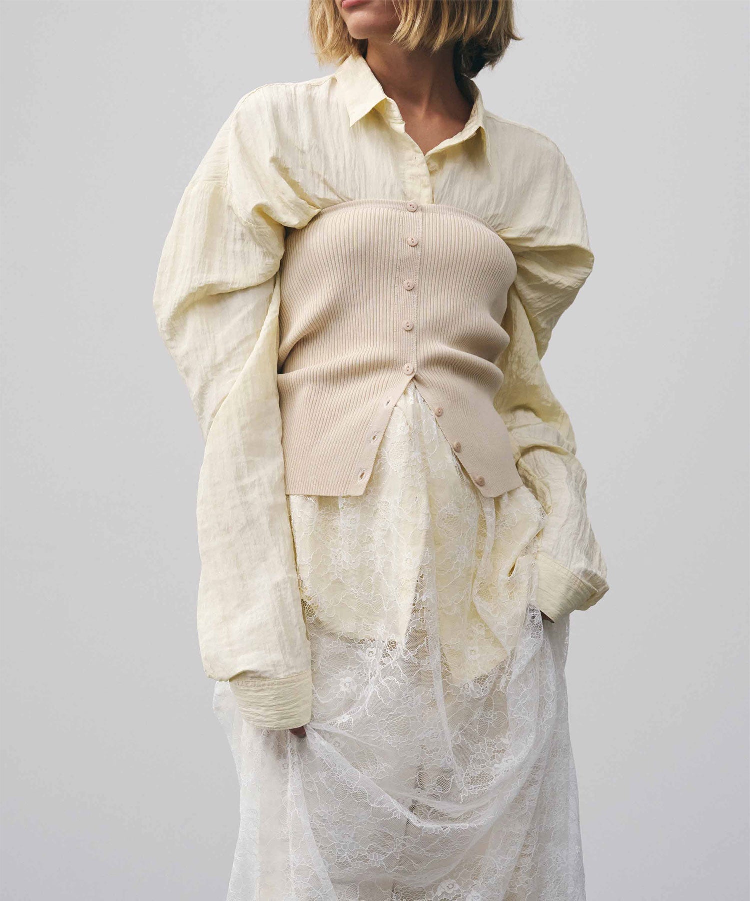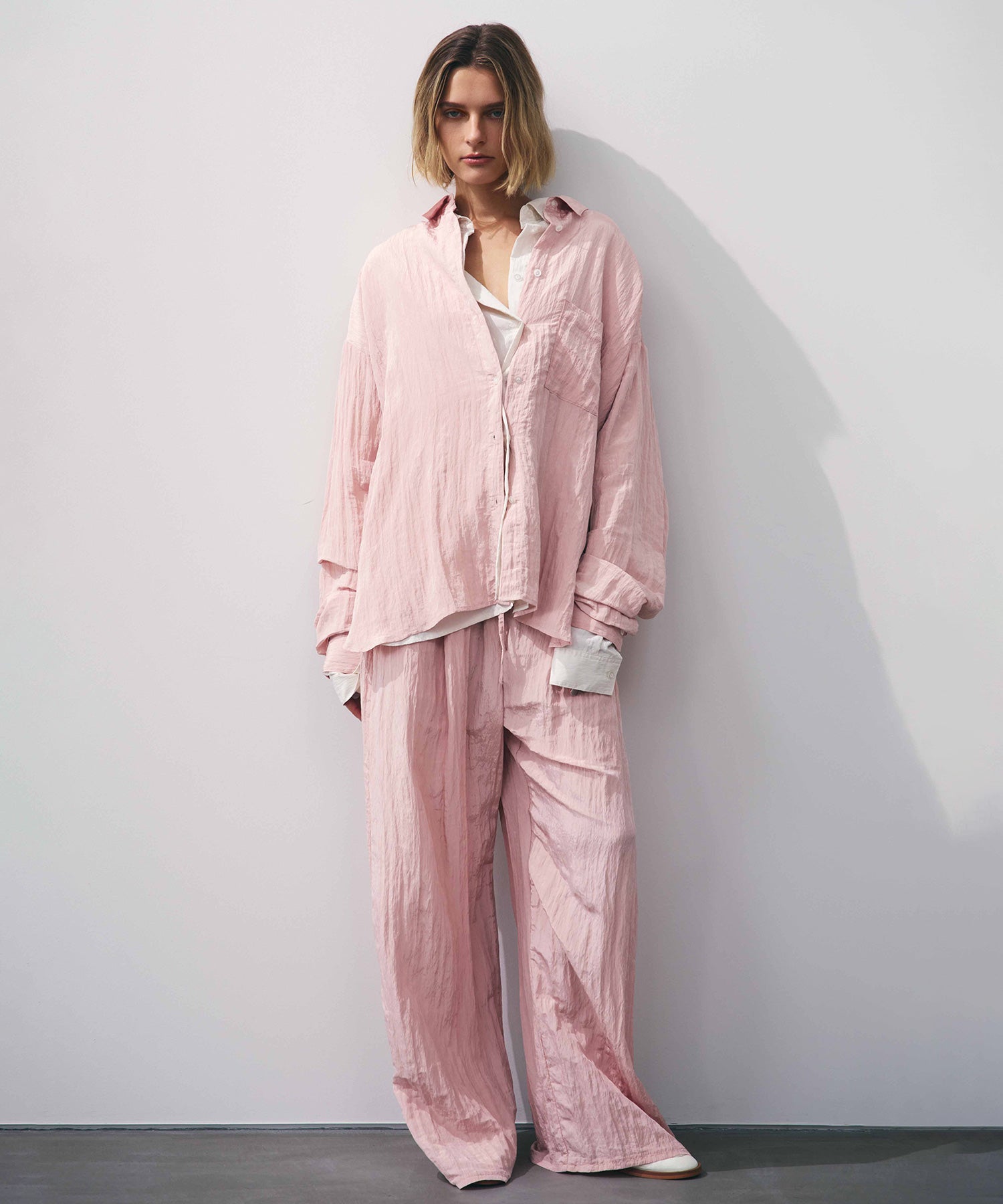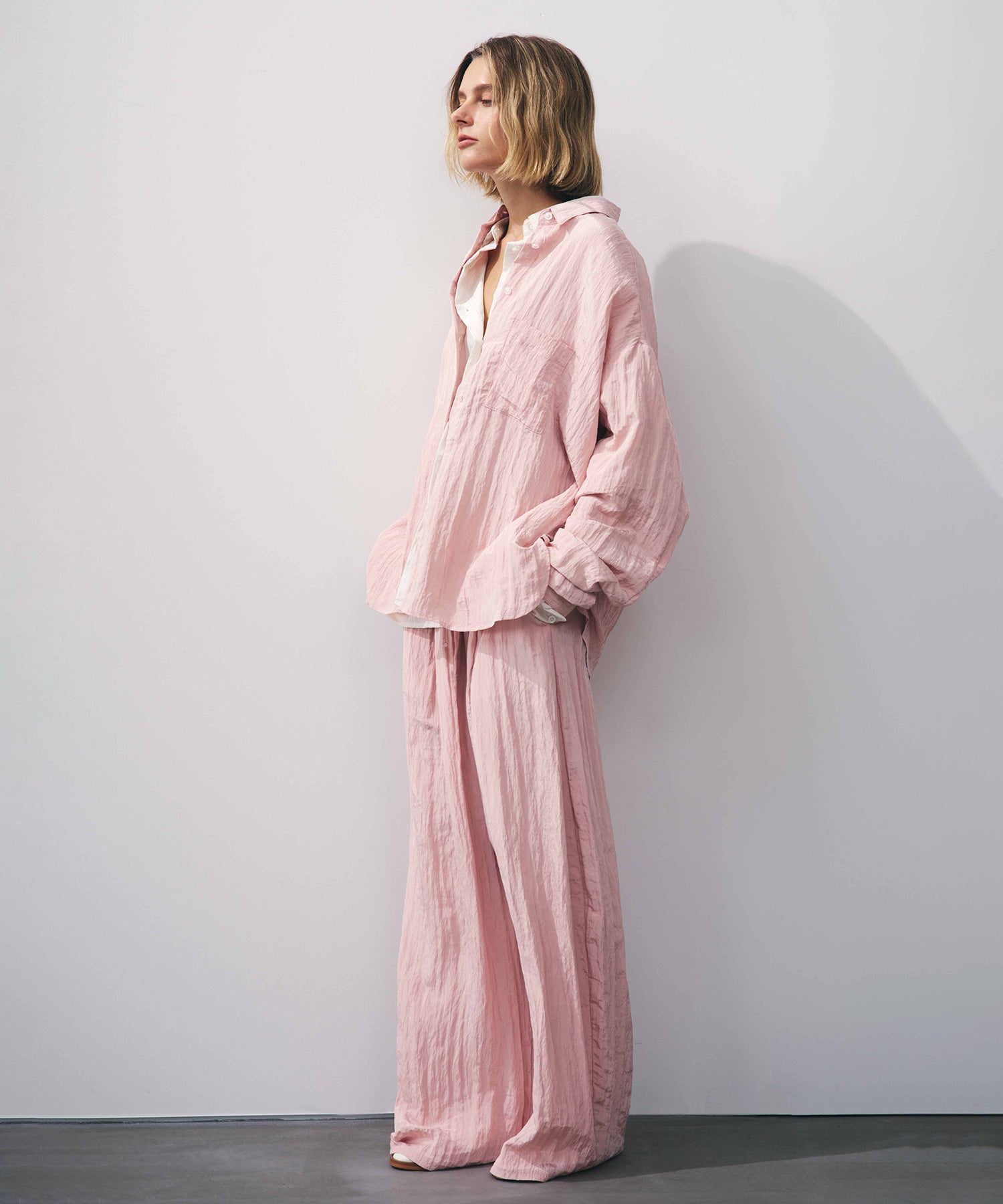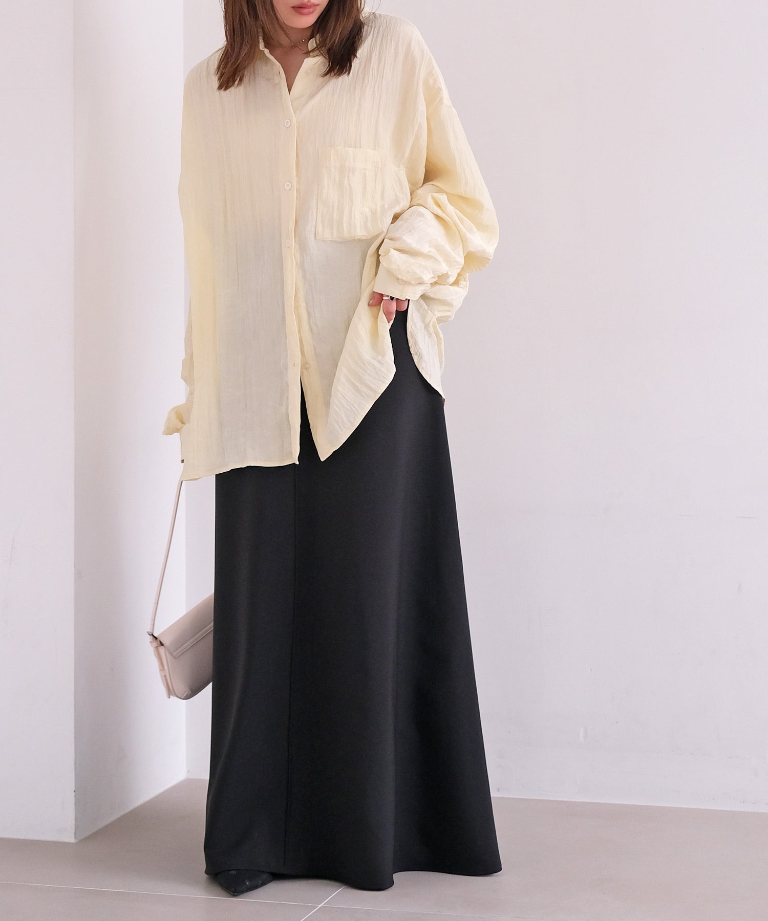 幅広いボトムスと合わせやすいシンプルなデザインで、バターイエローとベビーピンクは同素材のボリュームクリンクルワイドパンツとセットアップでの着用もおすすめです。