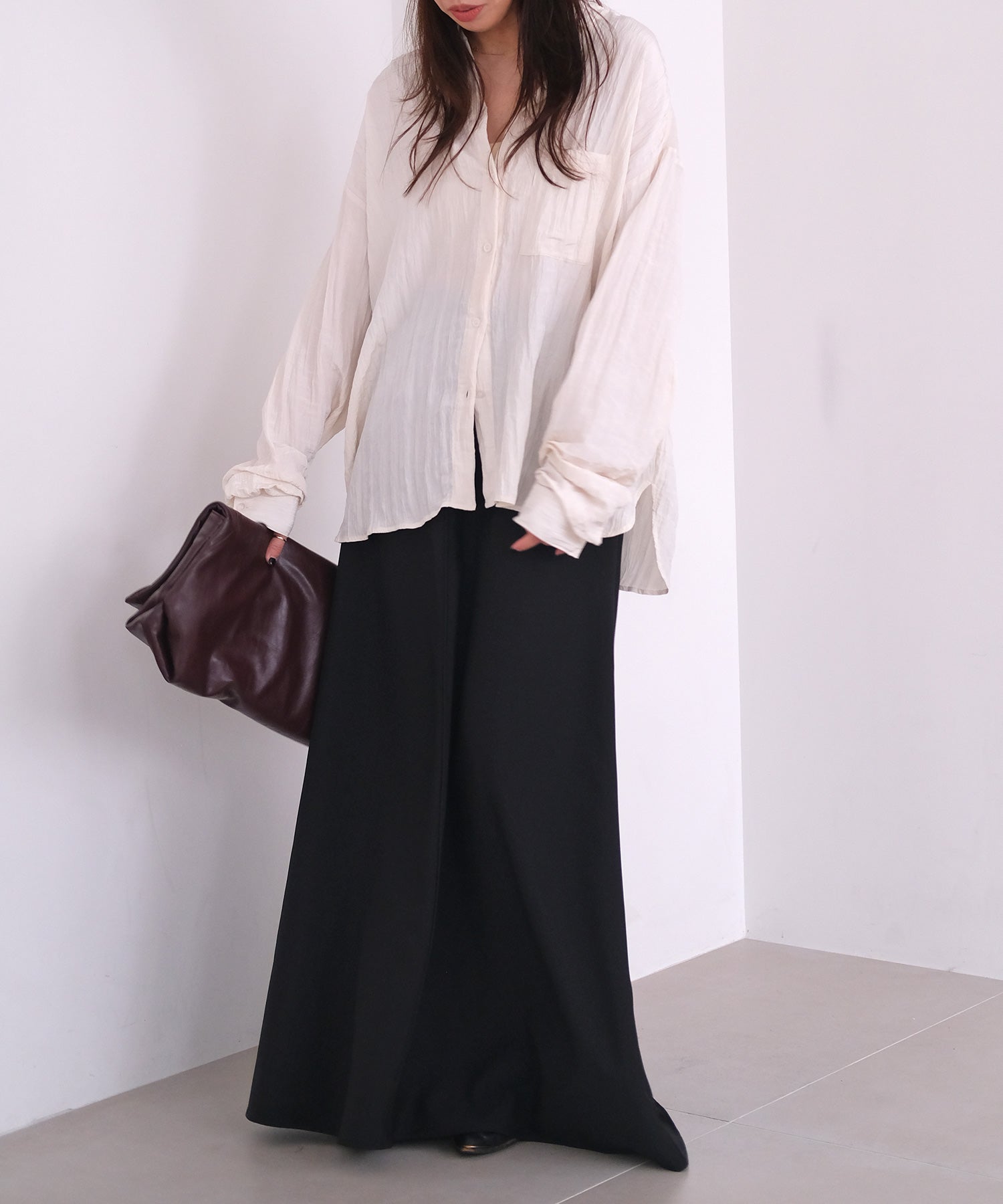 ゆったりとしたサイズ感と長めの袖が、抜け感のあるシルエットを作ります。