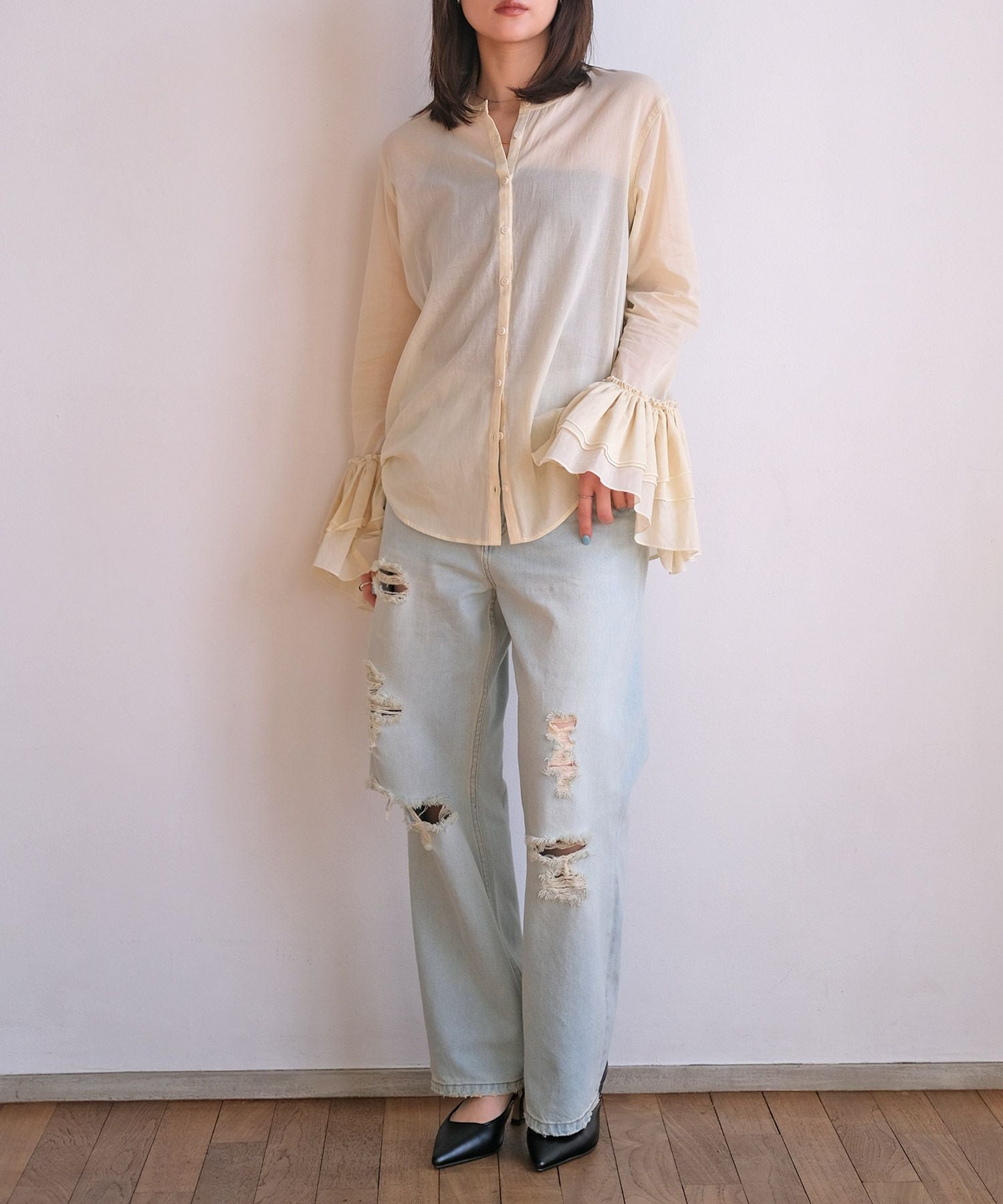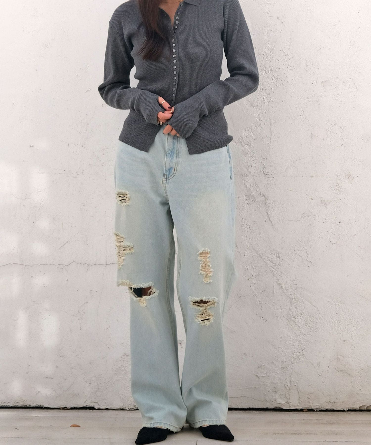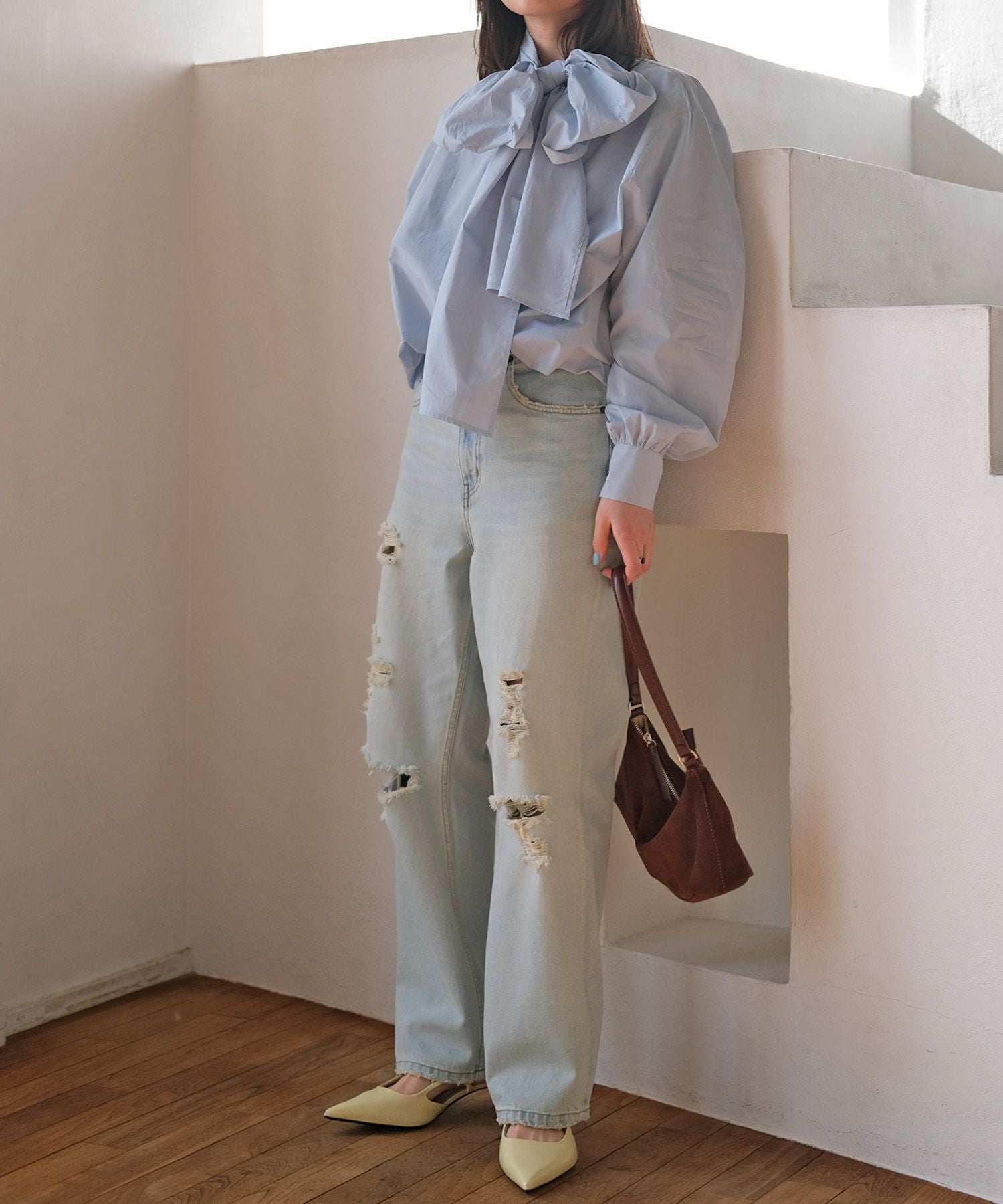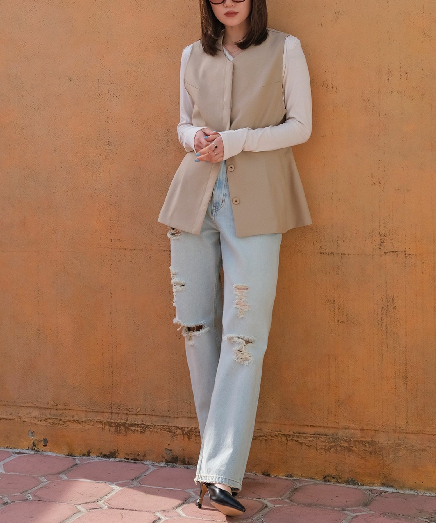 ダメージデザイン×ストレートシルエットがカジュアルになりすぎない、大人にこなれるデニムパンツ