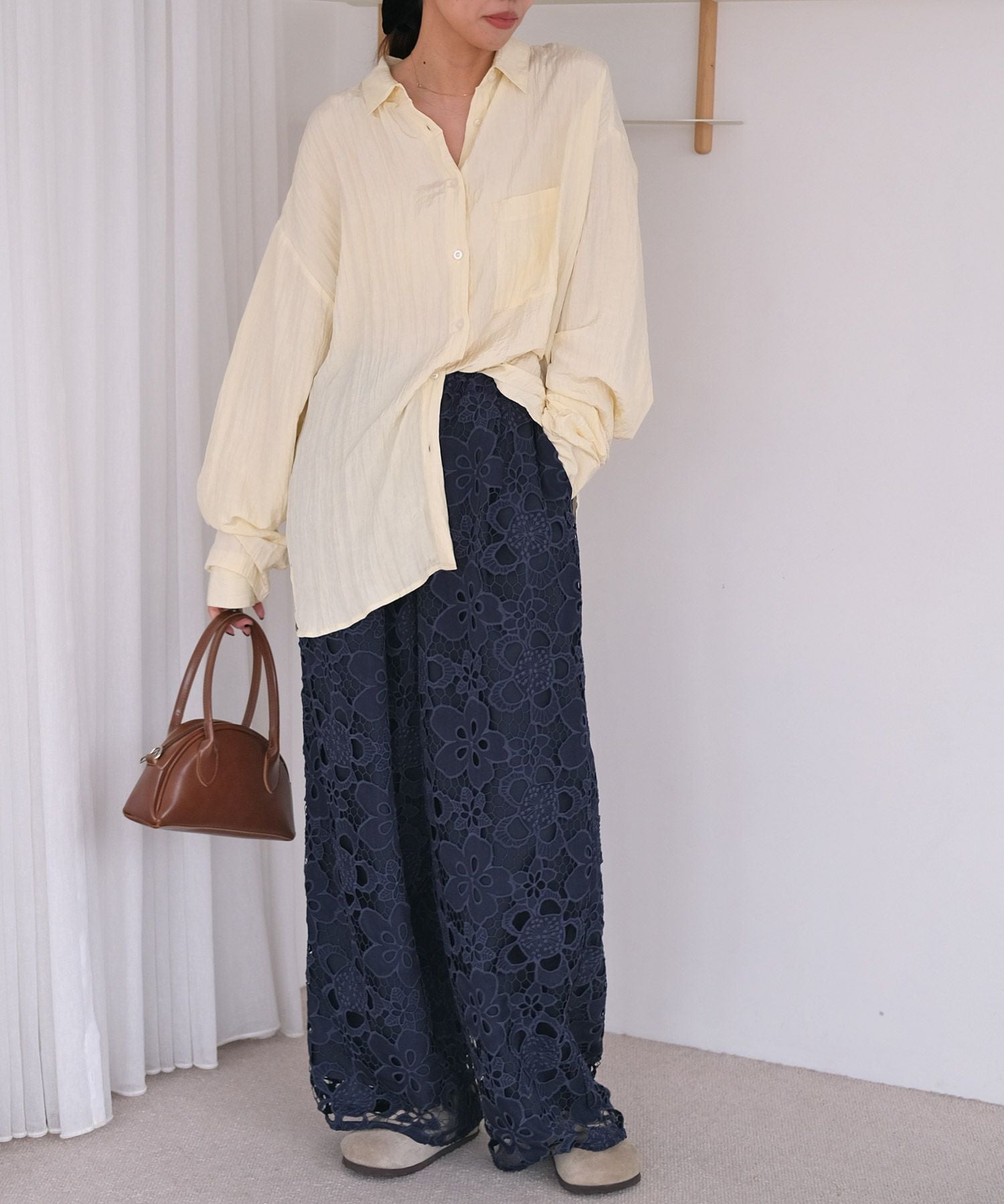 スタイリングに鮮度と存在感をプラスするレース素材のワイドパンツ