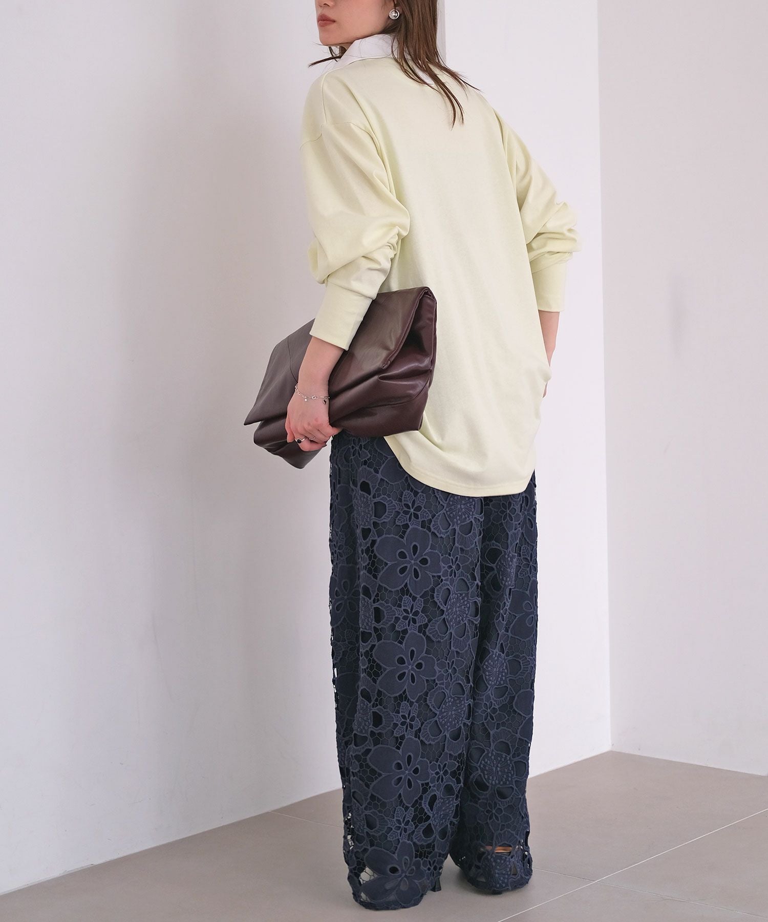 カットソーやスウェット、シャツなど幅広いトップスとのスタイリングを楽しめるのはもちろん、同素材のレースラガーシャツとセットアップでの着用もおすすめ。