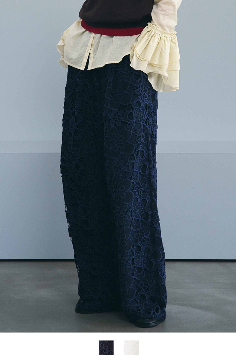 ケミカルレースを贅沢に全面に使用したワイドパンツ。