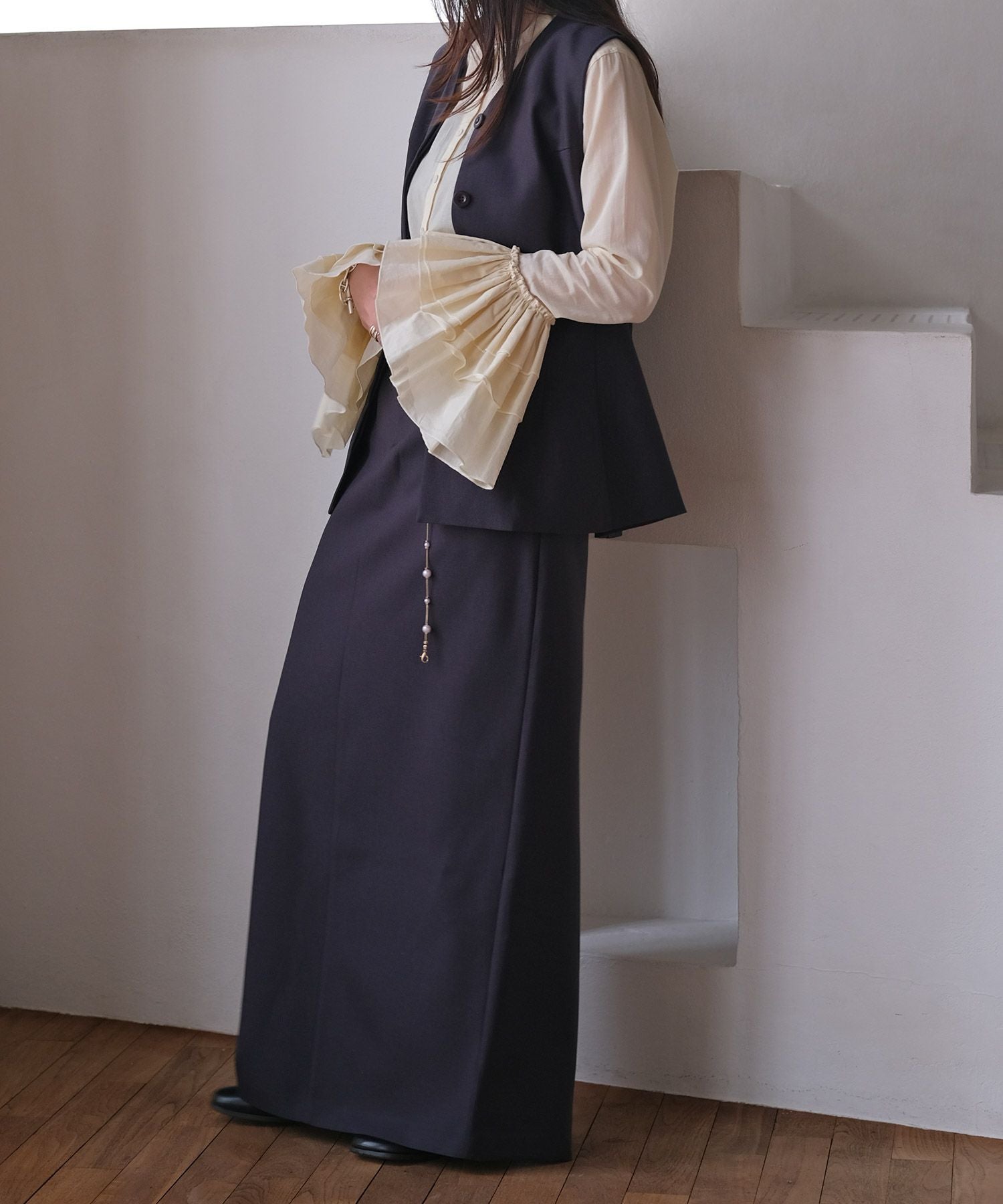腰回りは程よくフィットしつつ、直線的なIラインは女性らしさを引き立て、スタイルアップ効果も。