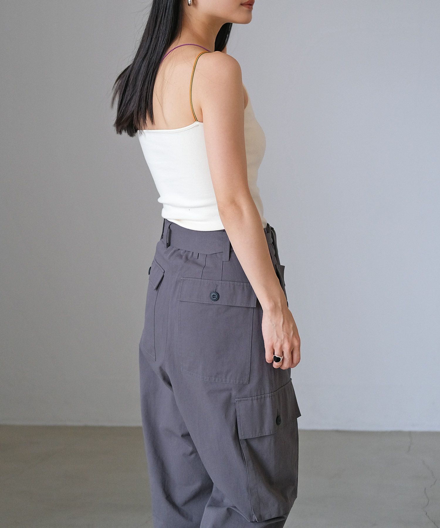 一枚で着ていただくのはもちろん、首元があいたトップスや、バックオープントップスのインナーとしてカラーストラップを見せるスタイリングもおすすめ。