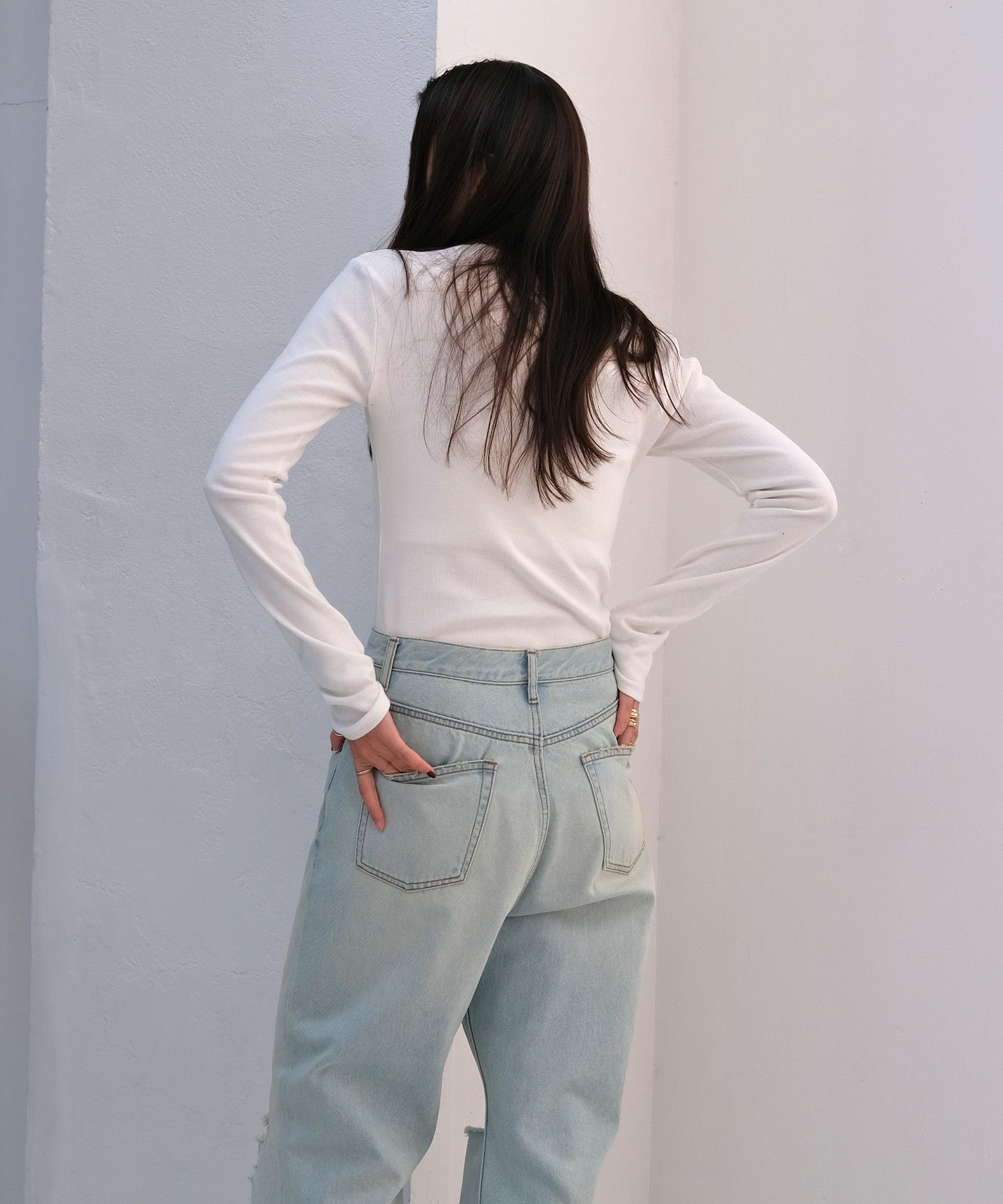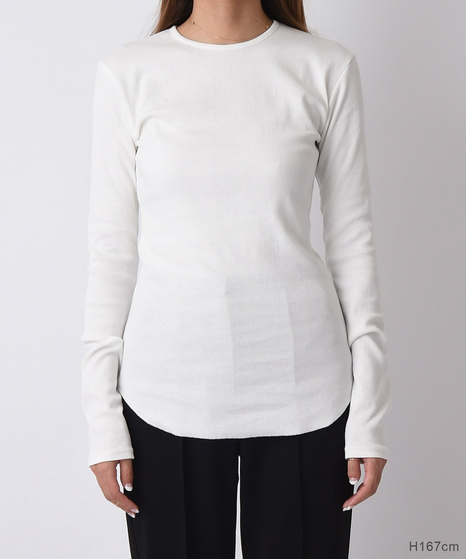 心地よくボディに沿うようなタイトなサイジングで、ボディラインをよりきれいに見せてくれます。