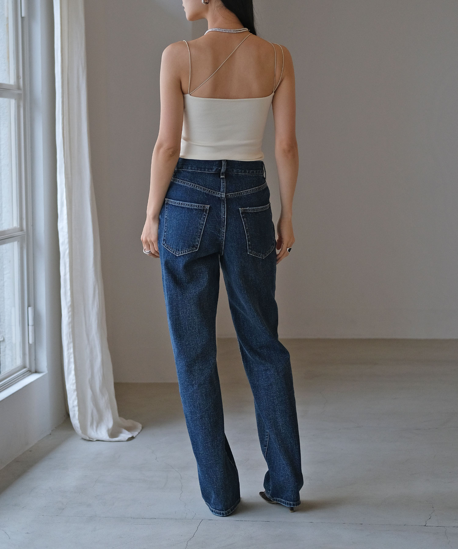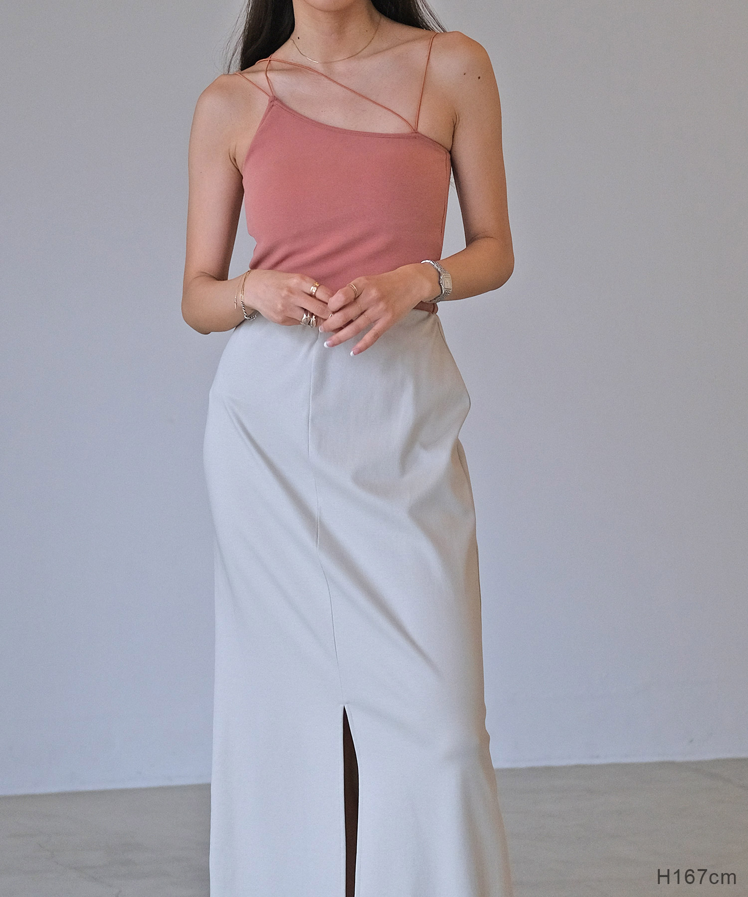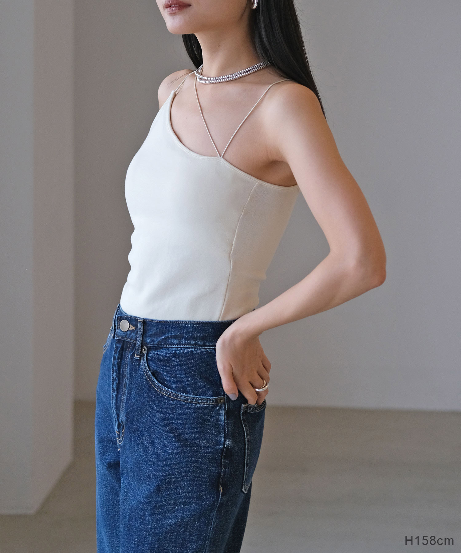 一枚で着ていただくのはもちろん、首元があいたトップスや、バックオープントップスのインナーとして、ランダムストラップを見せ、アクセントをプラスしたスタイリングもおすすめです。
