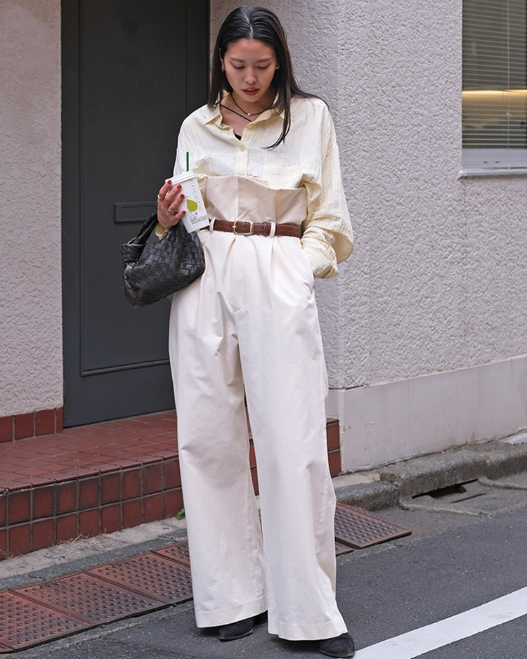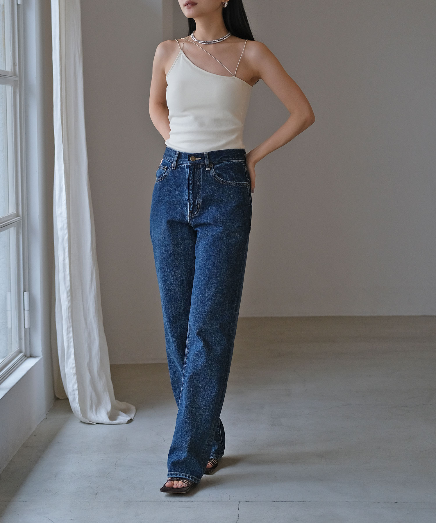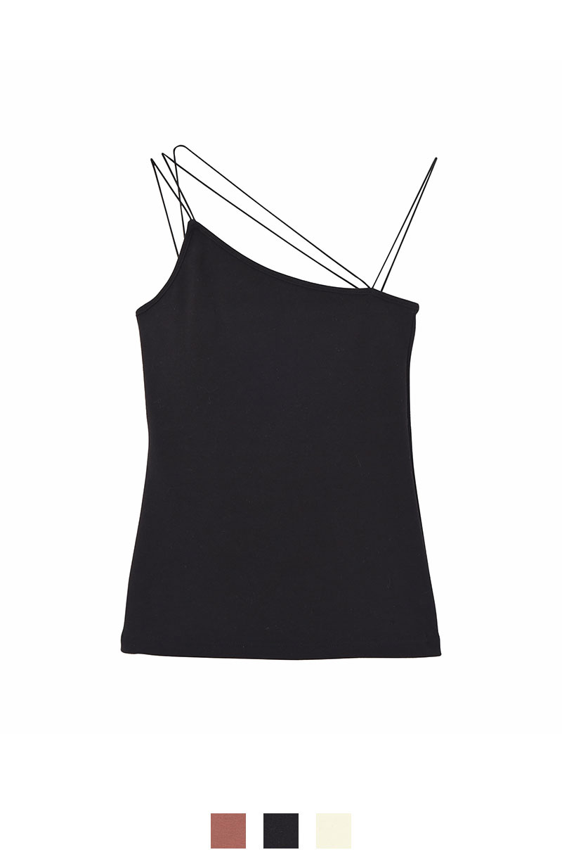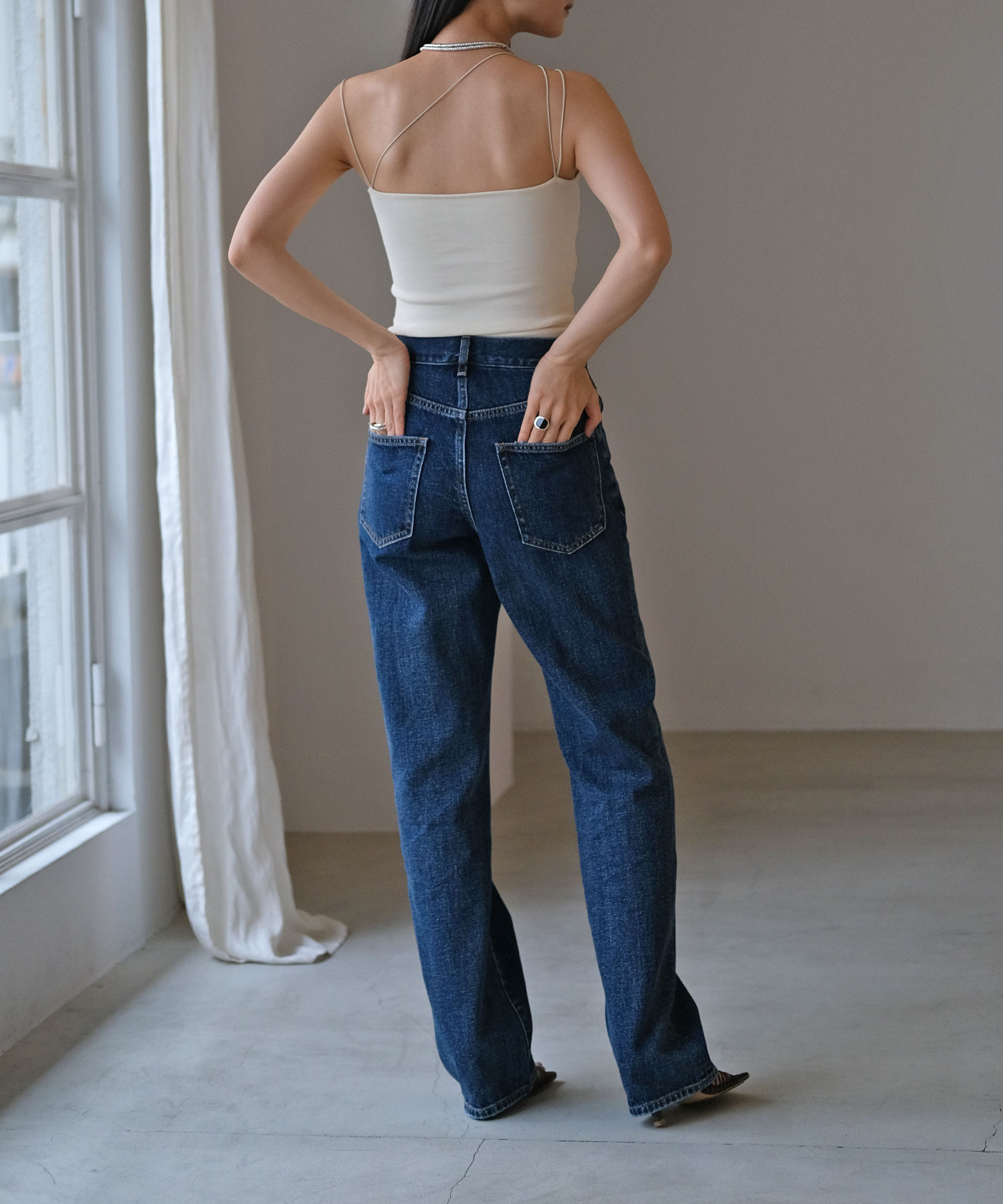 一枚で着ていただくのはもちろん、首元があいたトップスや、バックオープントップスのインナーとして、ランダムストラップを見せ、アクセントをプラスしたスタイリングもおすすめです。