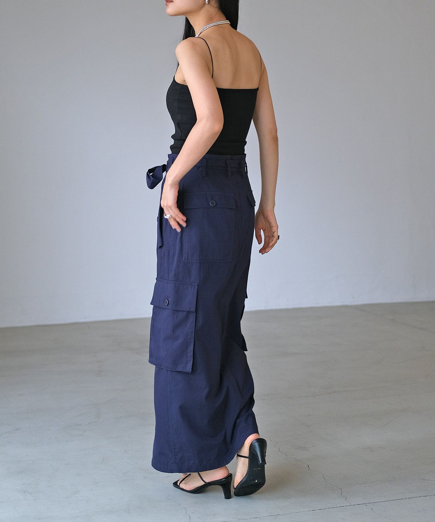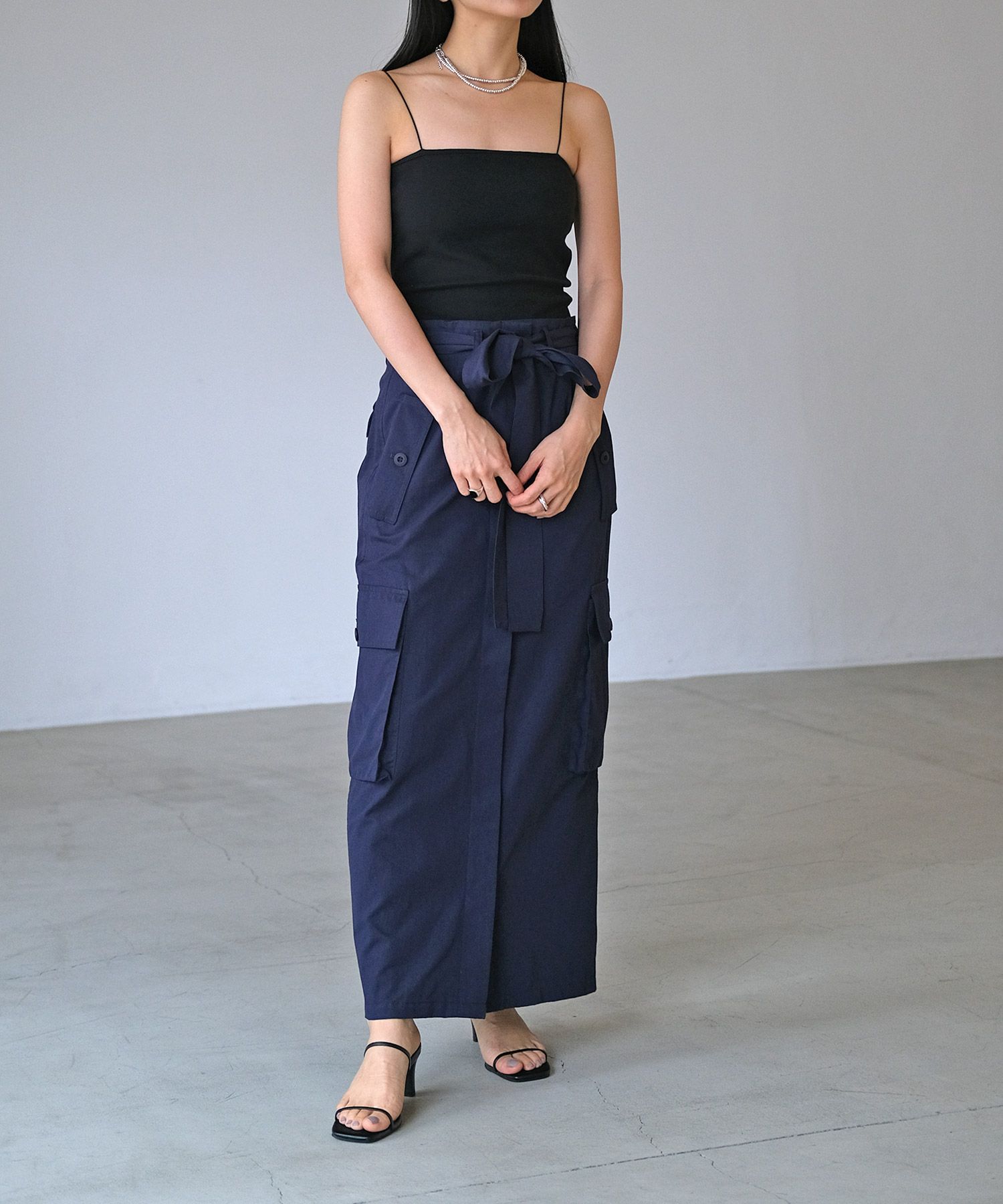 細めのストラップがデコルテや肩周りを華奢に見せ、女性らしさを感じる一枚。