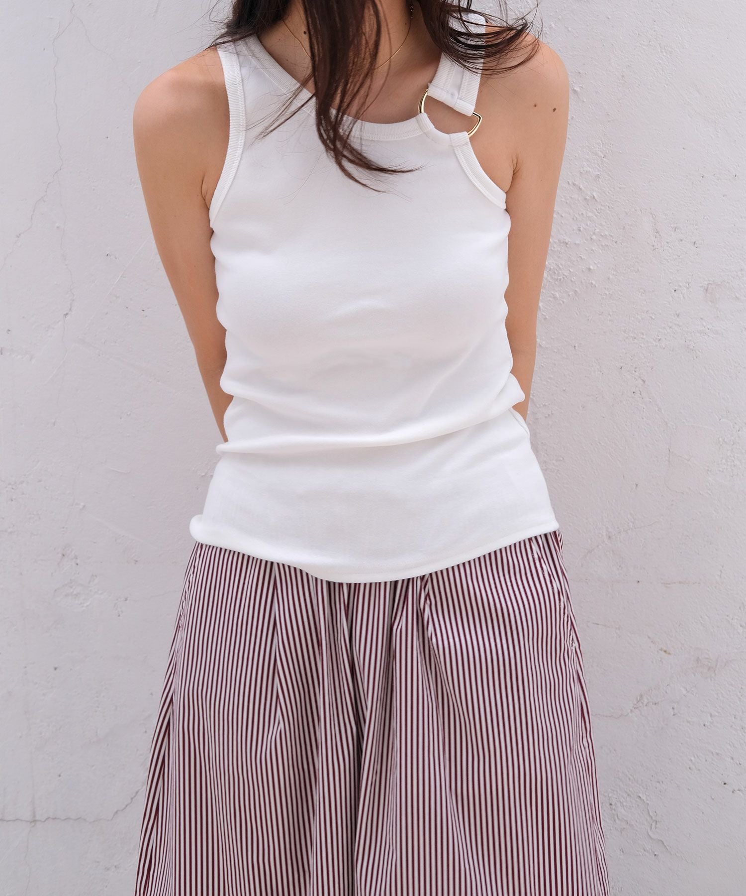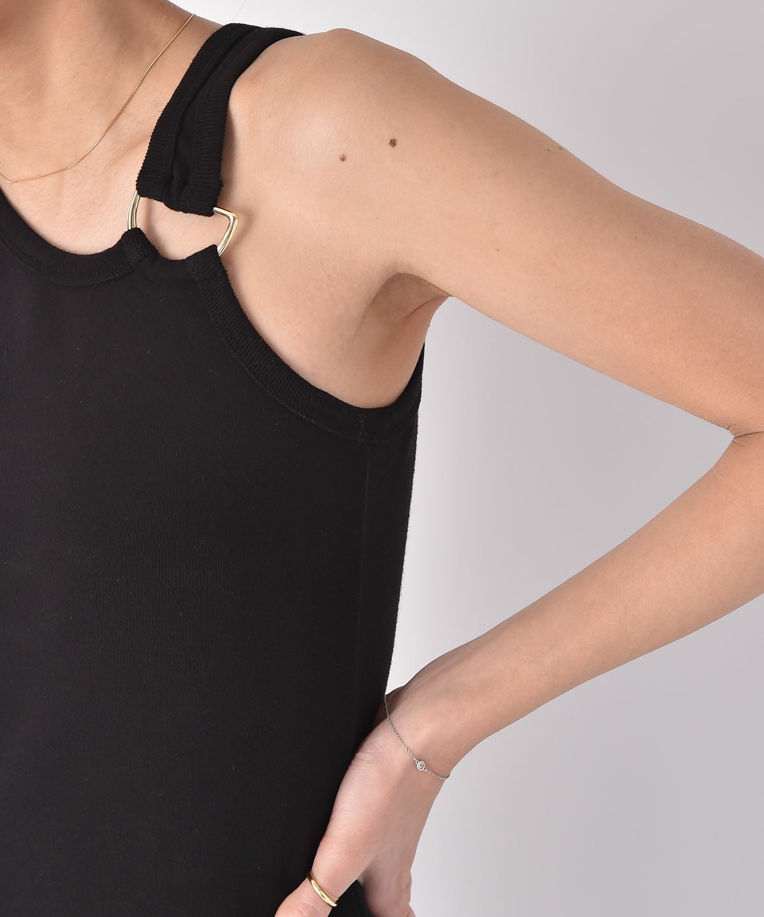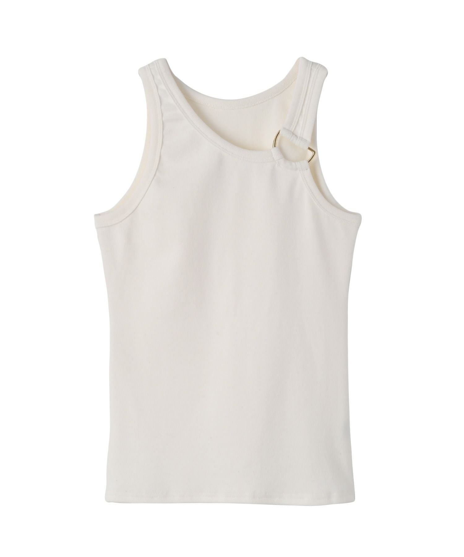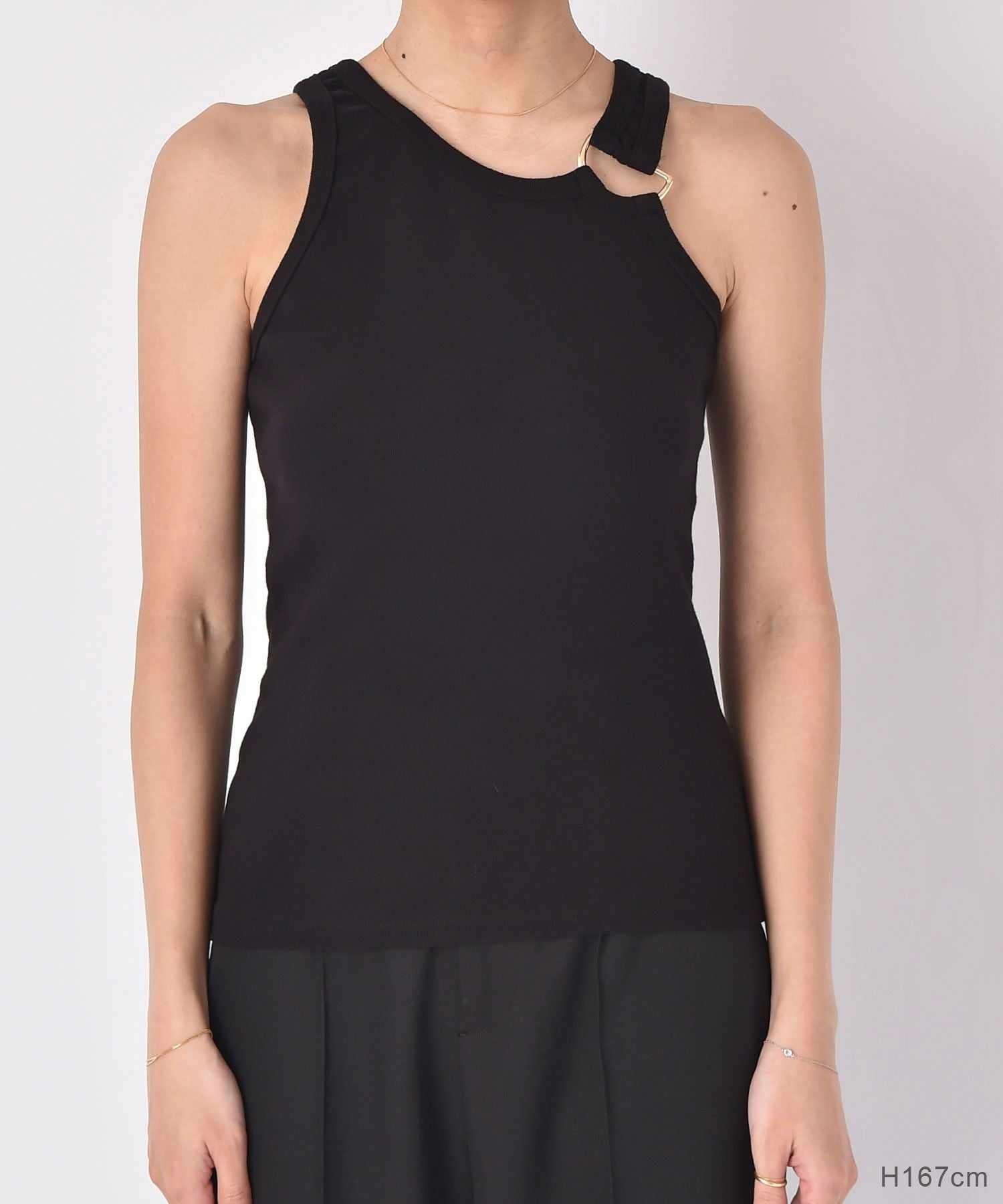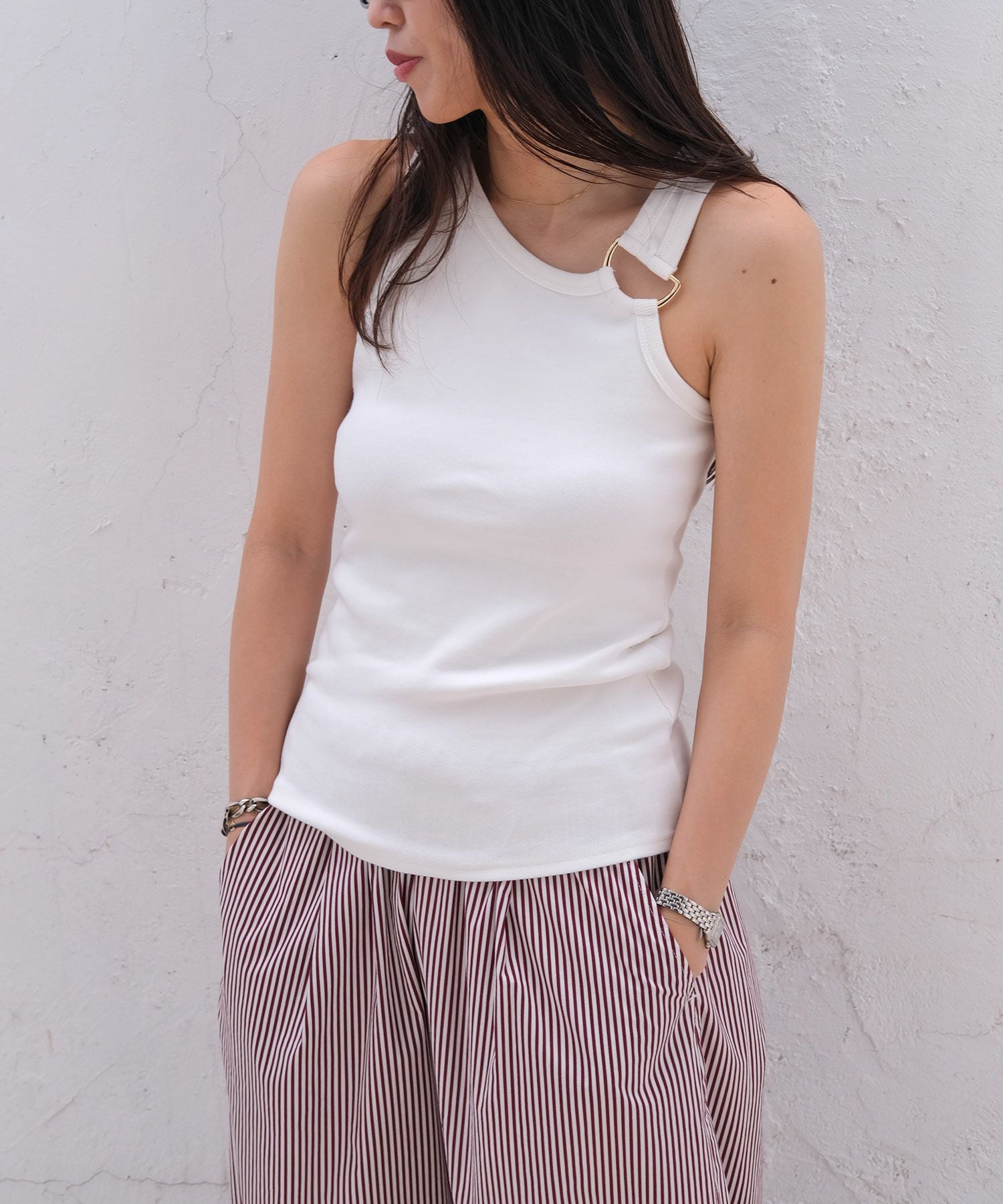 シンプルなデザインに引き立つメタルリングがタンクトップをモードにブラッシュアップ
