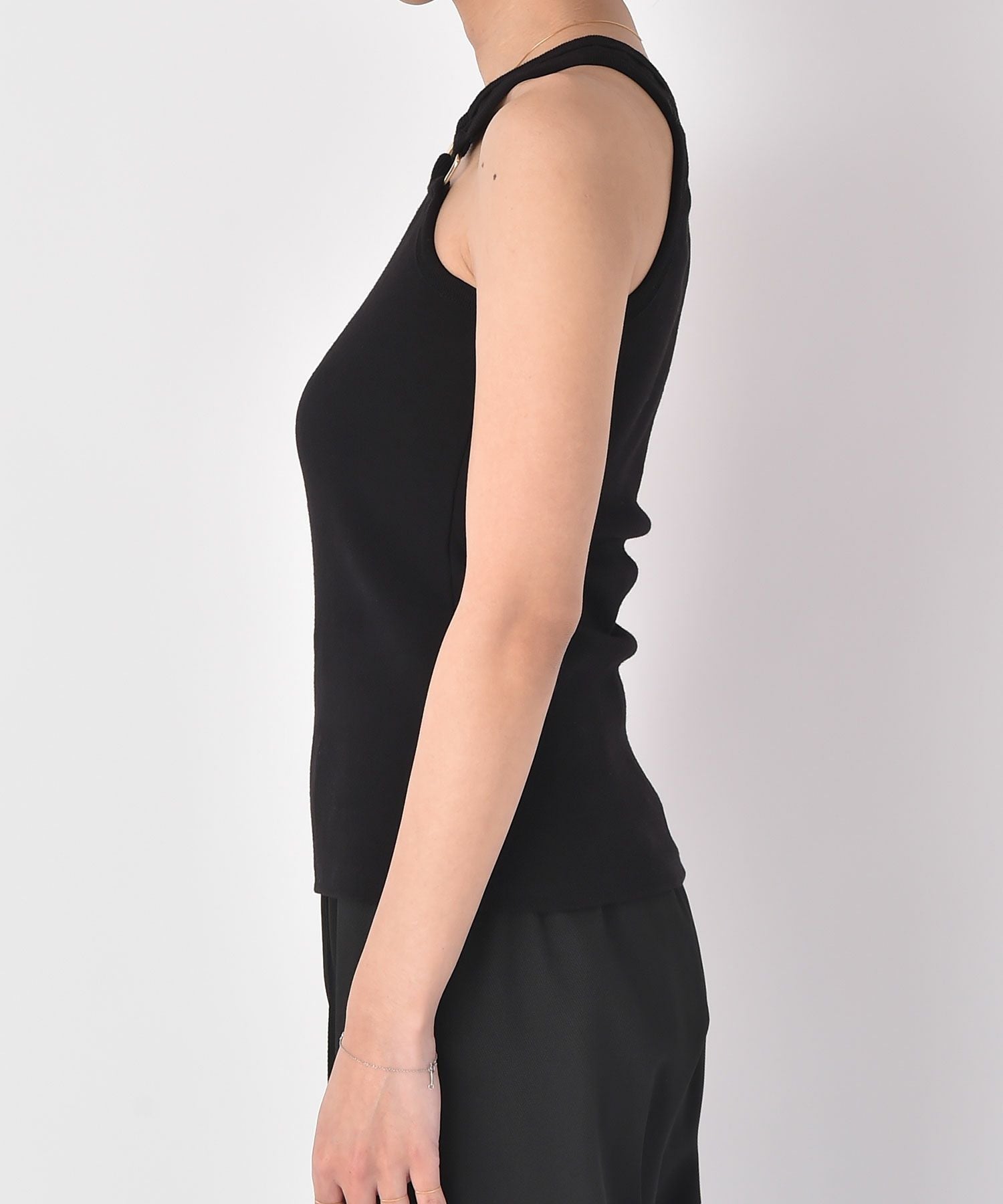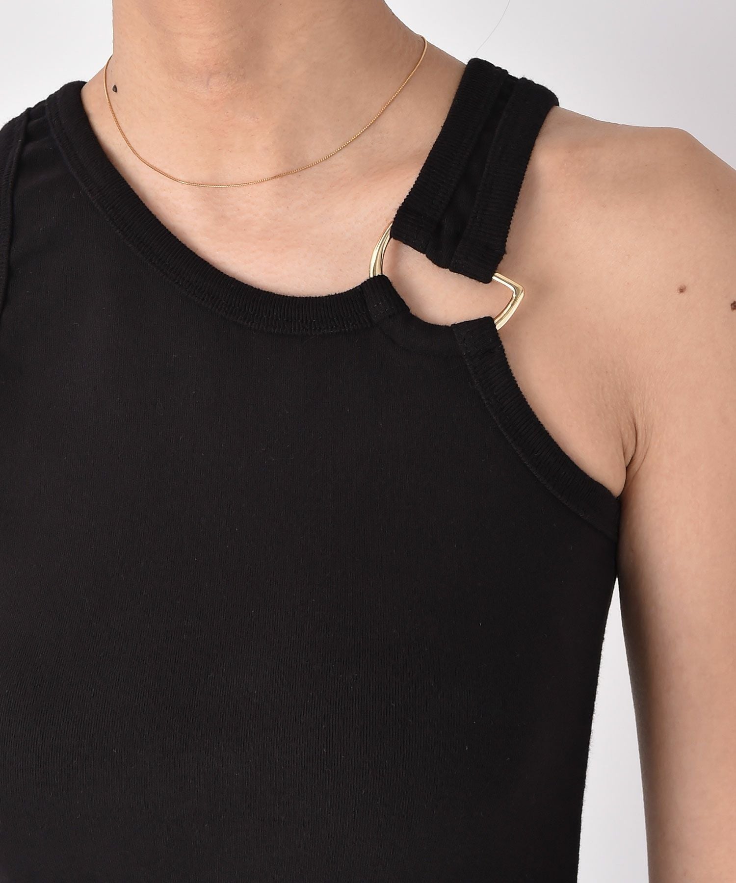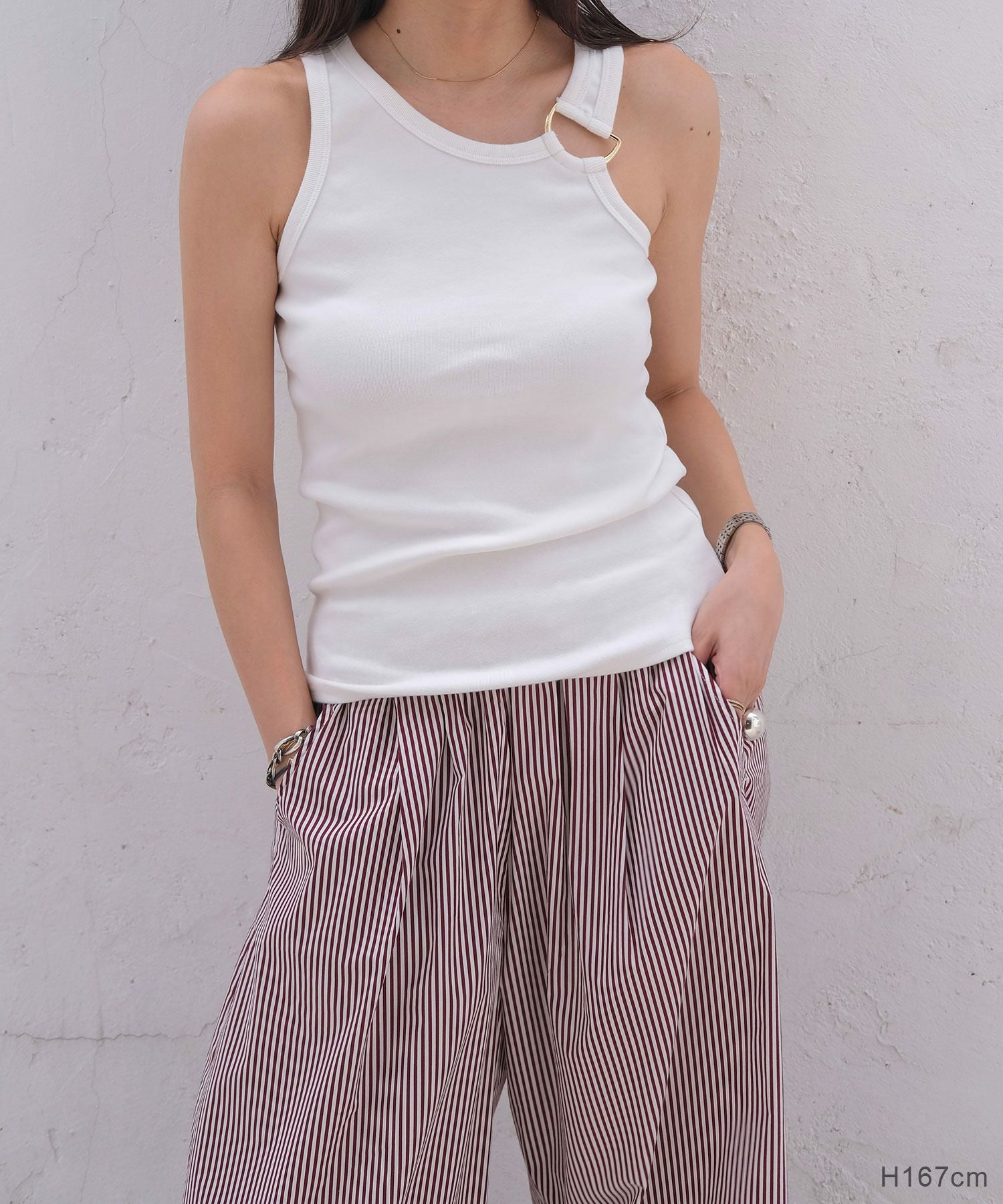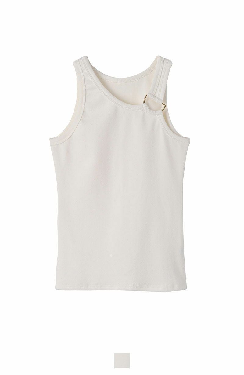 シンプルなデザインに引き立つメタルリングがタンクトップをモードにブラッシュアップ