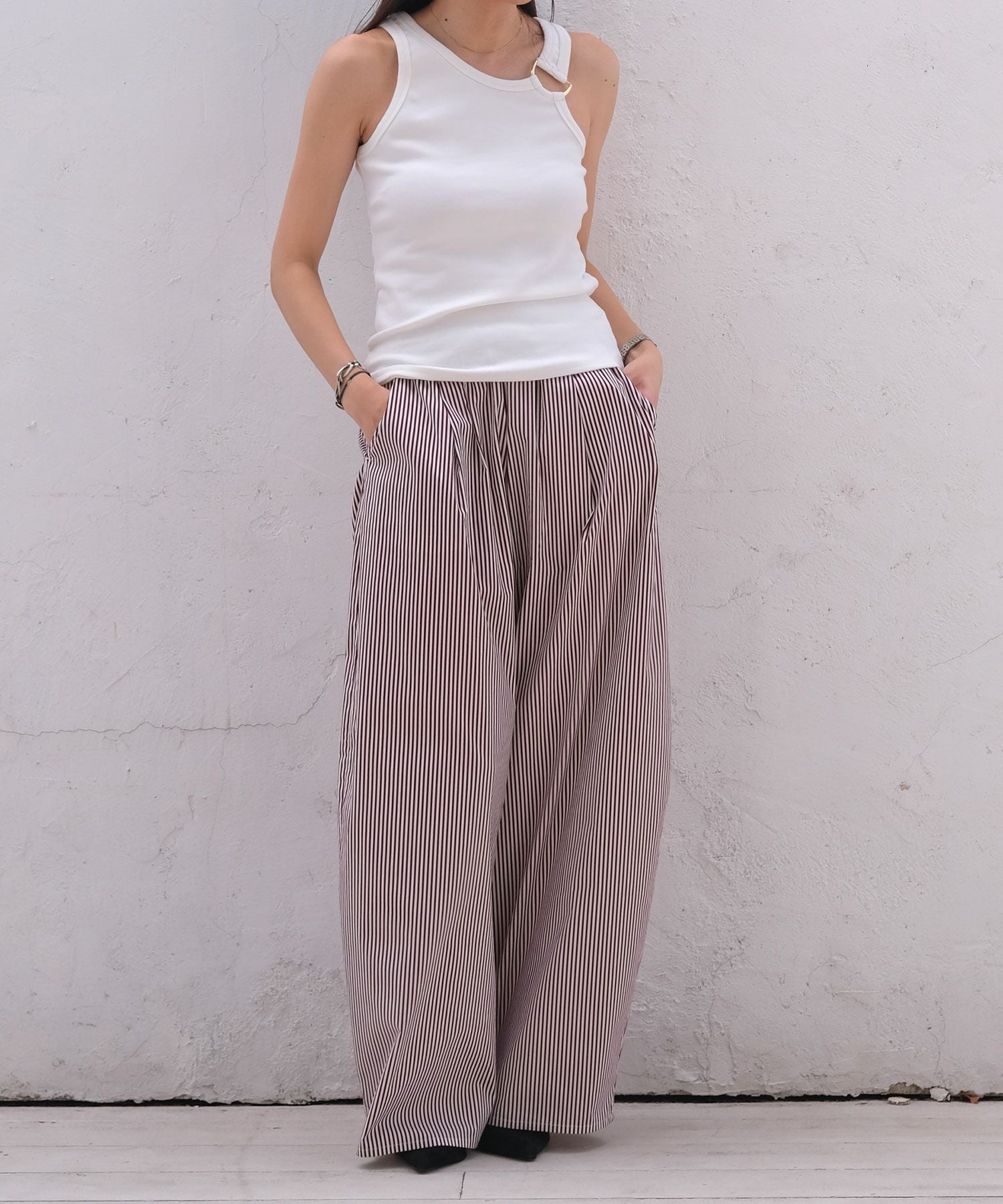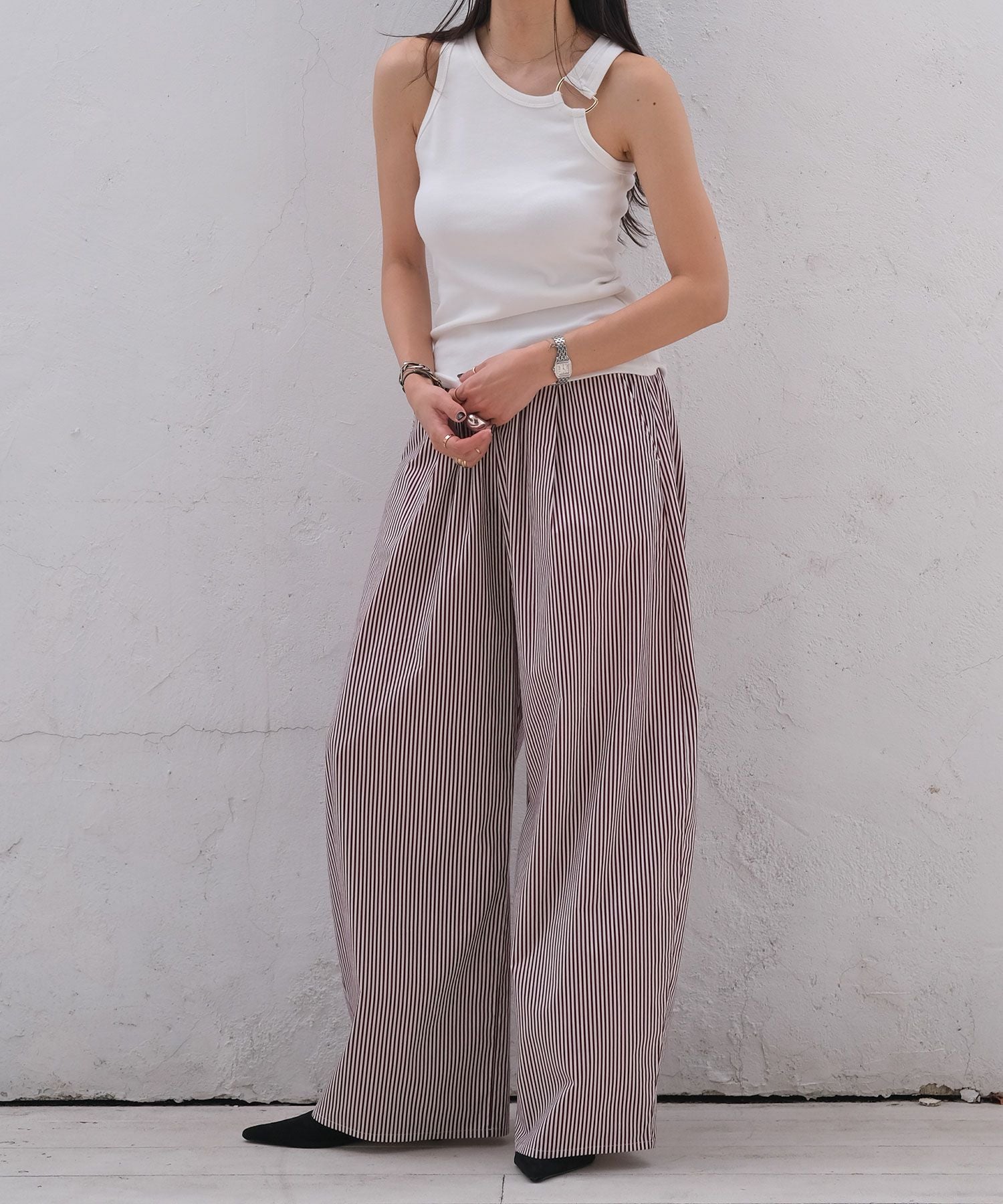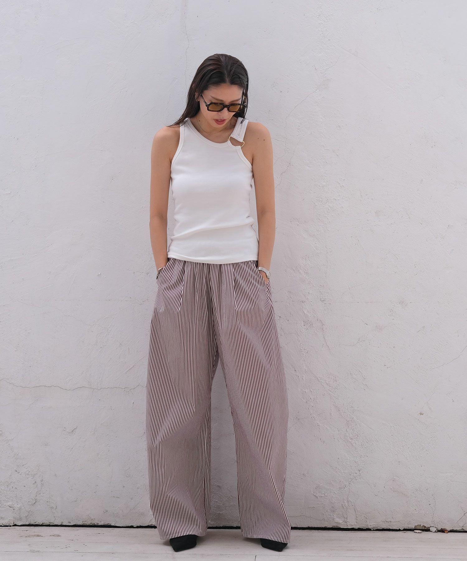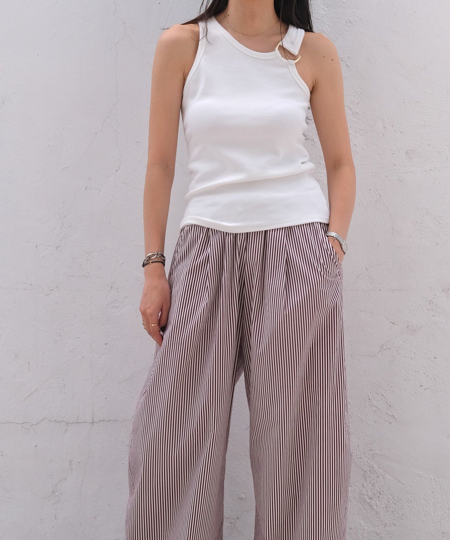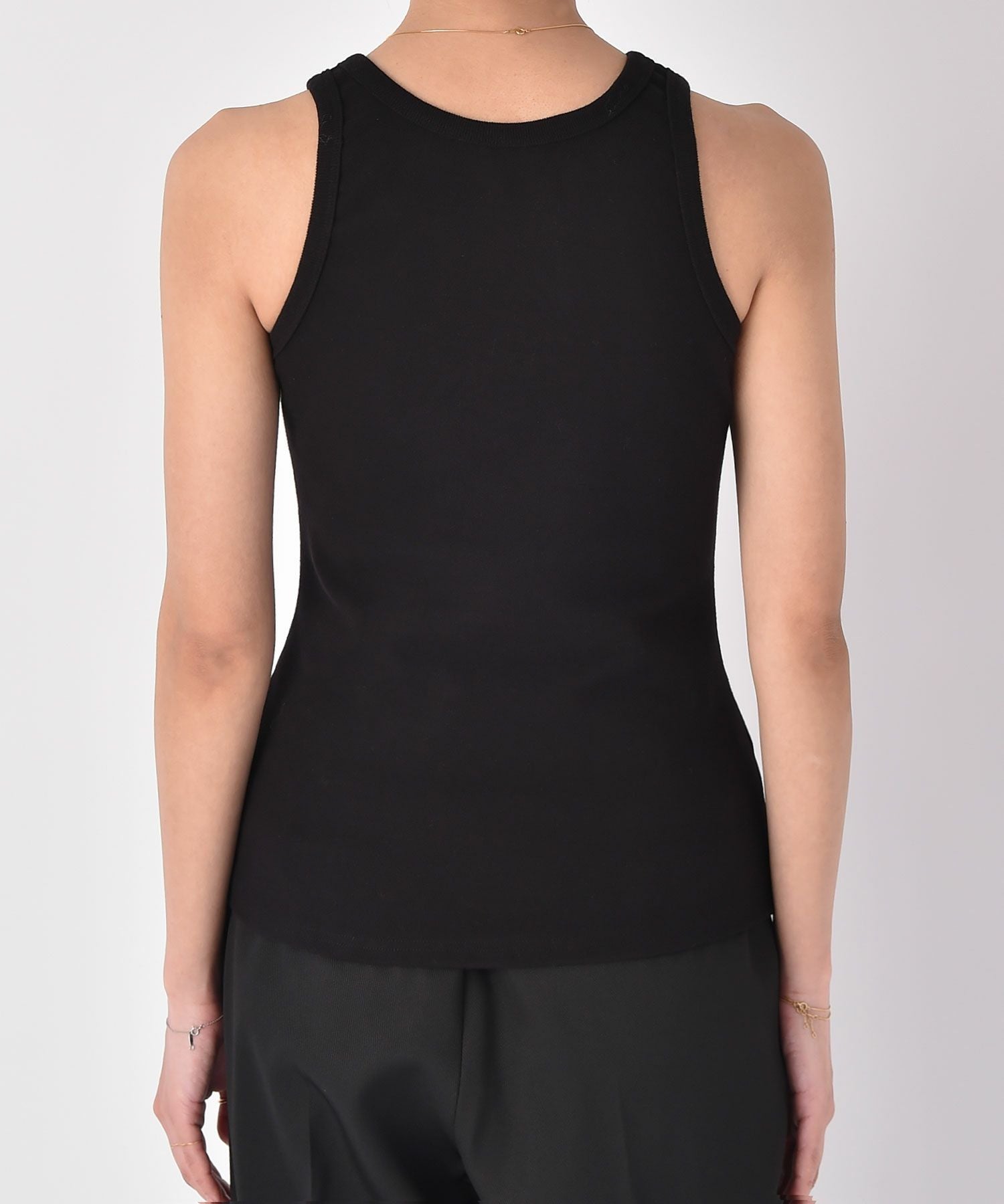 シンプルなデザインに引き立つメタルリングがタンクトップをモードにブラッシュアップ
