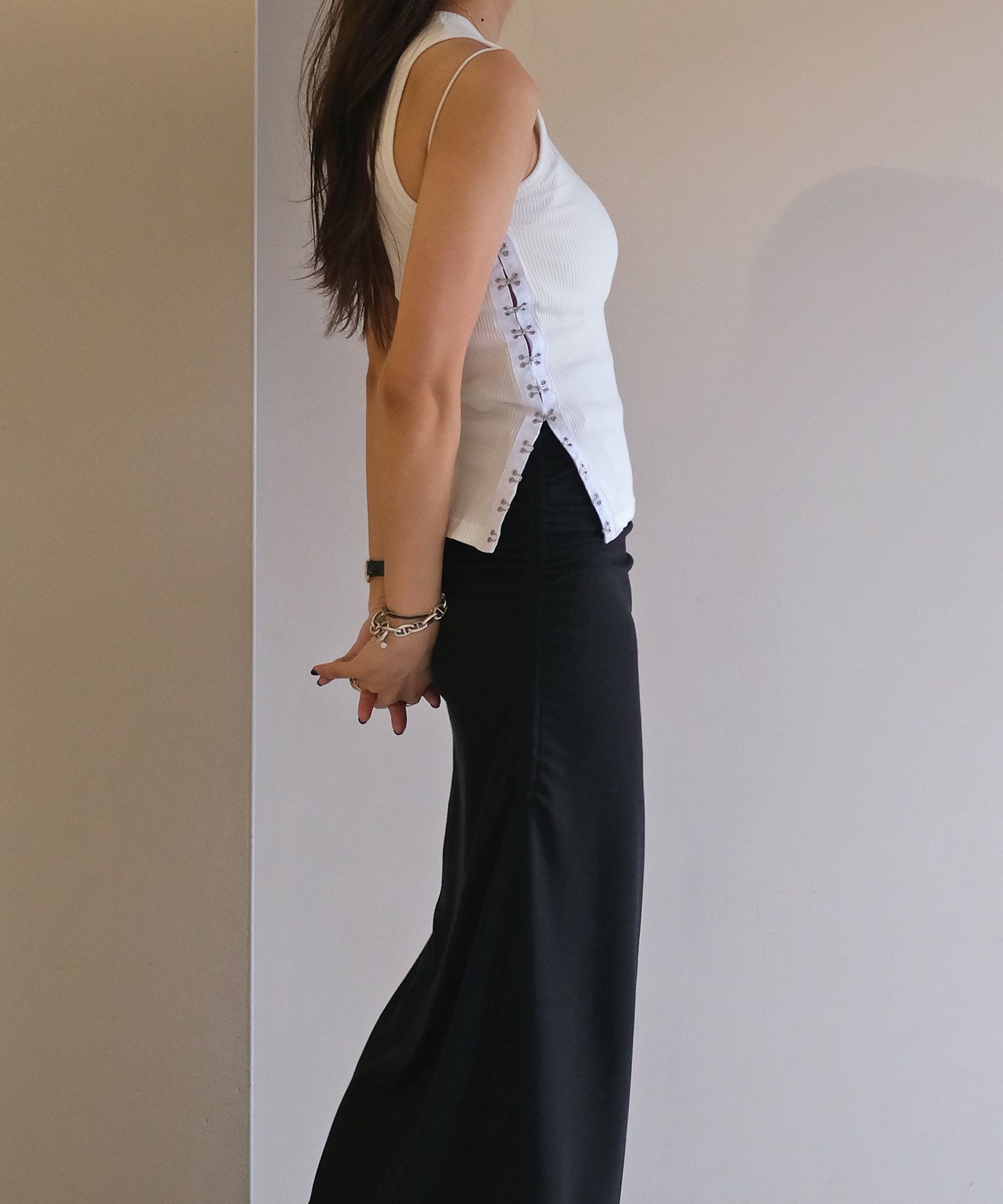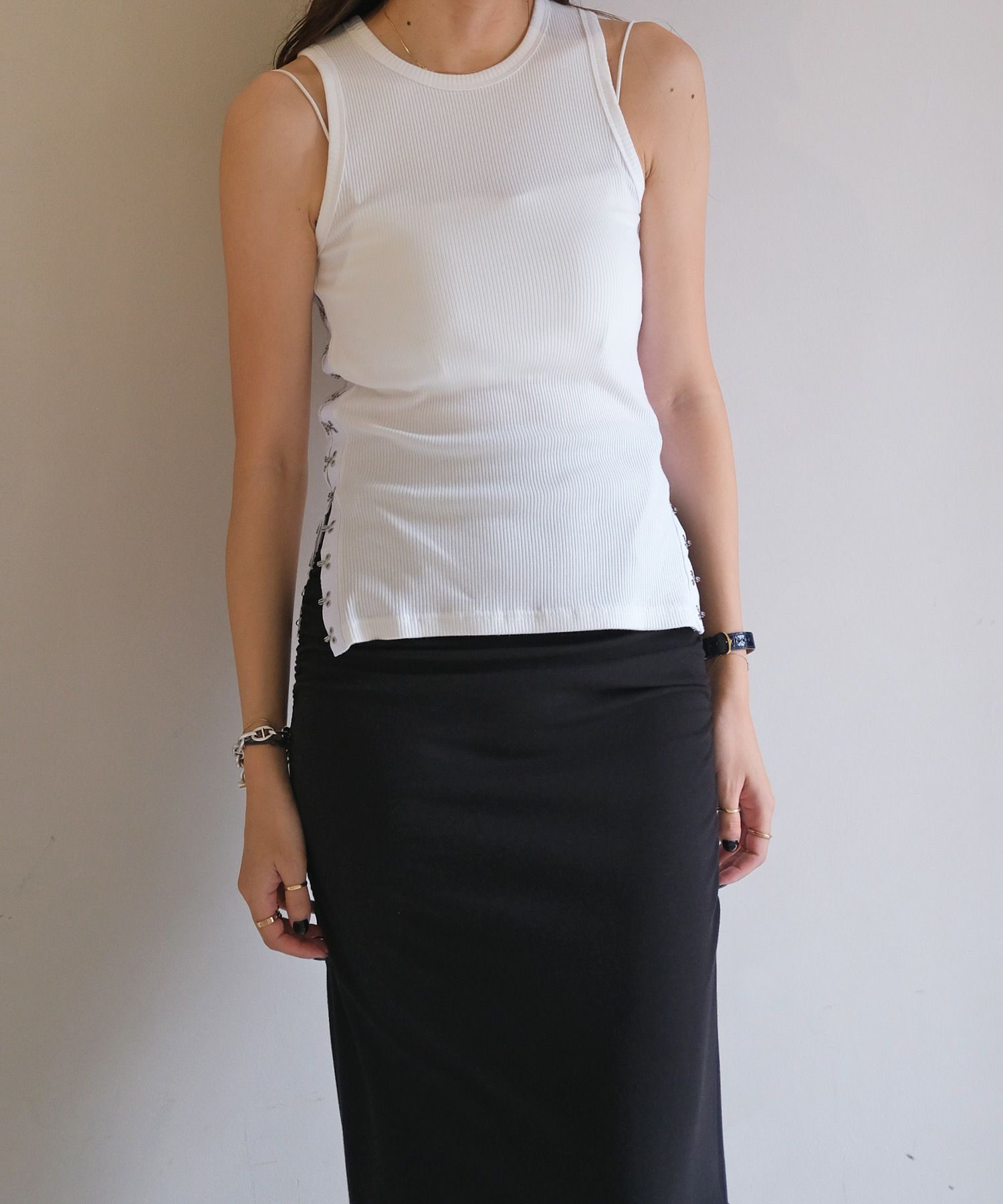 サイドホックがモード感をプラス、ワンツーコーデも怖くないデザインタンクトップ