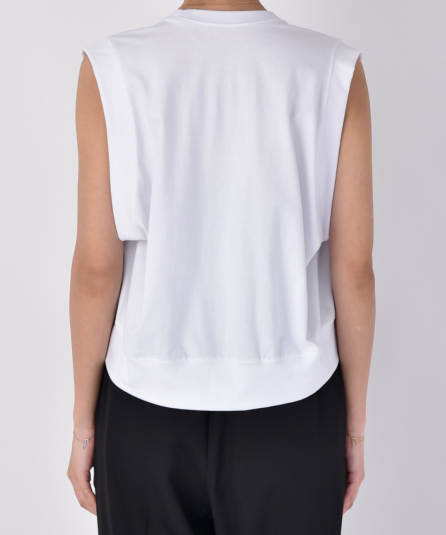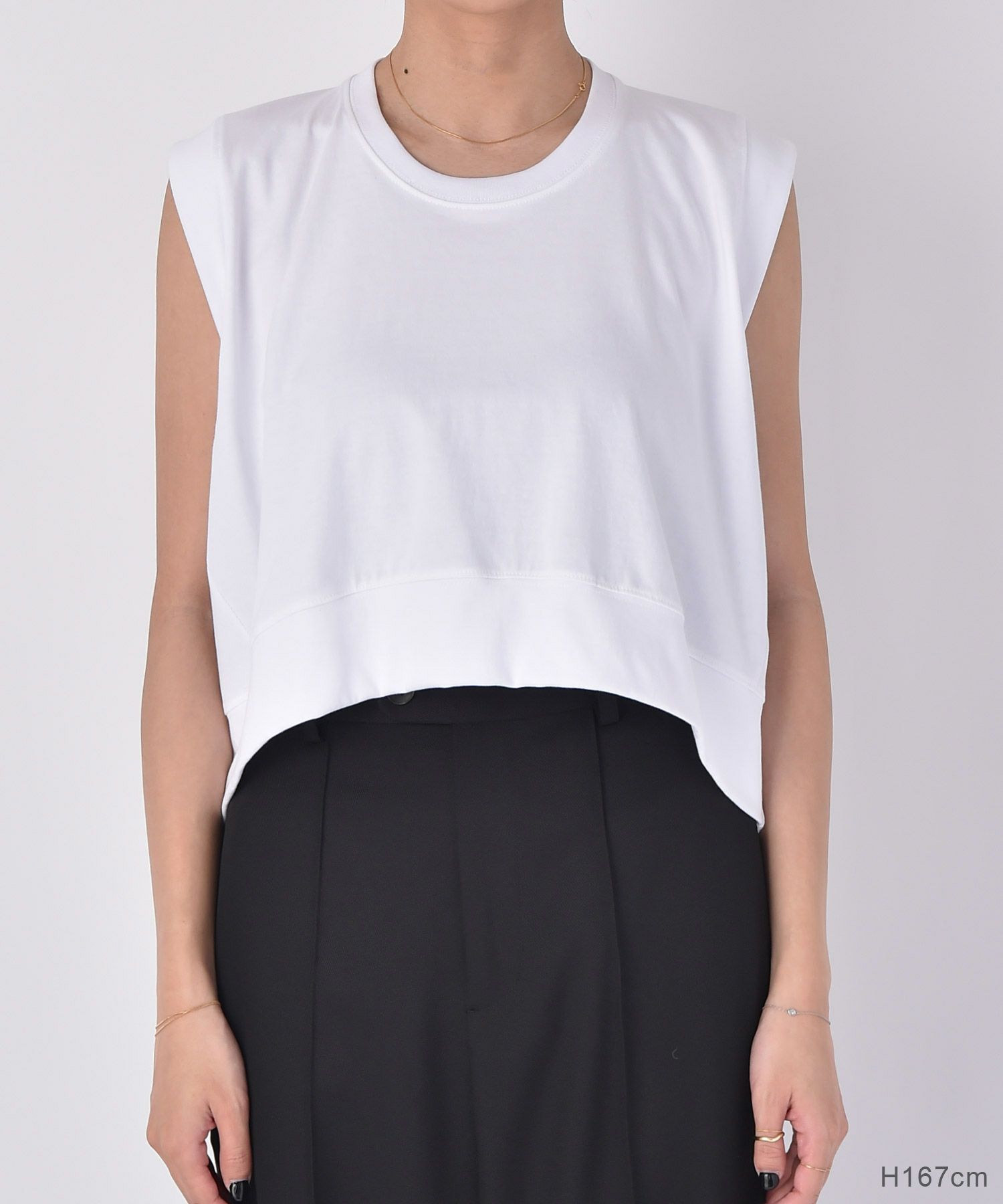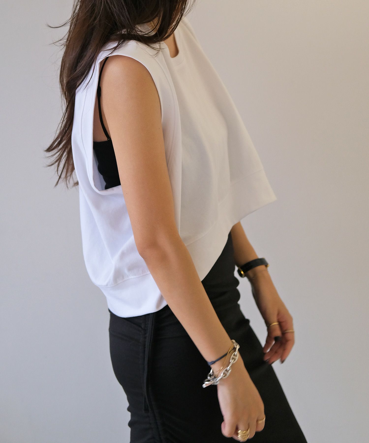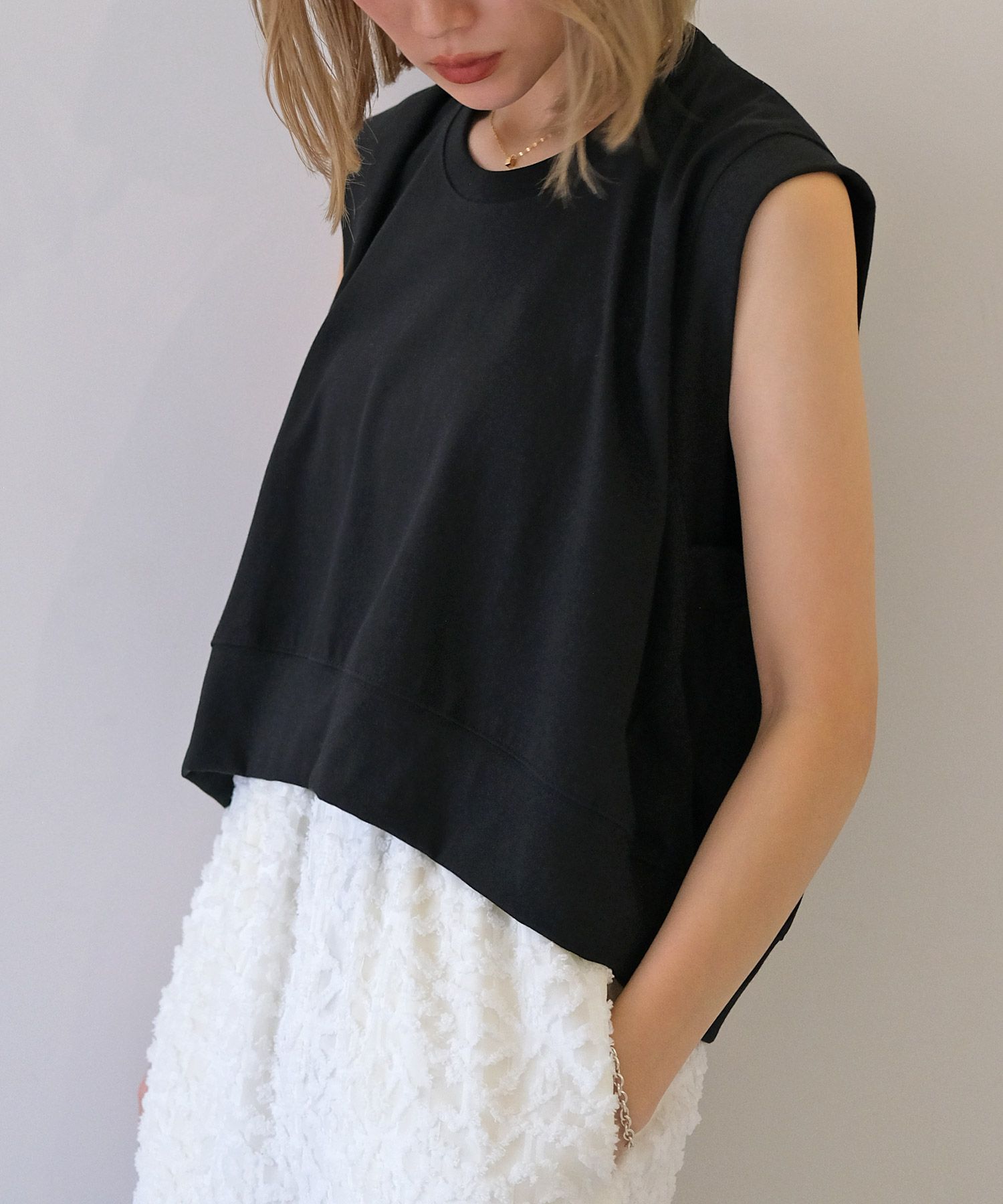 立体的なシルエットでメリハリの効いたデザインが魅力のショートカットソープルオーバーが、スリーブレスになって登場。