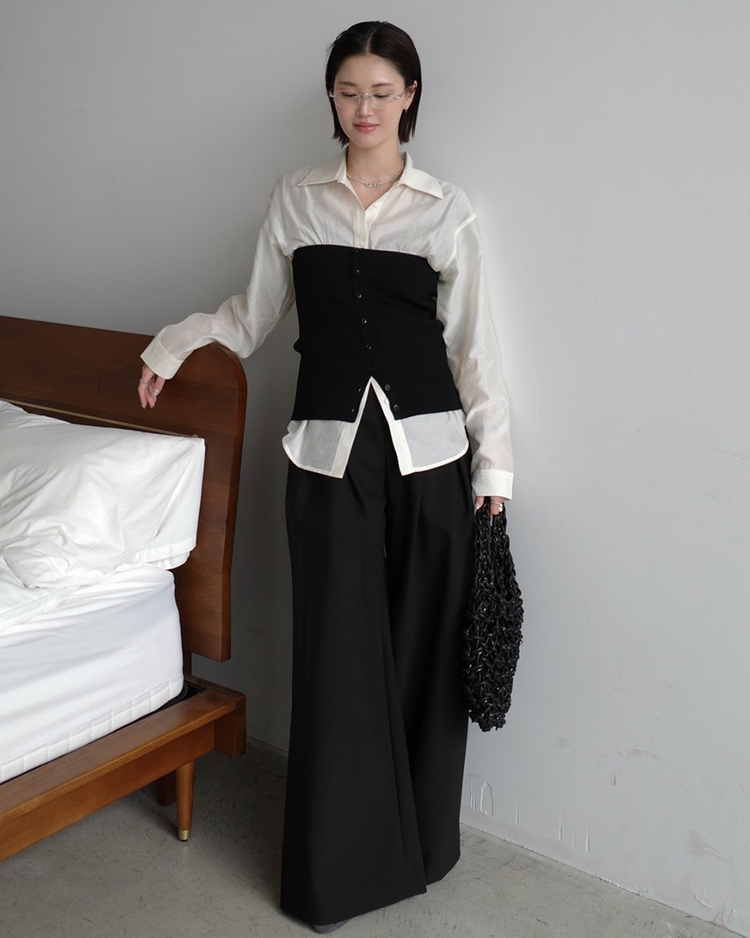 レイヤードスタイルで鮮度の高い着こなしに仕上がる二ットビスチェ。