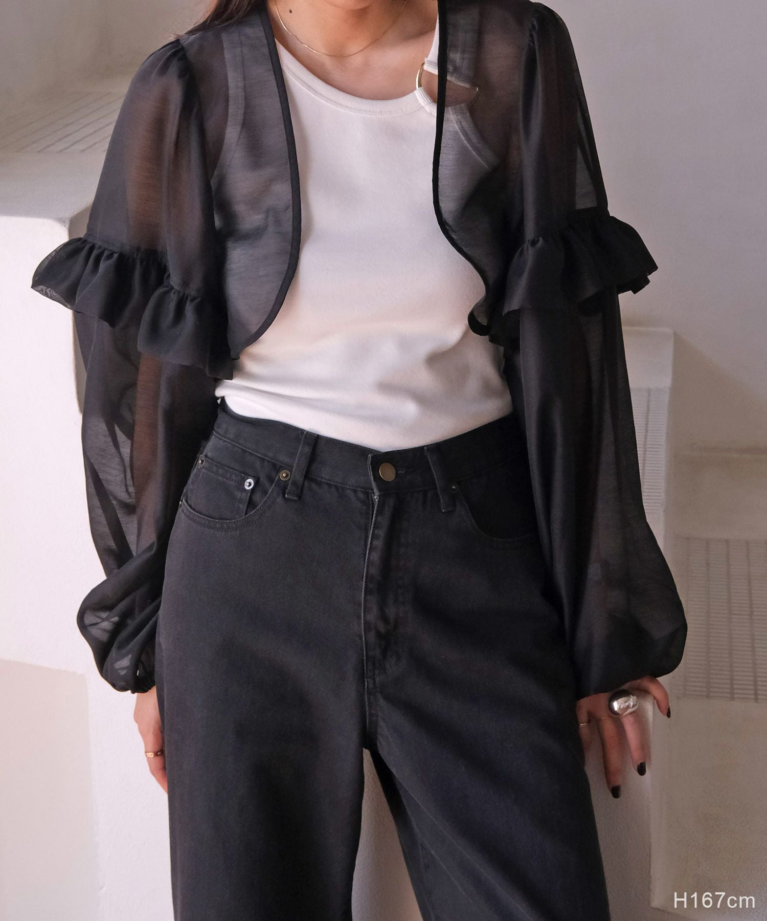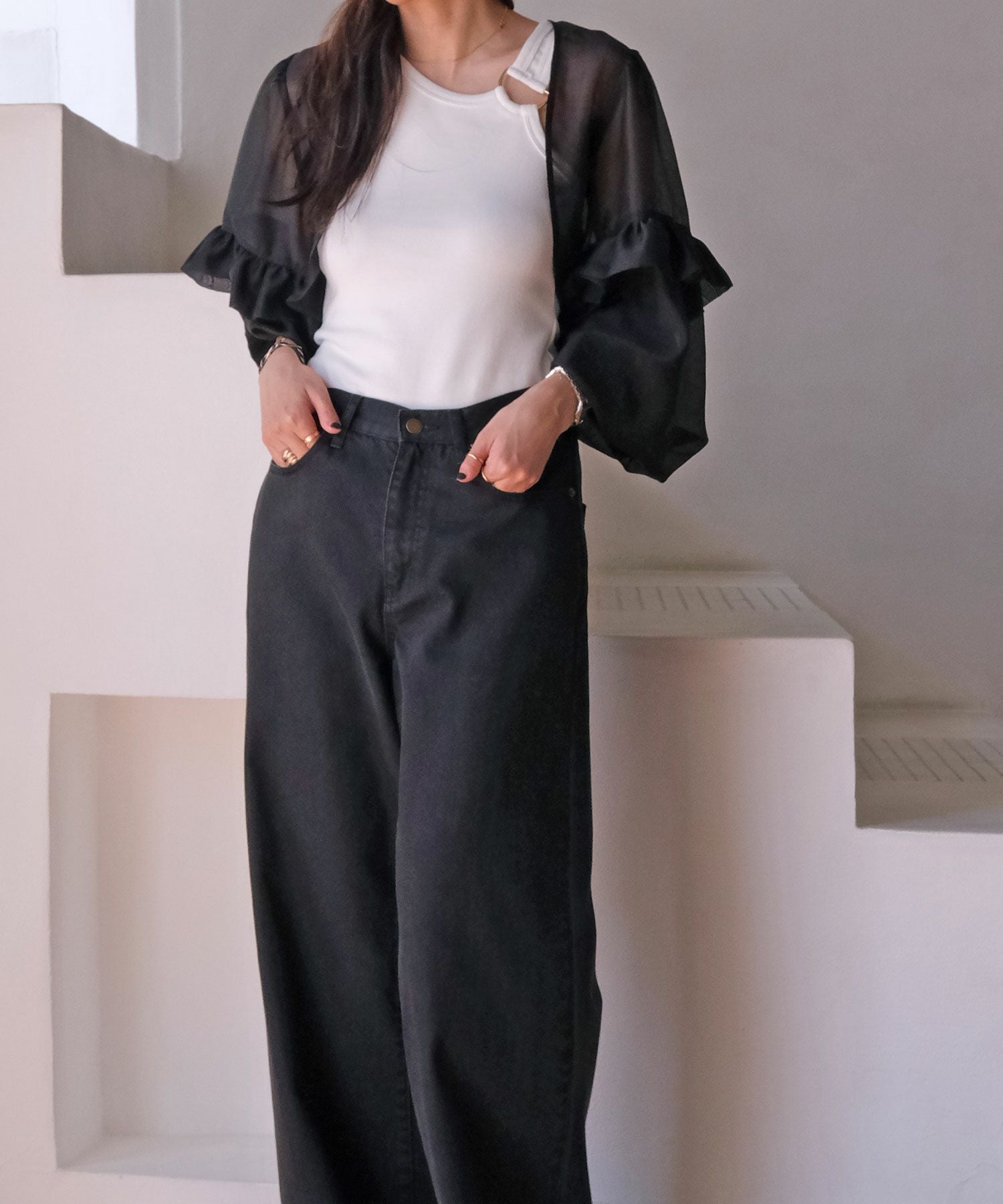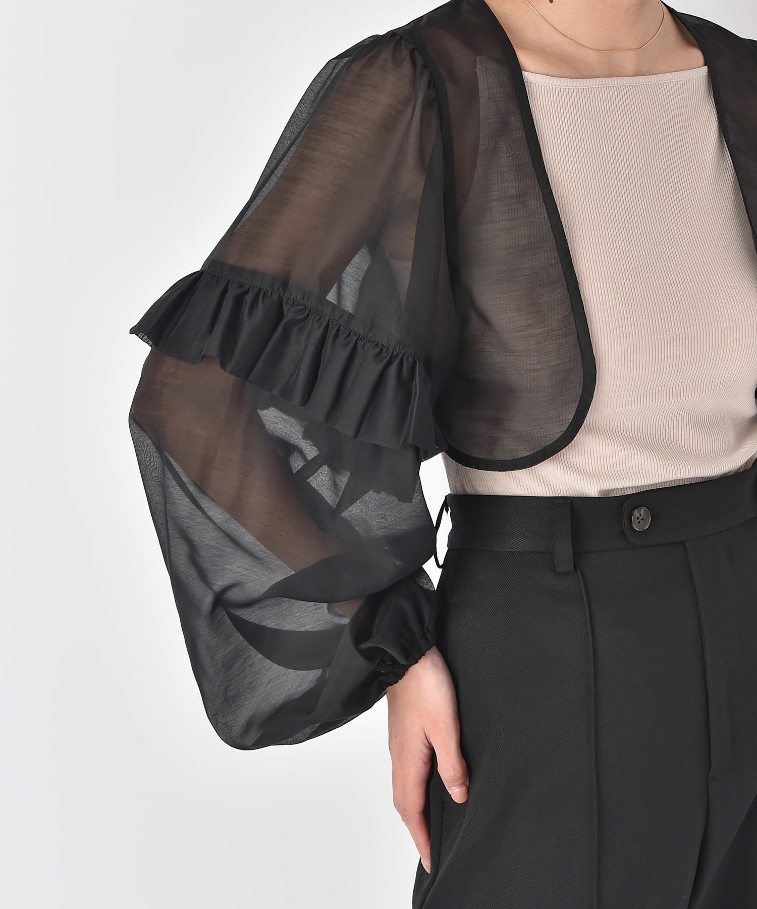 ブラックはシアーな素材なので、センシュアルな雰囲気を感じ、オケージョンシーンの羽織りとしてもぴったり。