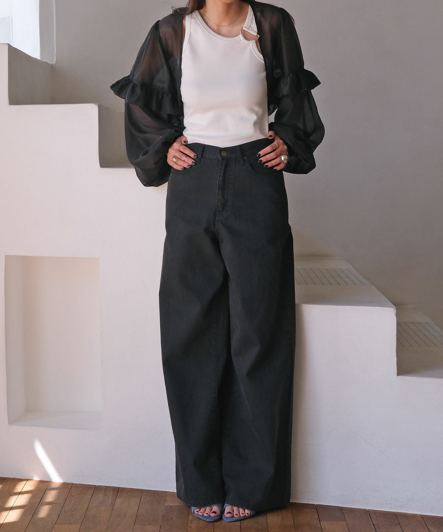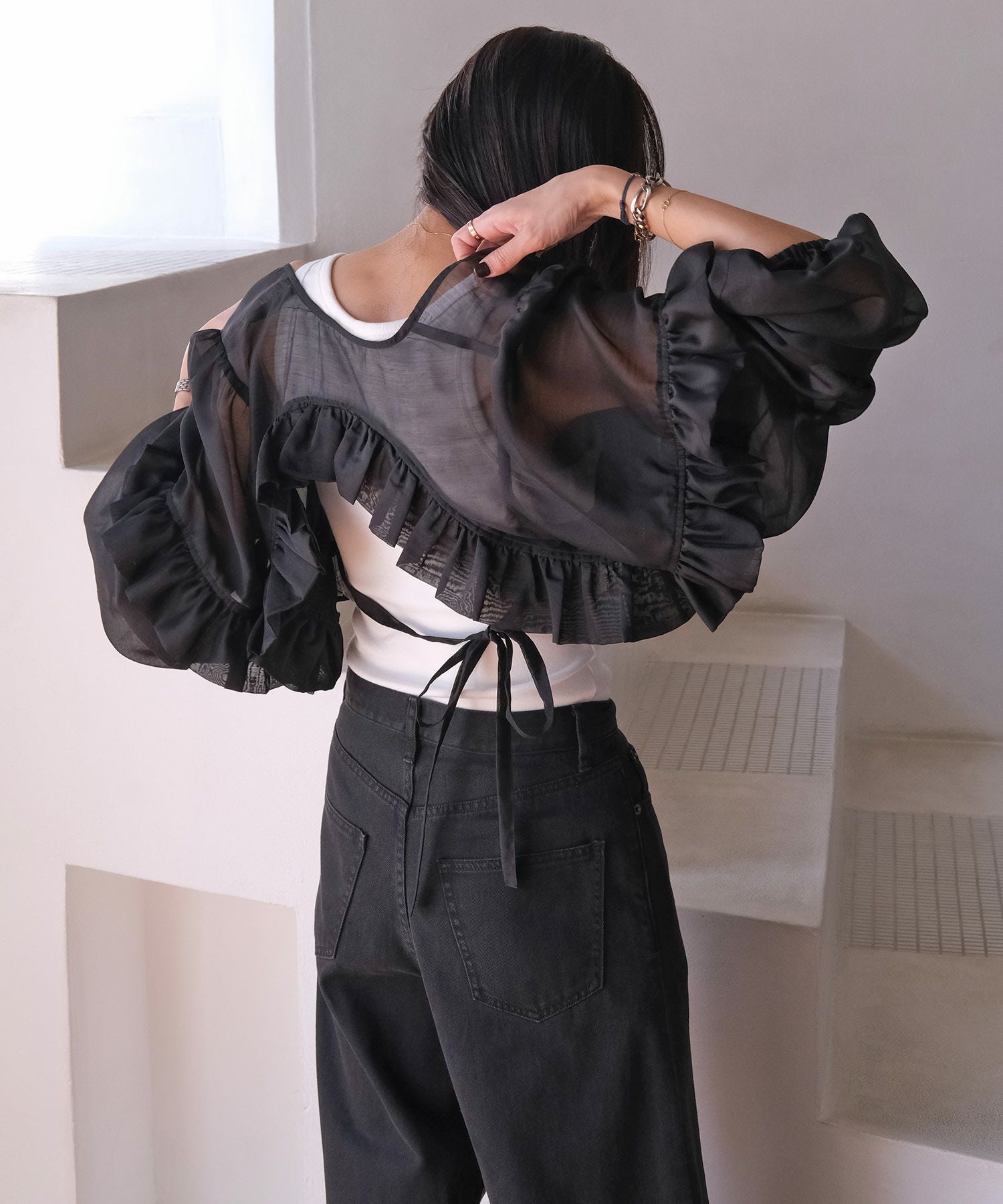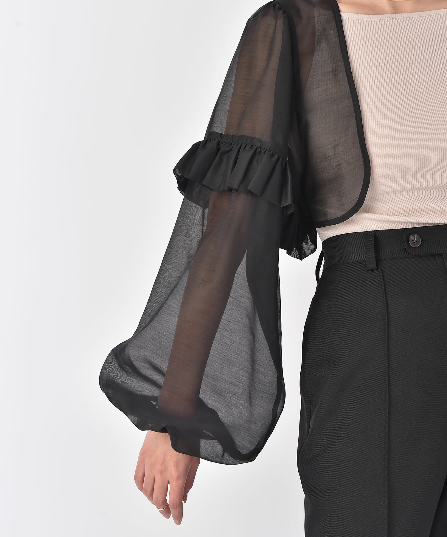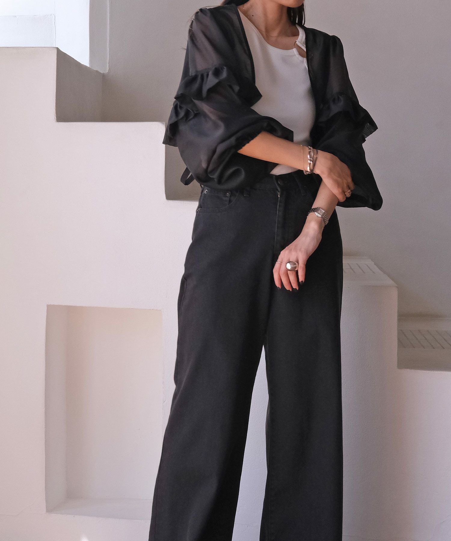 ブラックはシアーな素材なので、センシュアルな雰囲気を感じ、オケージョンシーンの羽織りとしてもぴったり。
