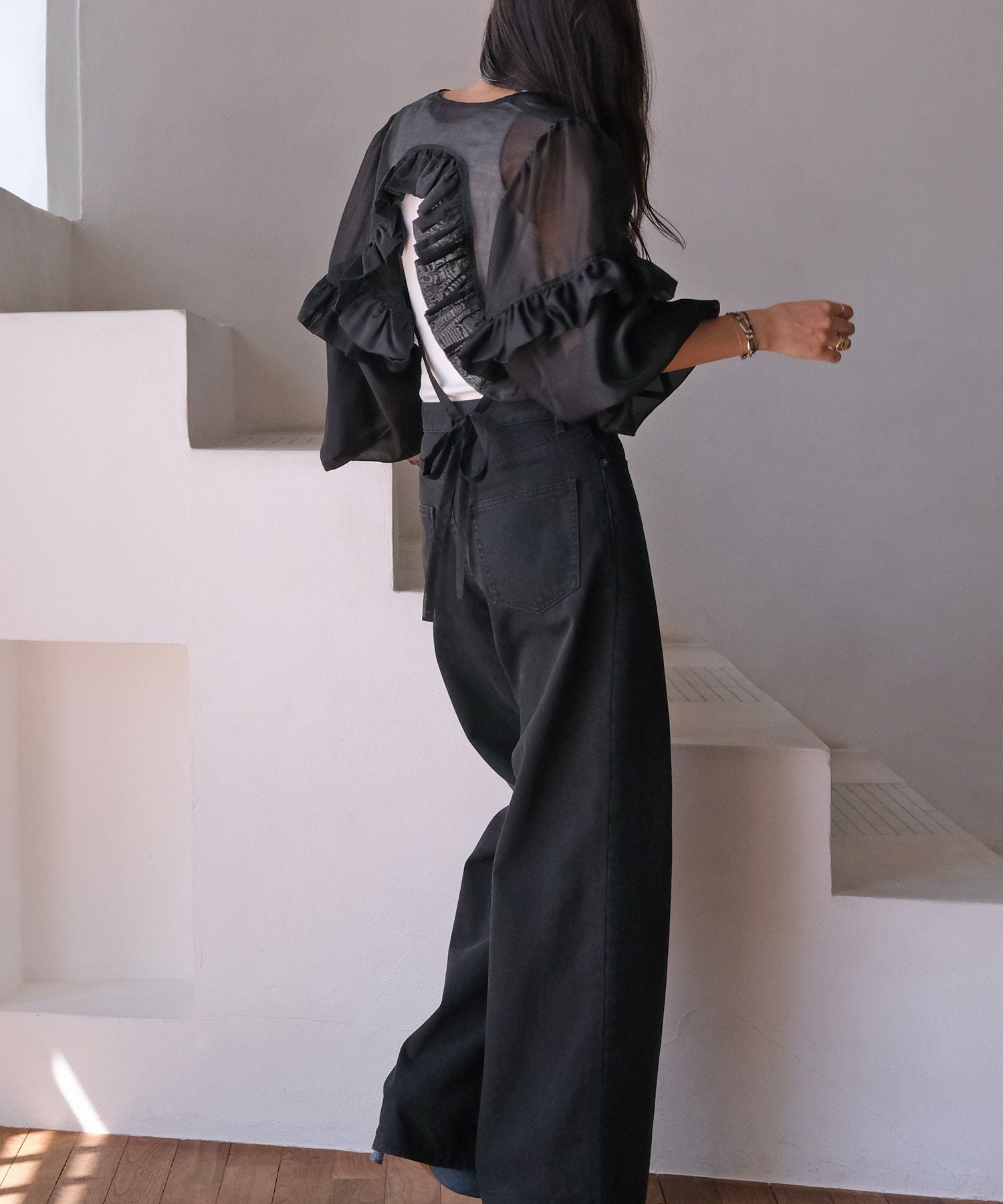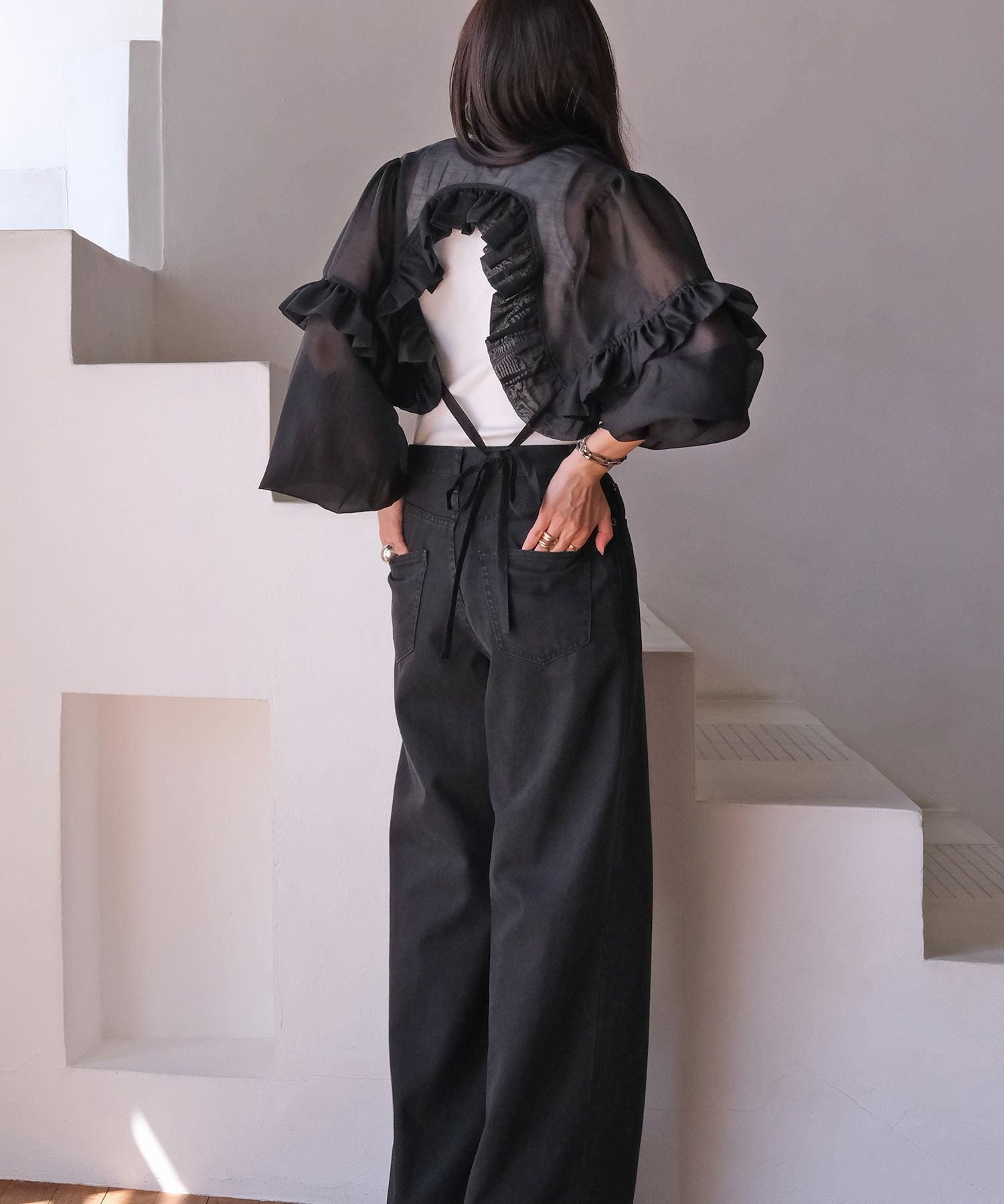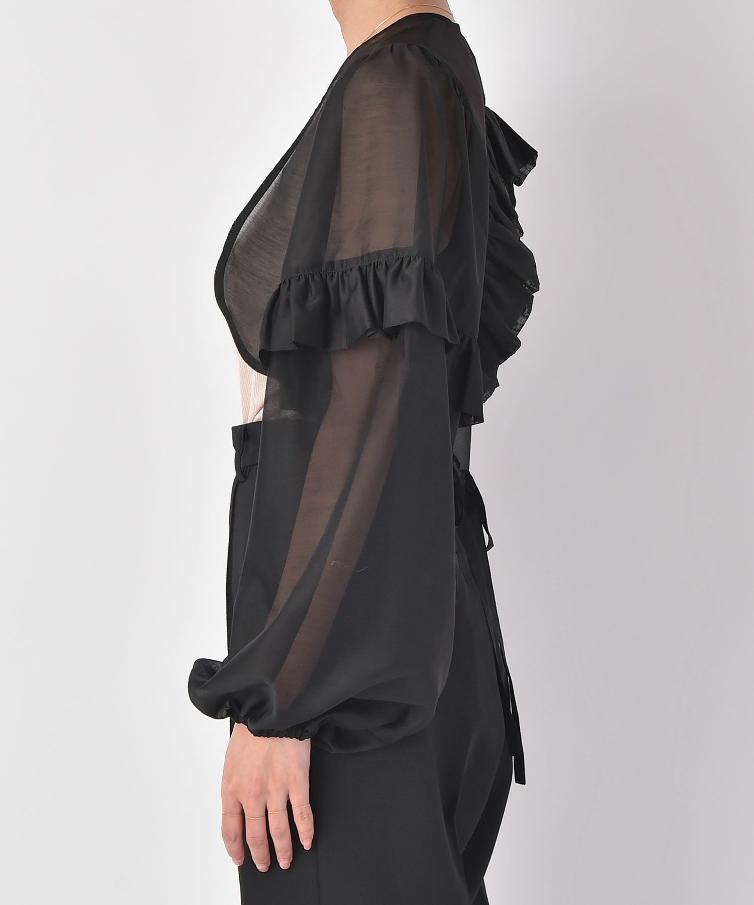 袖とバックに施したボリュームたっぷりなフリルとバルーンスリーブが、フェミニンな雰囲気を引き立てます。