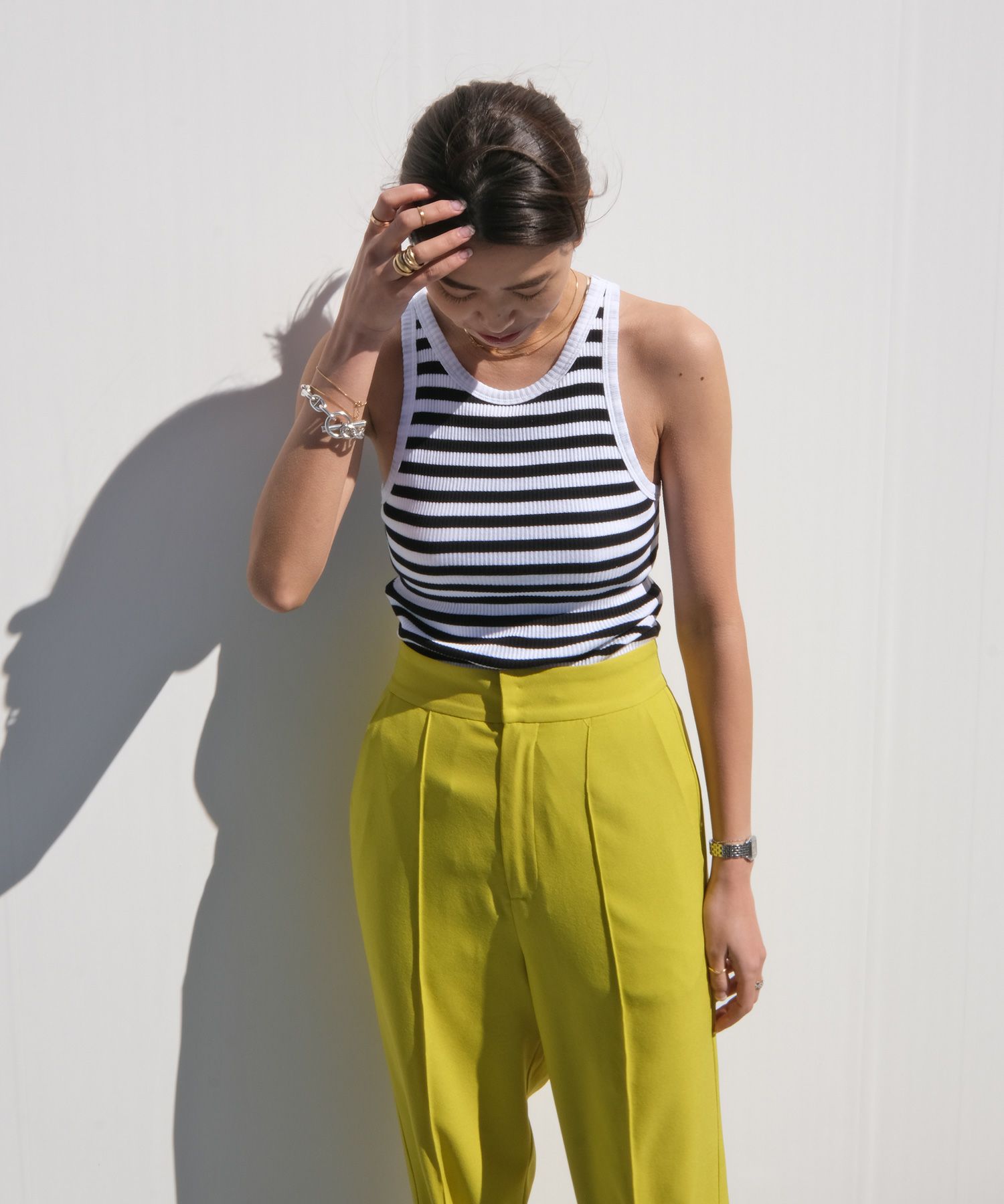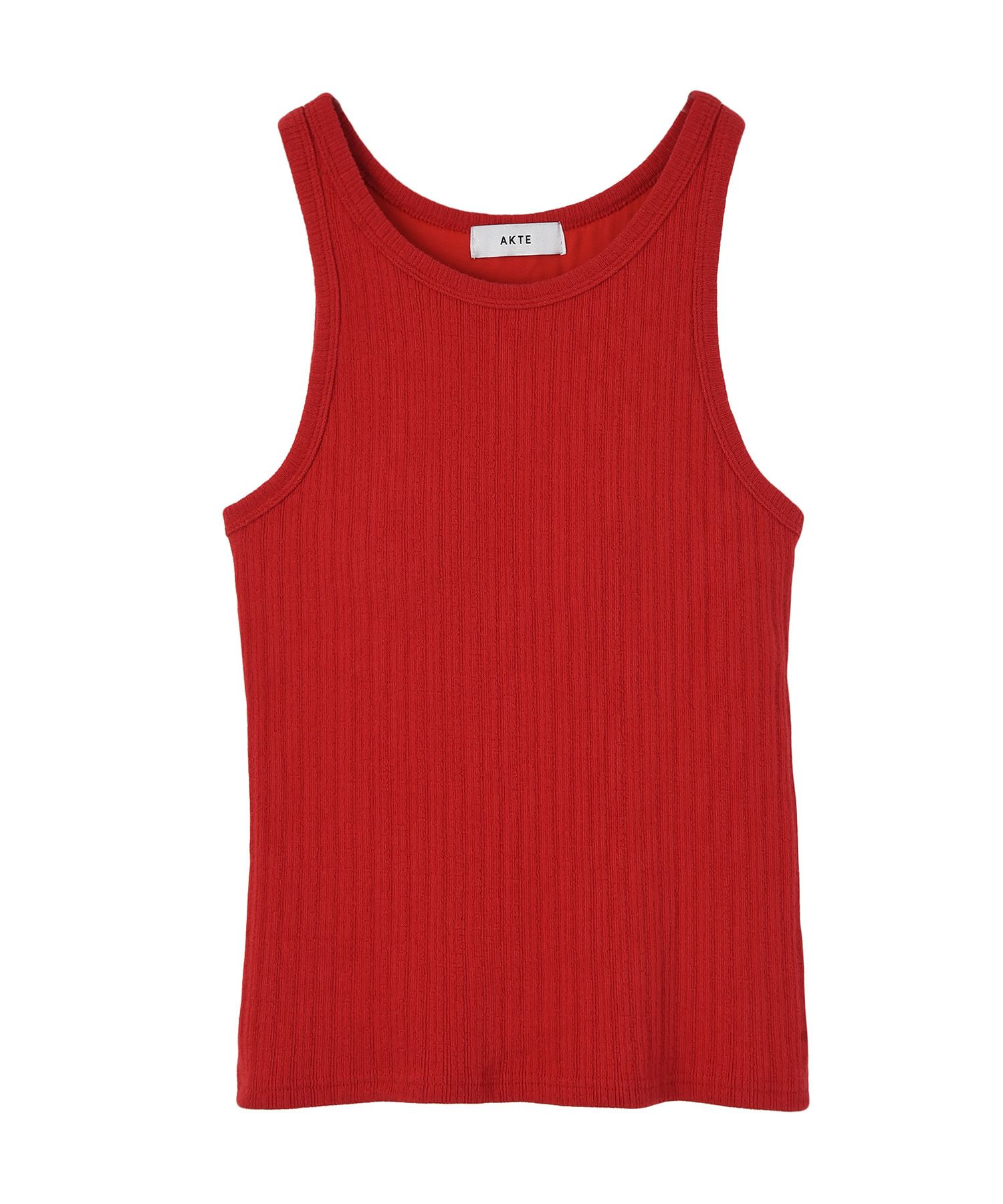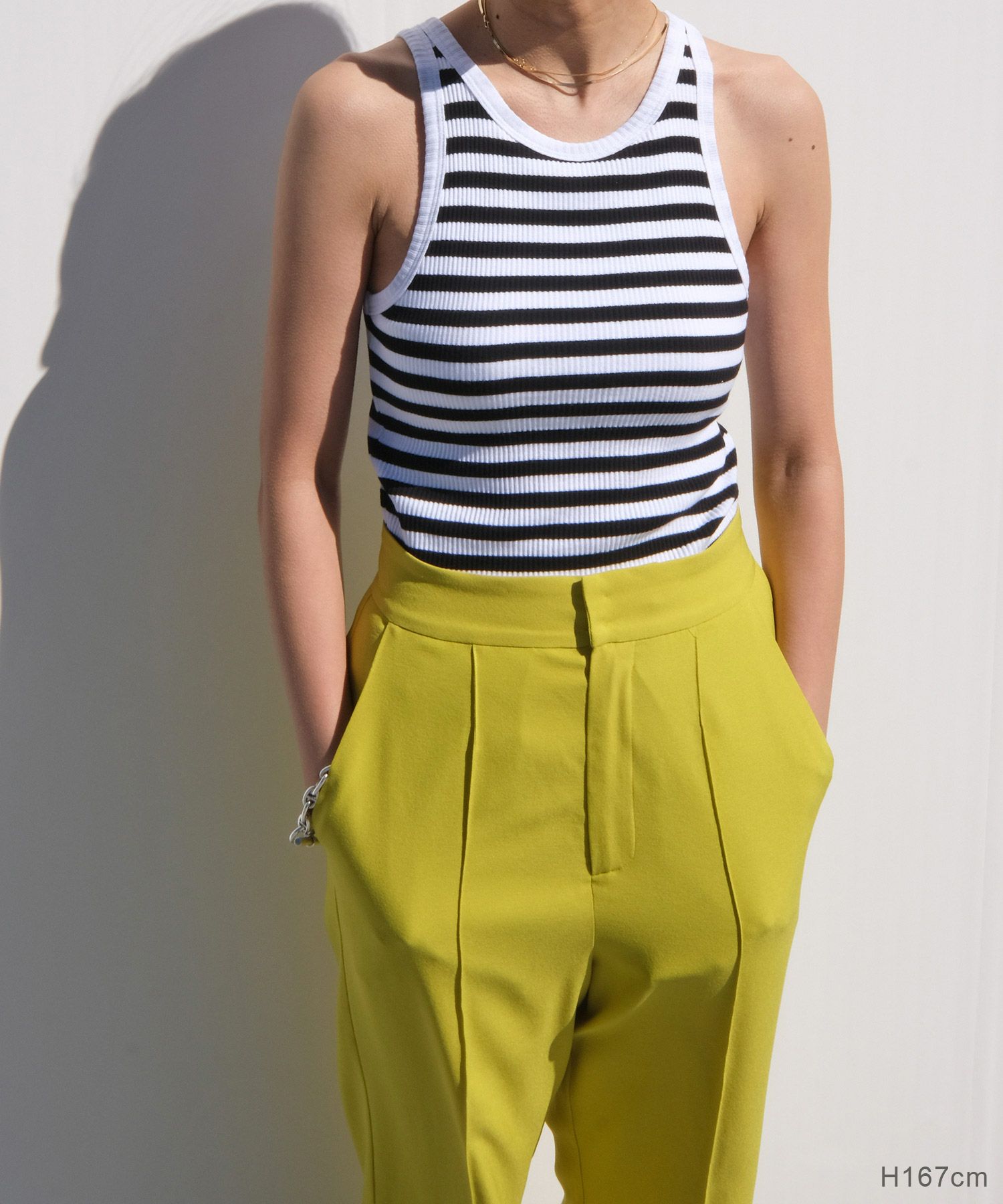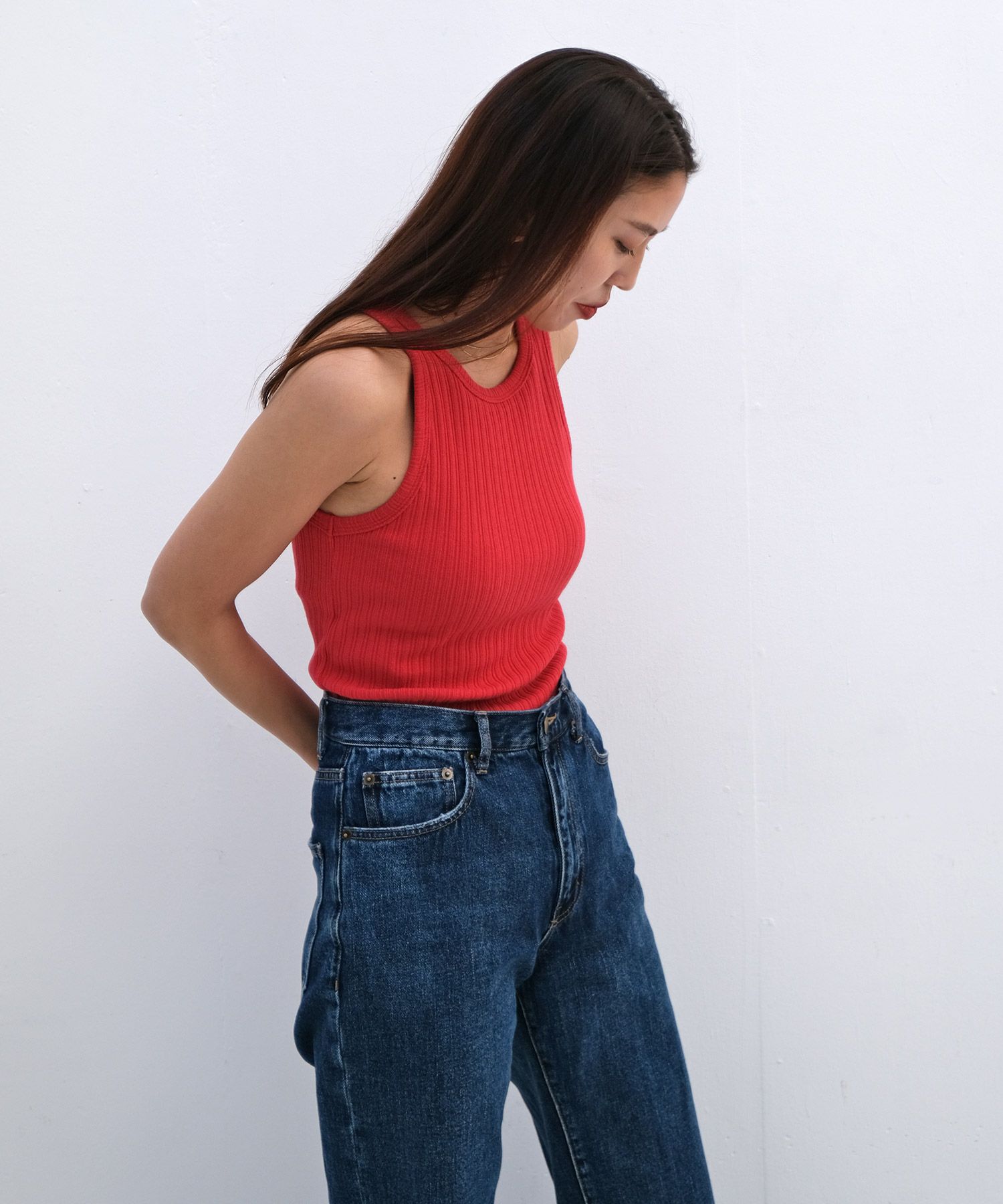 伸縮性に富んだリブ素材を使用し、ボディにソフトフィットすることで、すっきりとしたシルエットが女性らしくヘルシーな印象に。