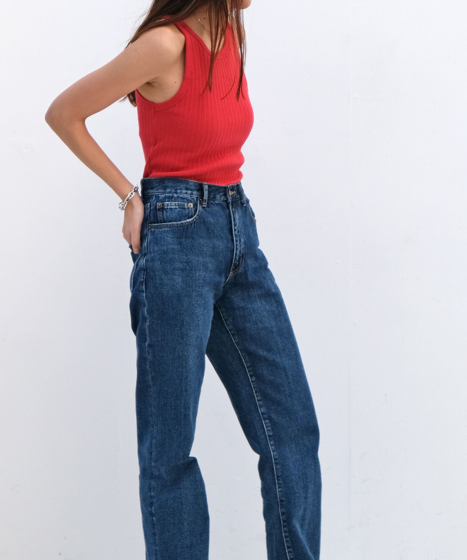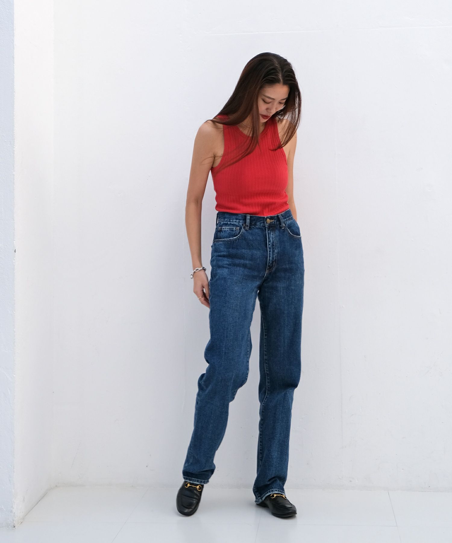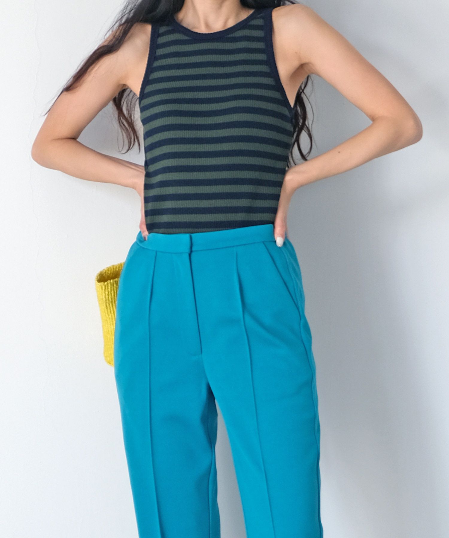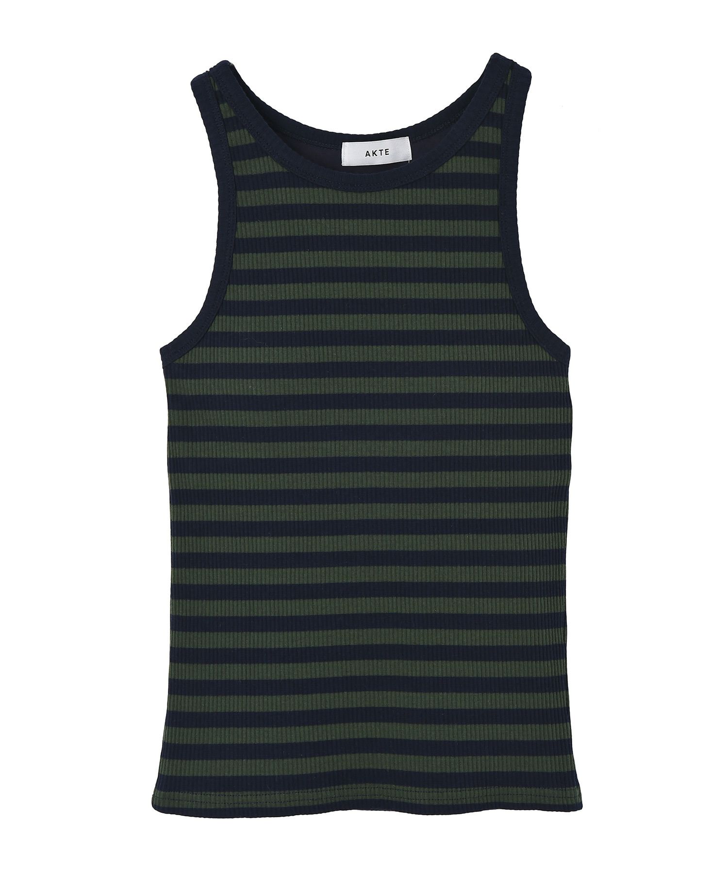 伸縮性に富んだリブ素材を使用し、ボディにソフトフィットすることで、すっきりとしたシルエットが女性らしくヘルシーな印象に。