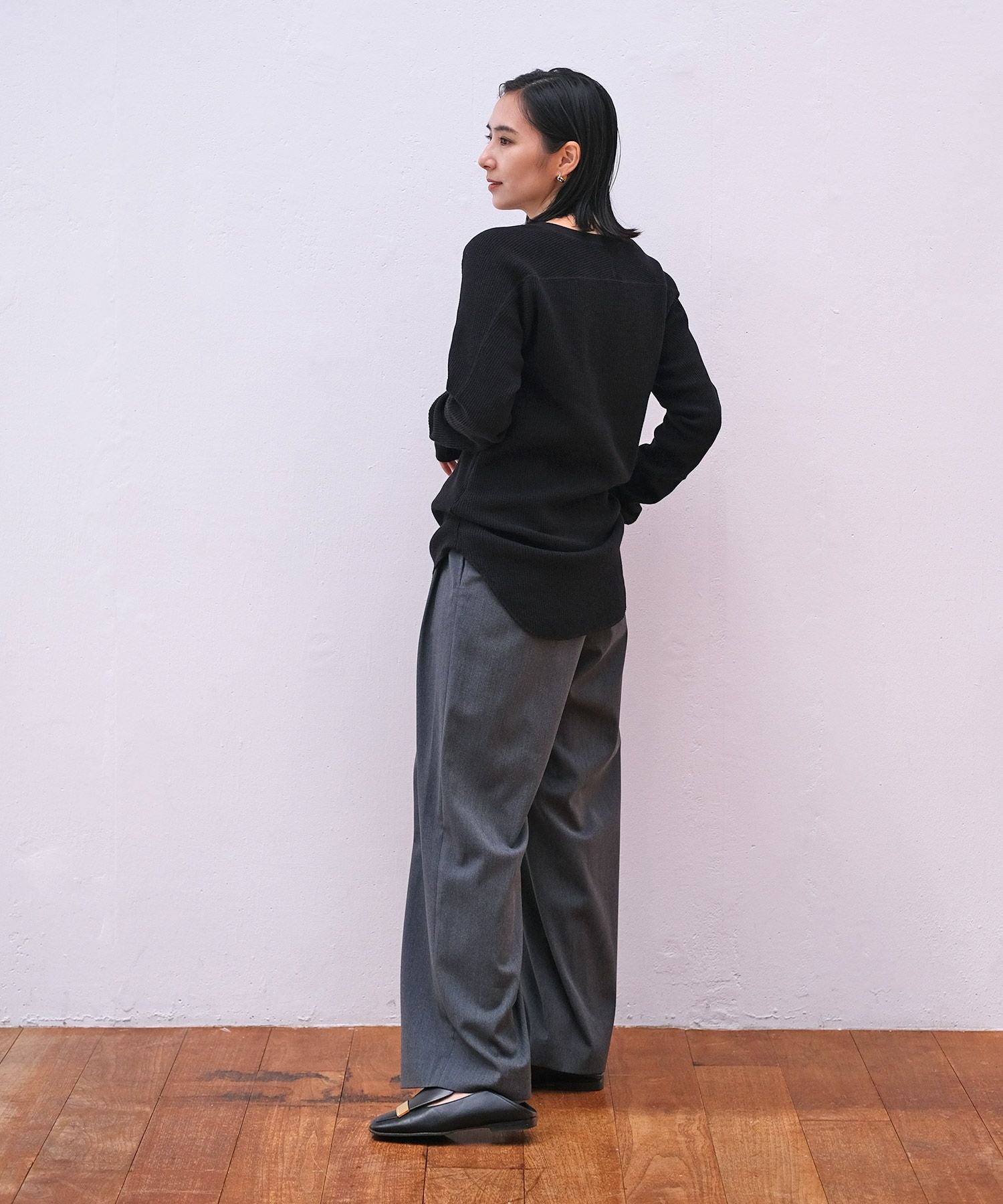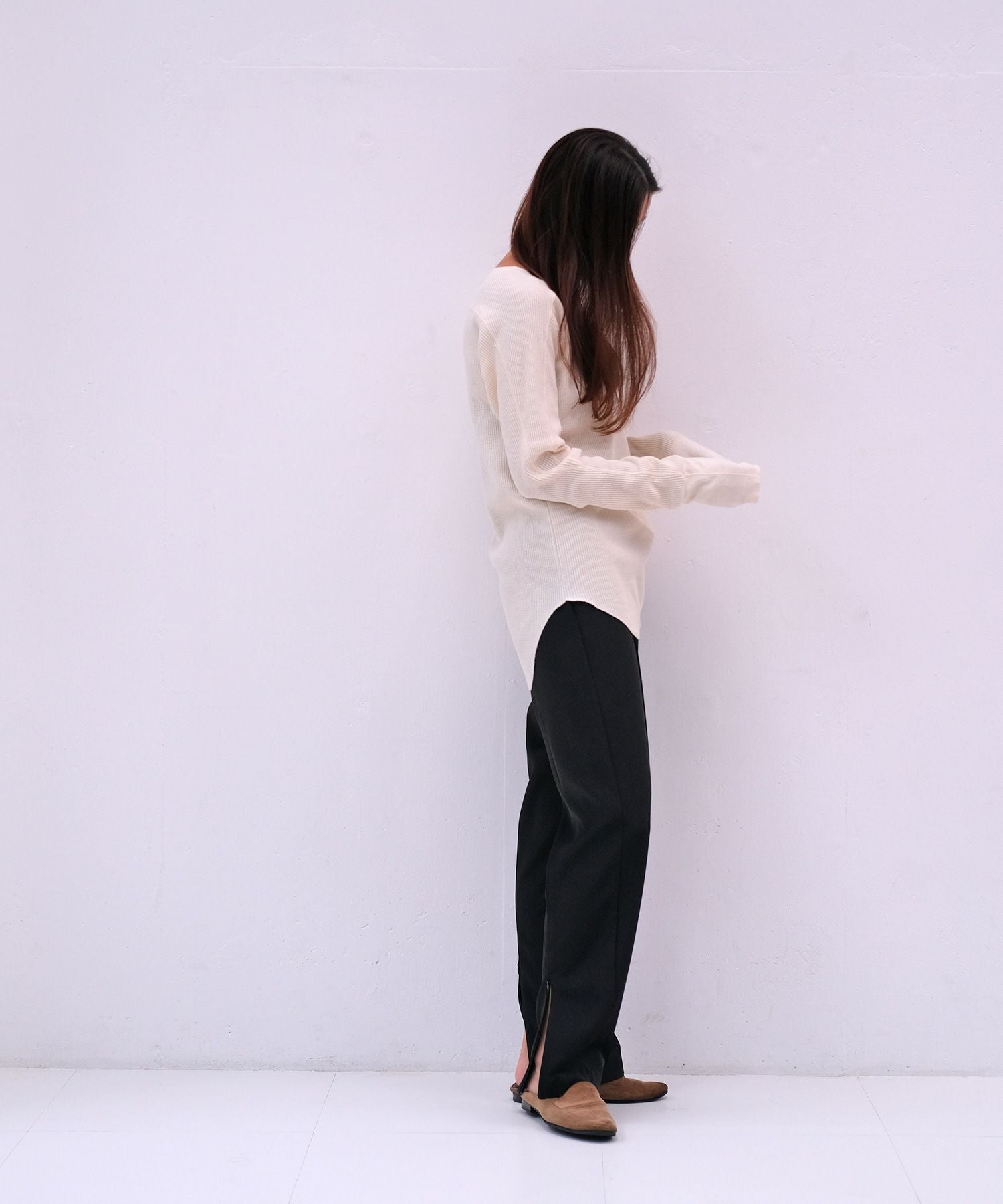 ジャケットやカーディガンのインナーとしても重宝し、ボトムスを選ぶことなく様々なスタイリングにお使いいただける定番アイテムです。