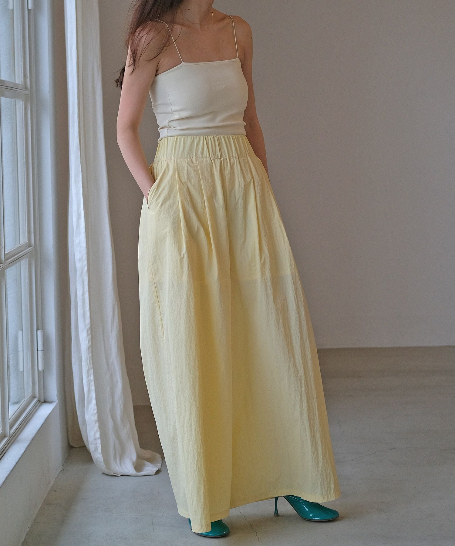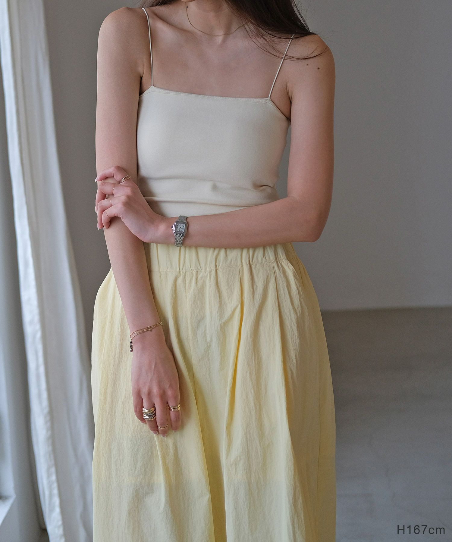 細めのストラップがデコルテや肩周りを華奢に見せ、女性らしさを感じる一枚。