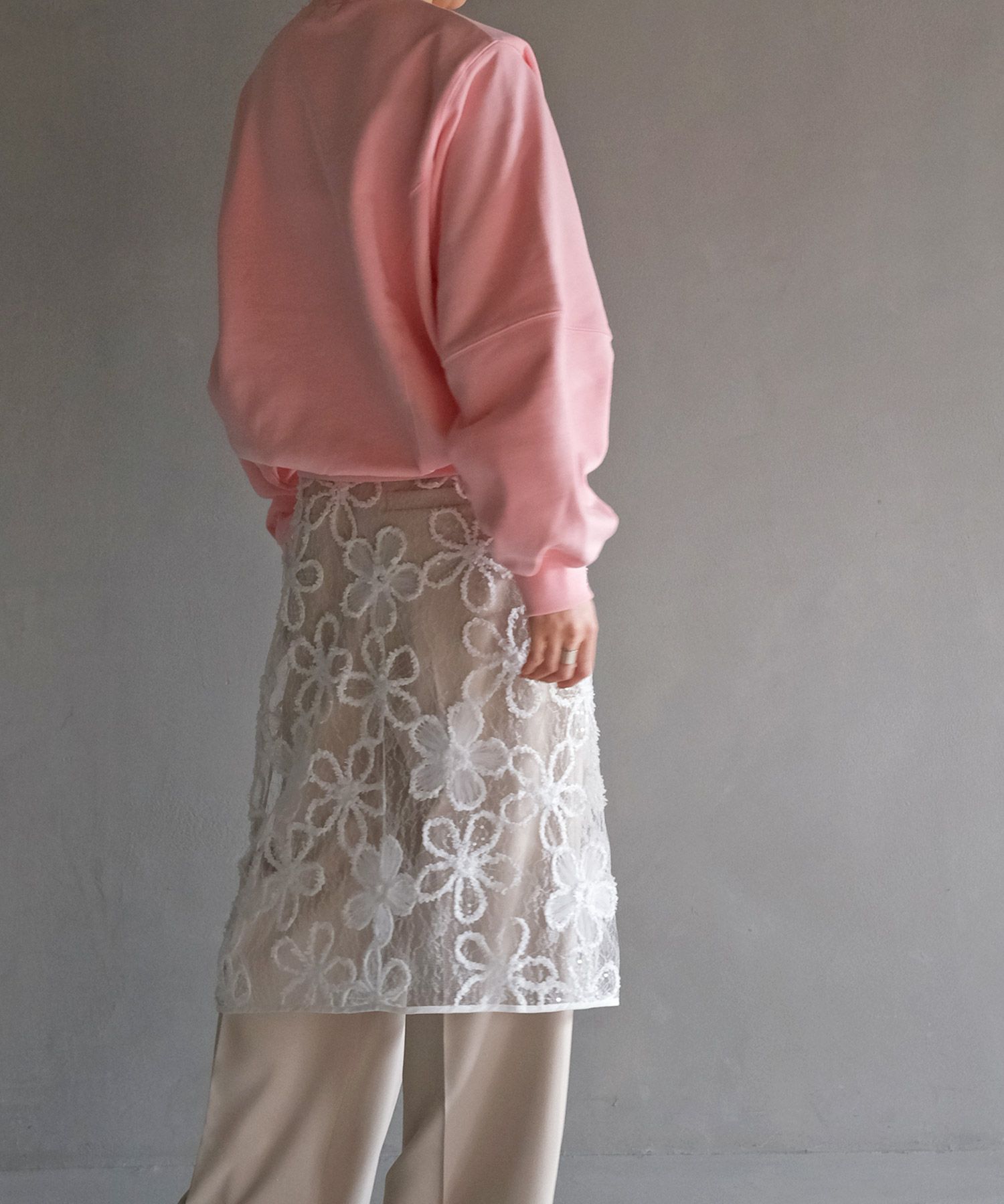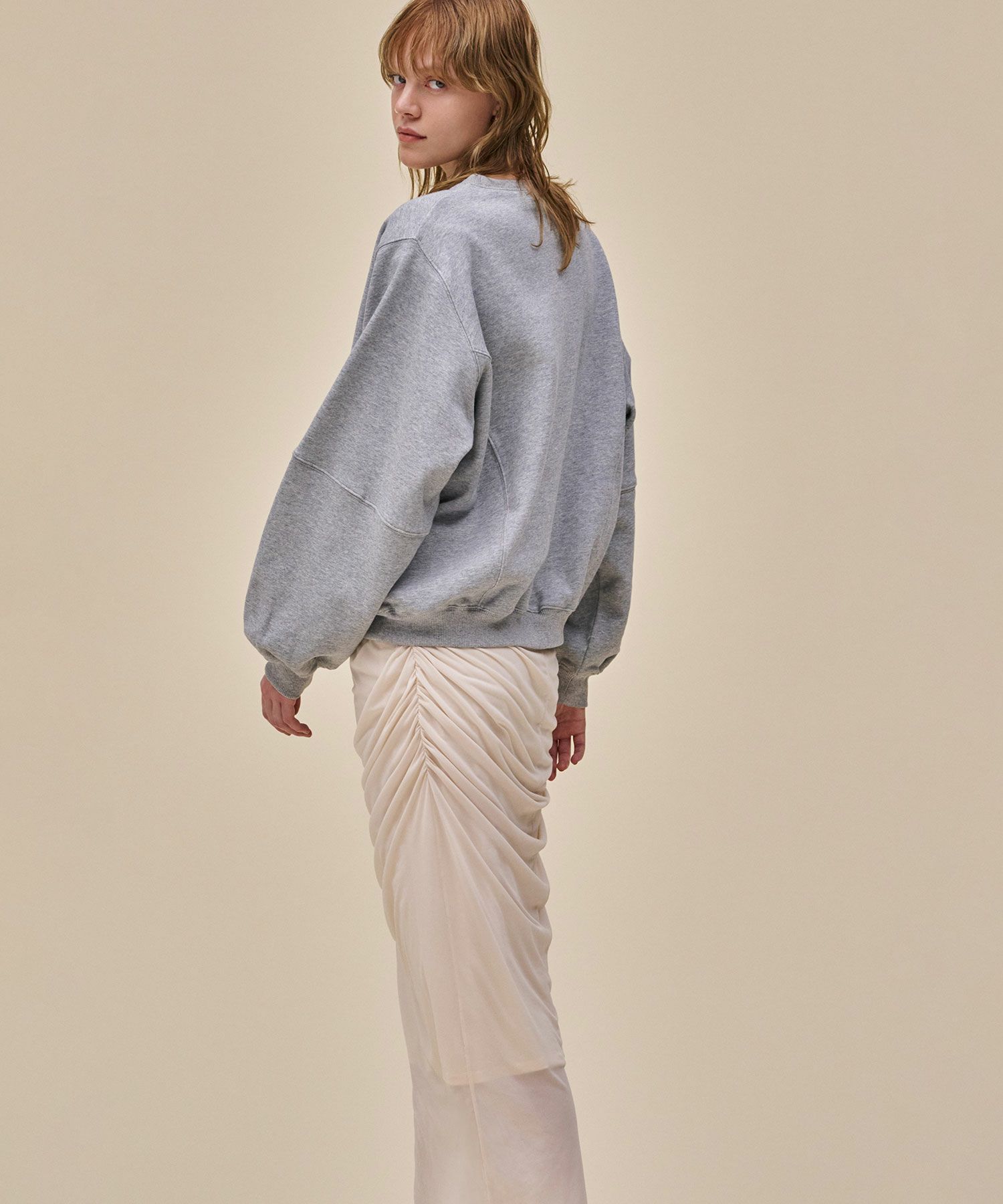 カジュアルなスウェットに取り外し可能な肩パッドを入れることでシルエットに変化が生まれ、ラフになりすぎない見え感に。