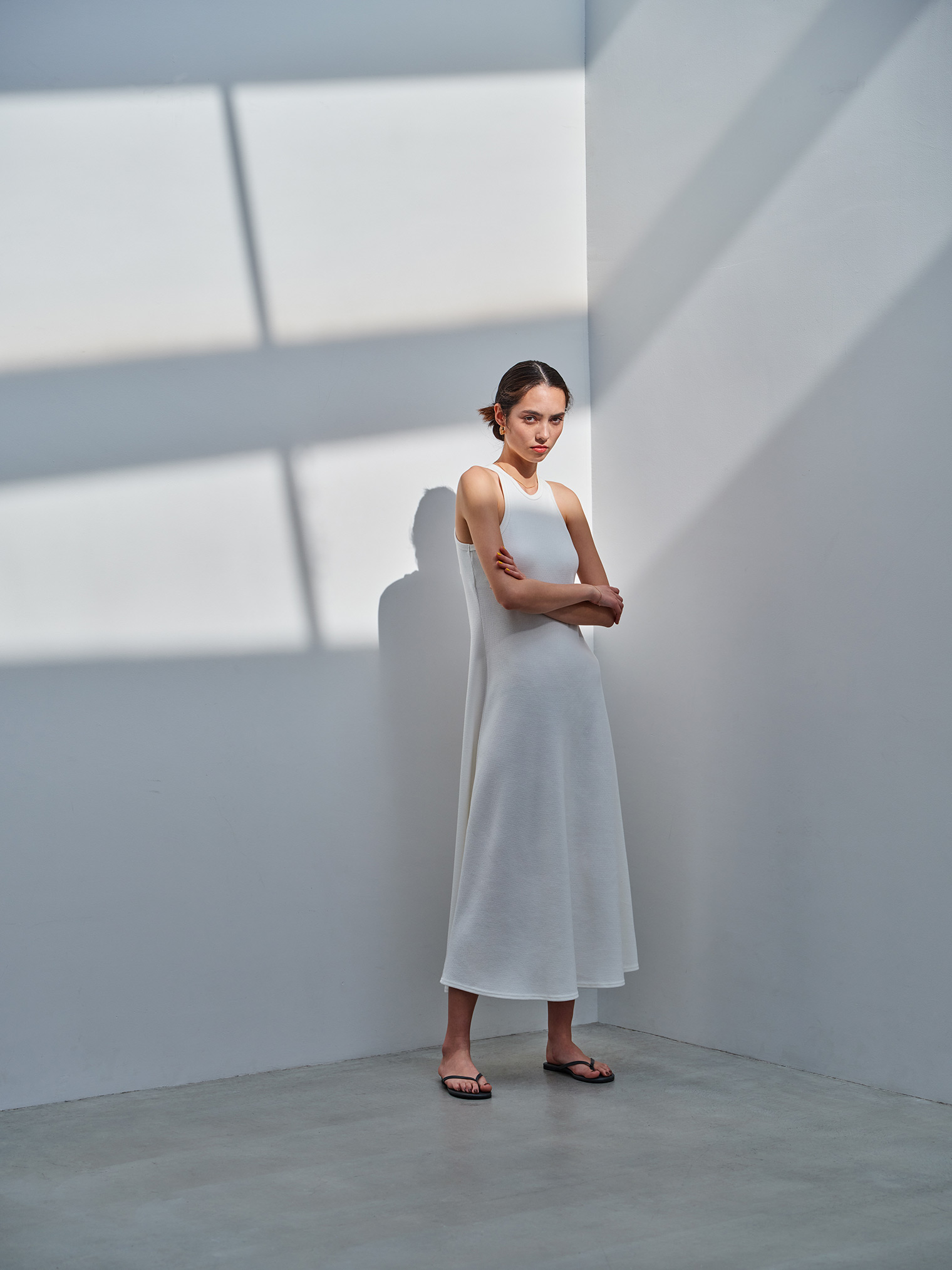 スリーブレスAラインドレス ¥16,500 (tax in) メタルサークルピアス ¥3,300 (tax in) 【eleve rire】K18ベネチアンチェーンネックレス38 ¥41,800 (tax in) 【eleve rire】K18ベネチアンチェーンブレスレット ¥33,000 (tax in) ベーシックビーチサンダル ¥6,930 (tax in)