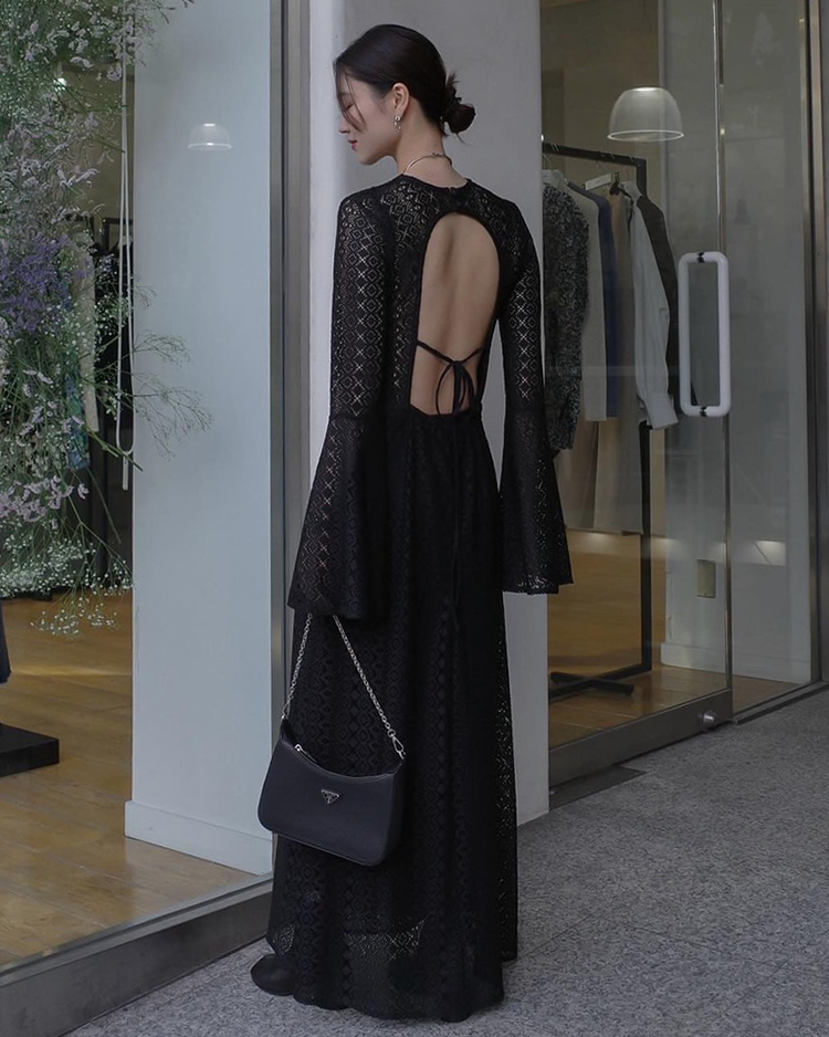 オープンバックフレアスリーブレースワンピース